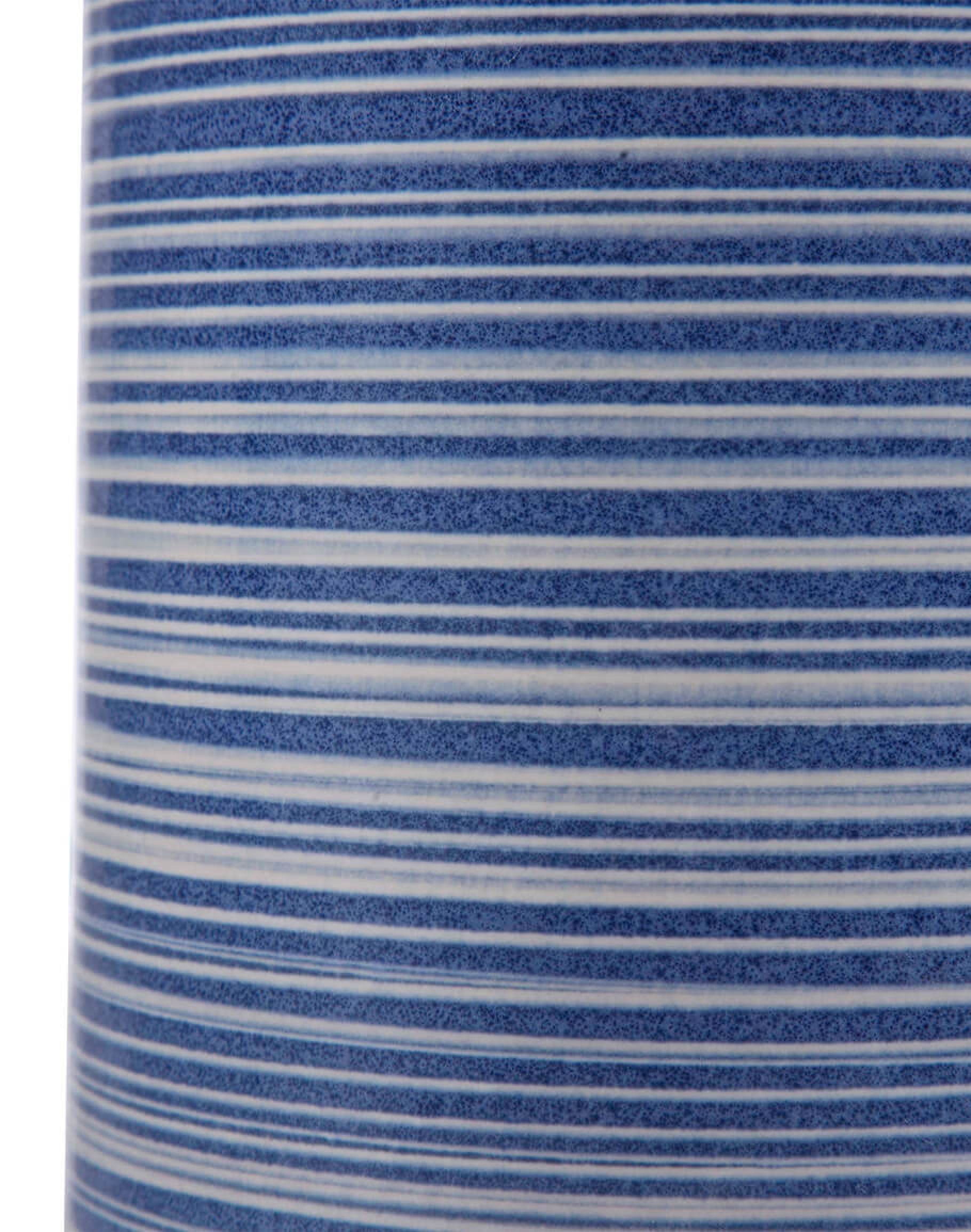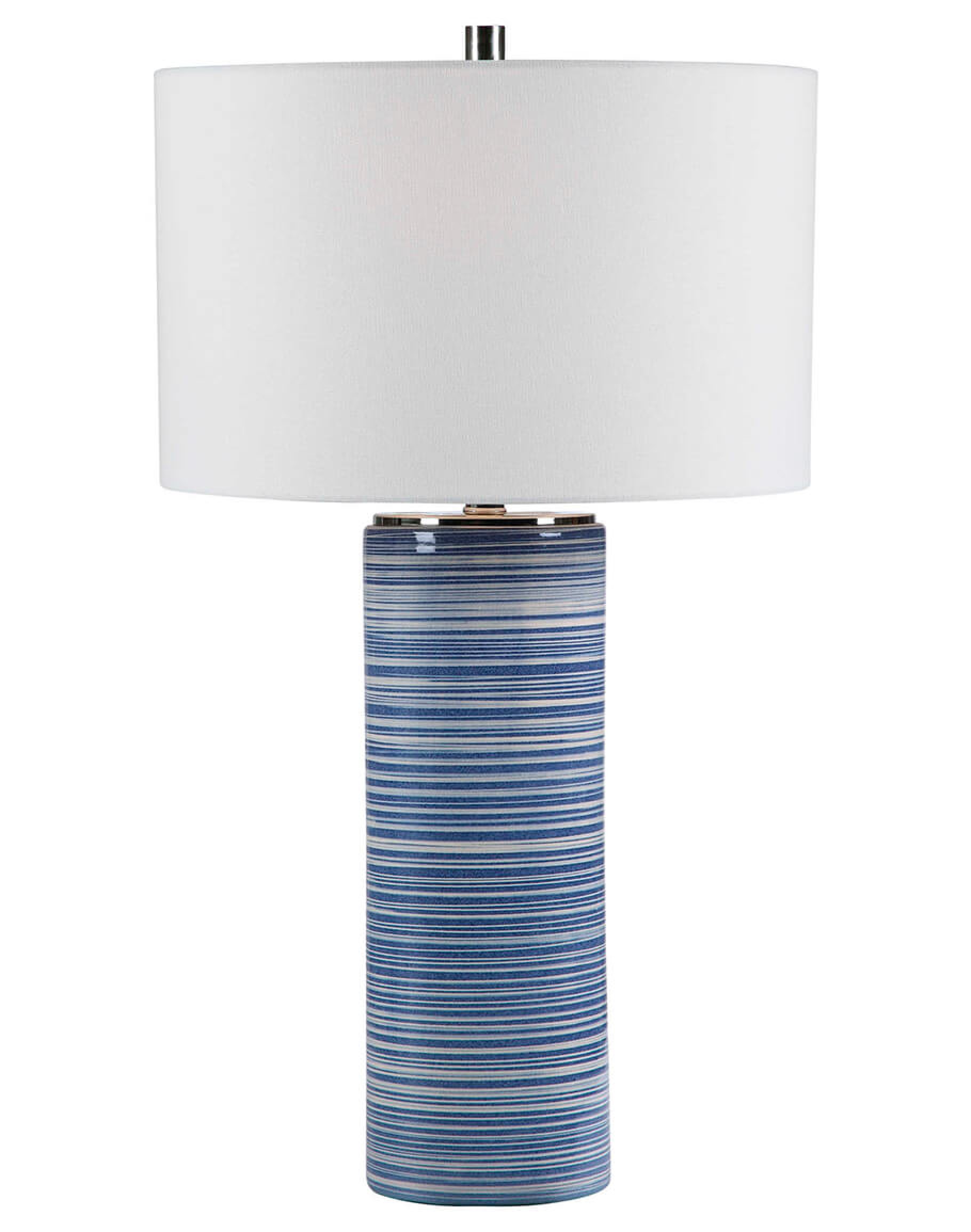 Showcasing trendy white and indigo hues, this ceramic table lamp has a striped glaze with polished nickel accents. The round hardback drum shade is a white linen fabric.