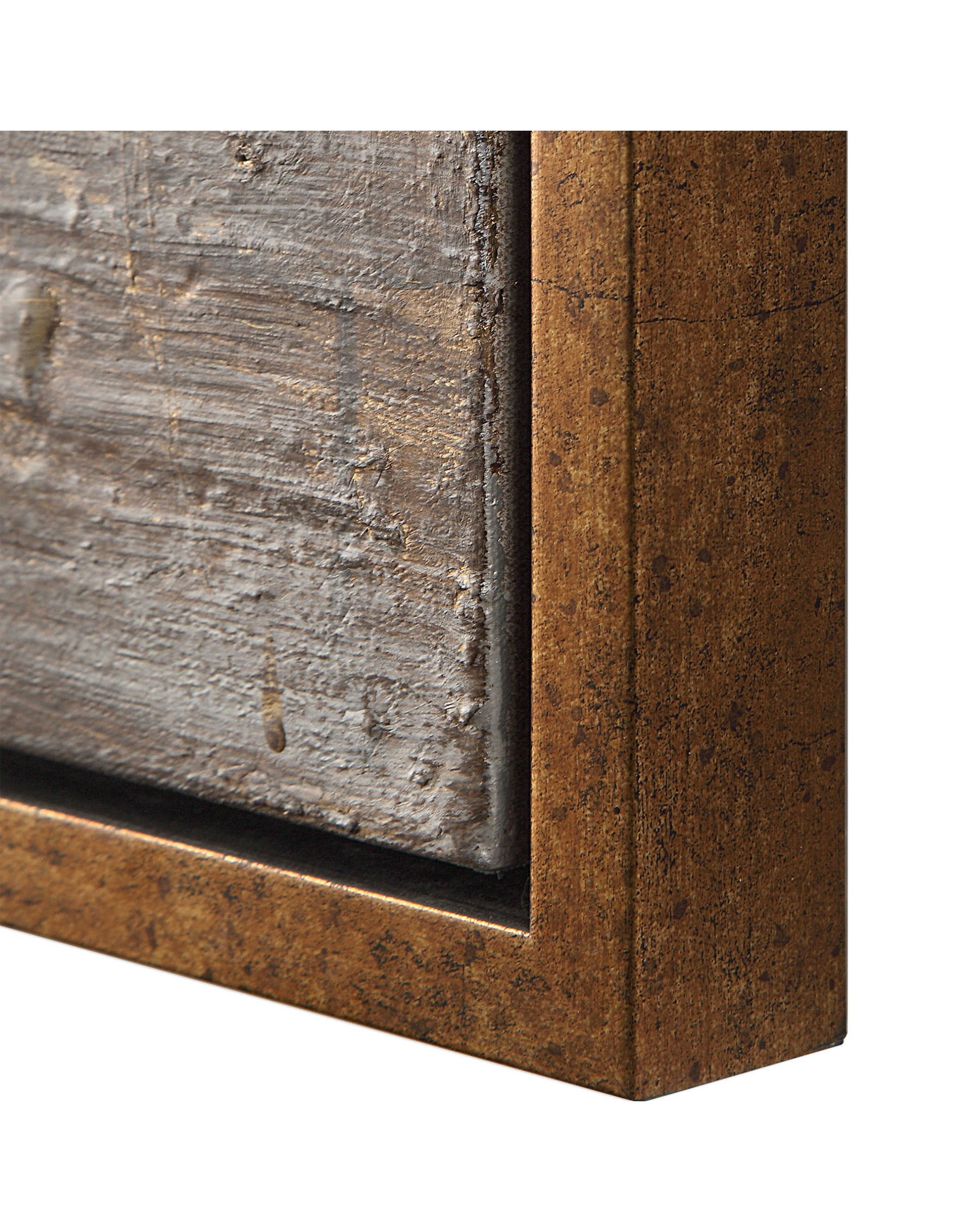 Contemporary style emanates from this hand painted abstract on canvas. This sophisticated, landscape art is lightly textured in mottled shades of gold, brown, black, gray, white, slate blue, and olive green. A copper-bronze gallery frame completes this artwork. Due to the handcrafted nature of this artwork, each piece may have subtle differences.