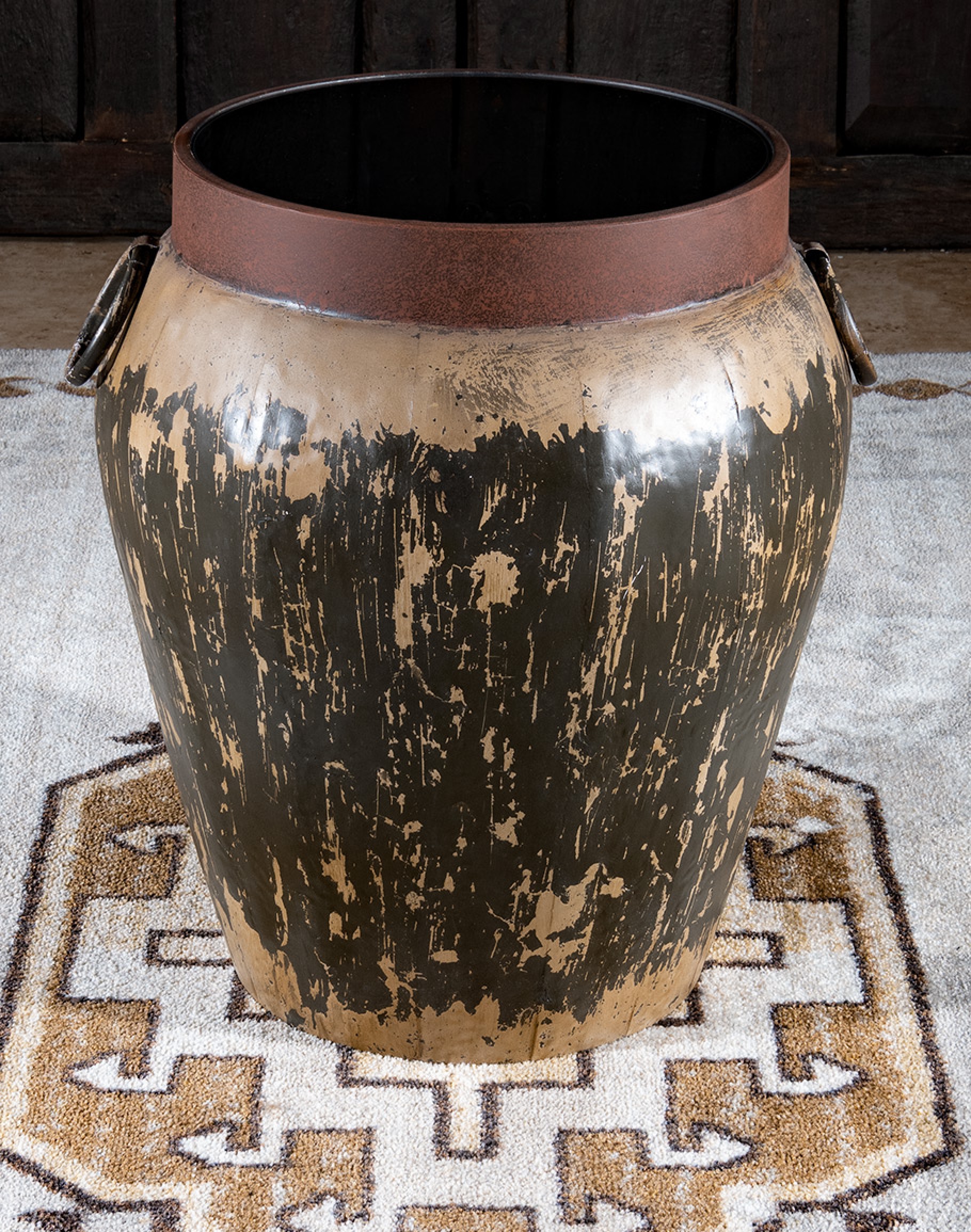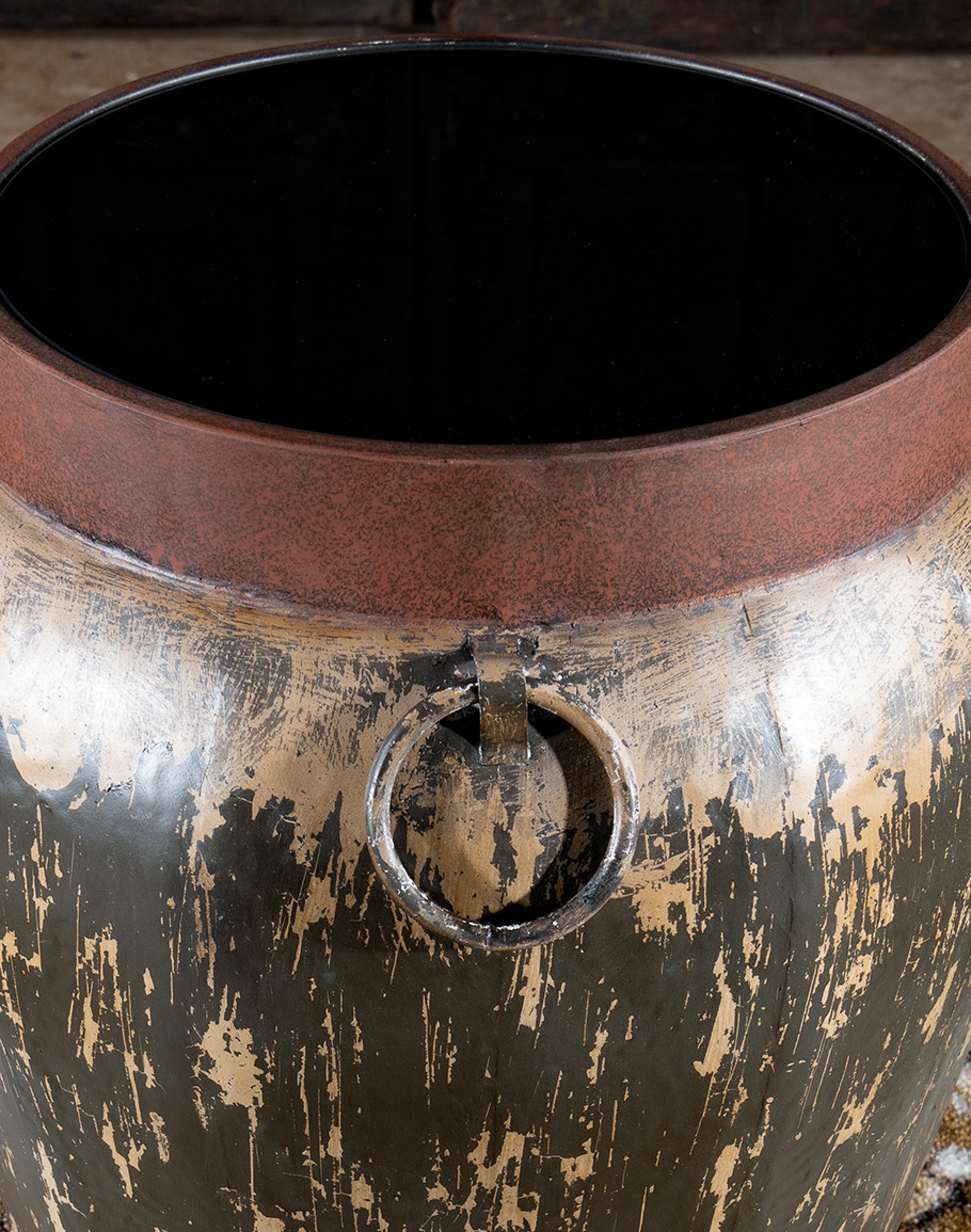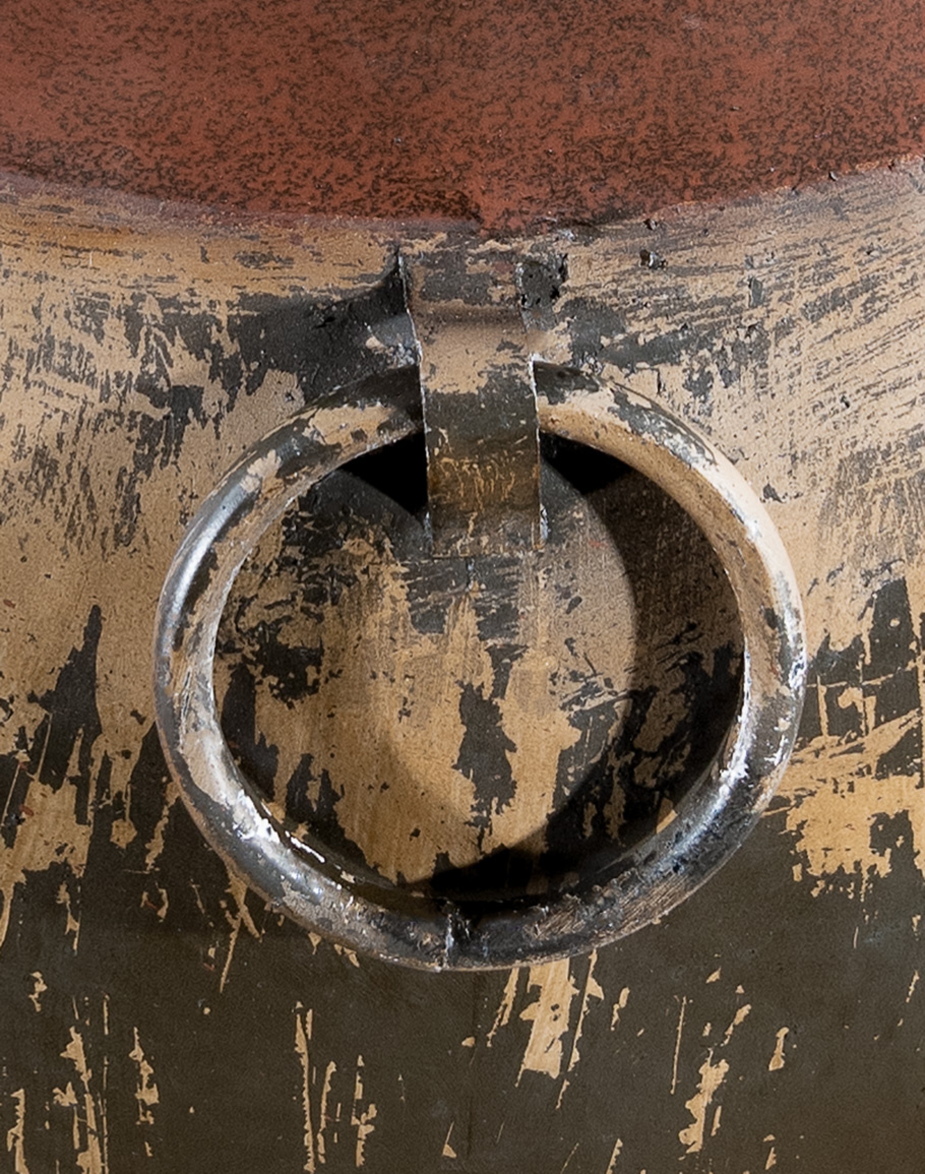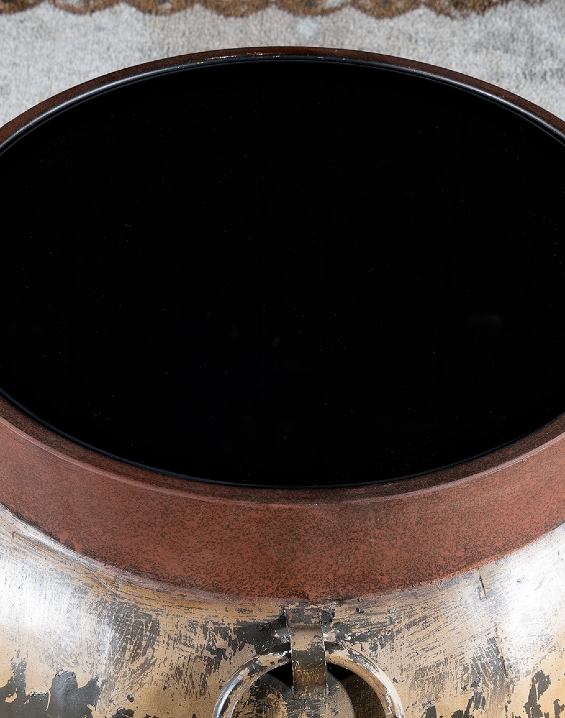 With the essence of an antique piece, this metal drum table features a heavily aged rustic finish in brown and ivory tones, with a rust brown top inset with black glass, and accented with iron ring pulls.