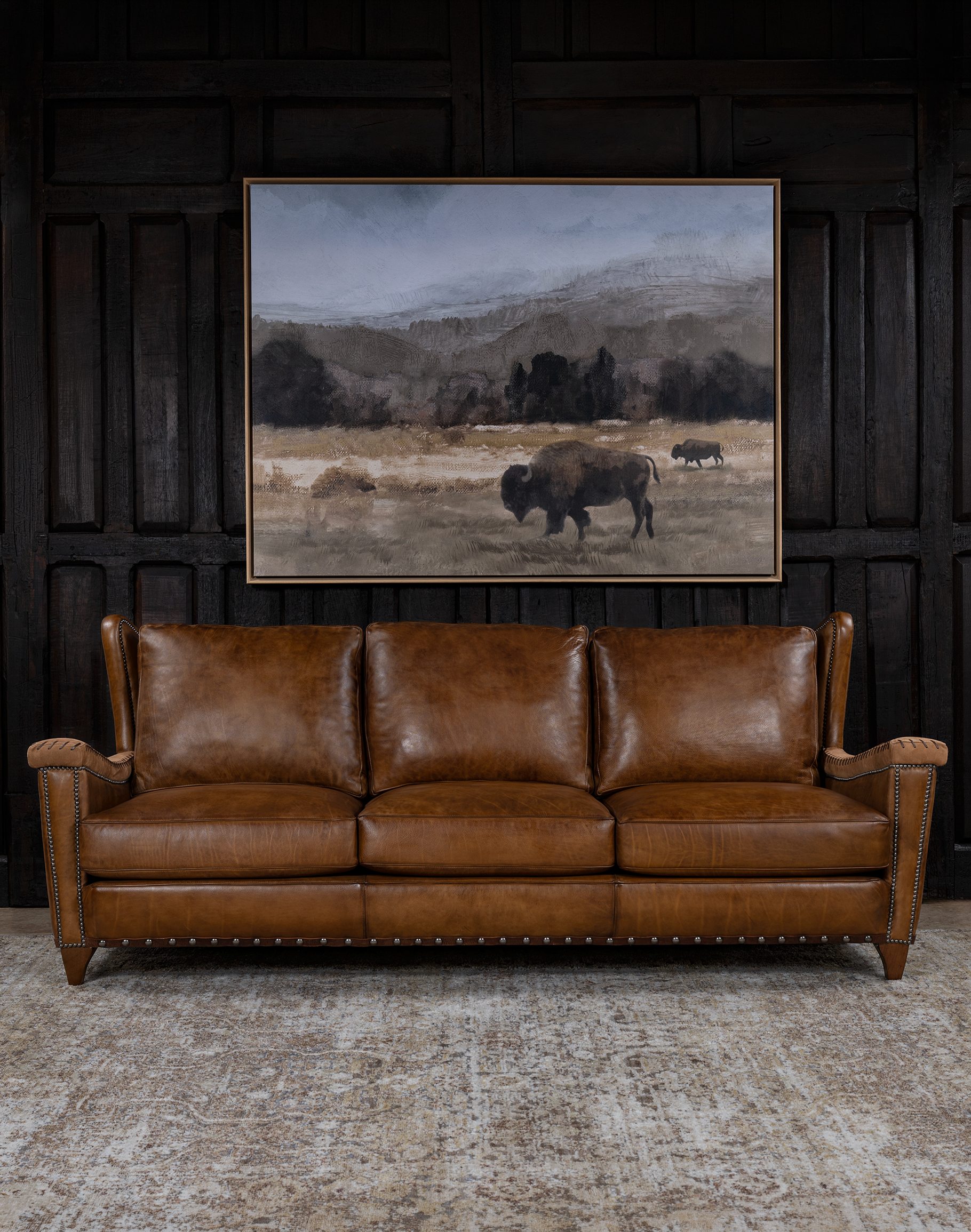 Handmade in the USA to the highest standards of quality and craftsmanship, our classic ranch Nordic Leather Sofa is made by the best for those who demand the best. With its sleek lines and minimalist aesthetic, the Nordic Leather Sofa is an iconic addition to any interior mountain and eclectic ranch design scheme. Its clean silhouette draws inspiration from the simplicity and functionality of Nordic style while providing the luxury and durability of American, 8-way hand-tied craftsmanship. Ideal for a cozy retreat, a sophisticated living room, or an elegant study, this full-grain leather sofa serves as a comfortable seating option and a statement piece. Its sturdy construction and timeless design ensure that it is not just furniture but an investment in your home’s comfort and style. At Adobe Interiors, we create the furniture, and you create the memories.