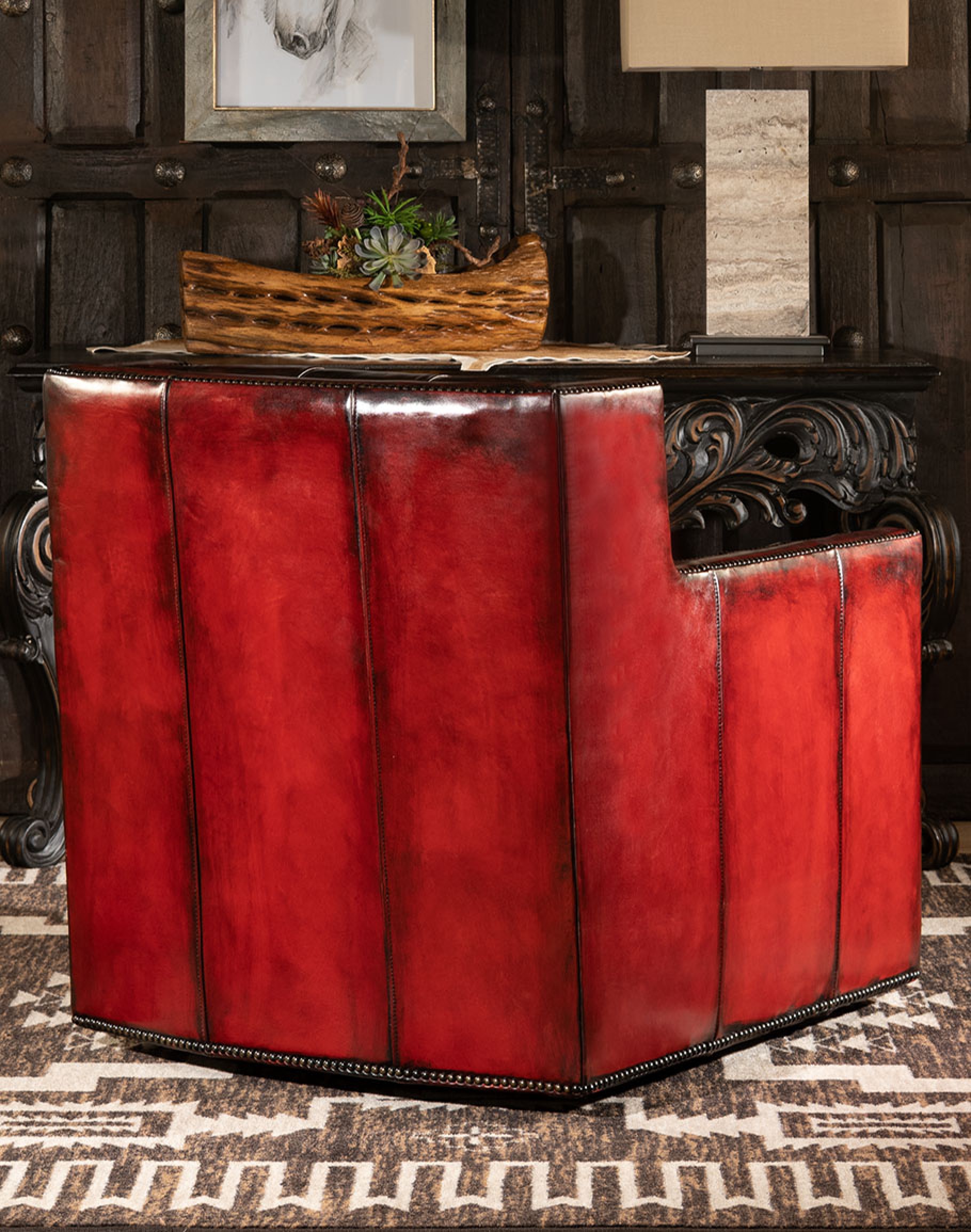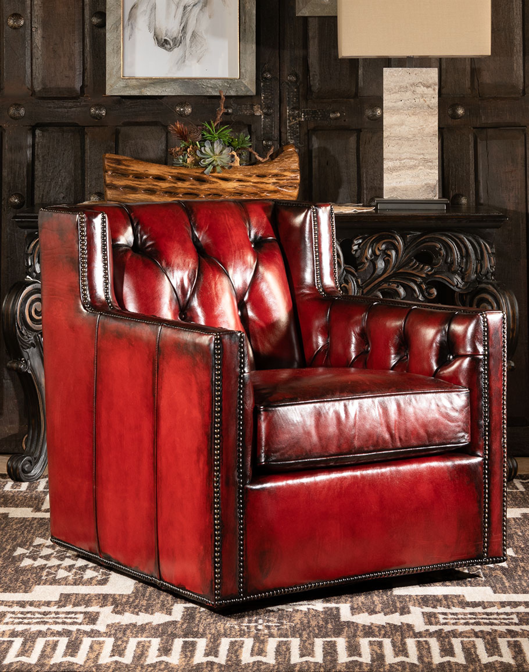 Vibrant red hand burnished leather accented with brass nail heads makes the Oakley Red Leather Swivel Chair a fine addition to any home. This classy piece of furniture boasts a luxurious red hand burnished leather complimented by a deep tufted inside seat back and inside arms. Our Oakley Red Leather Swivel Chair is one of the most stunning examples of a rustic elegant chair design.