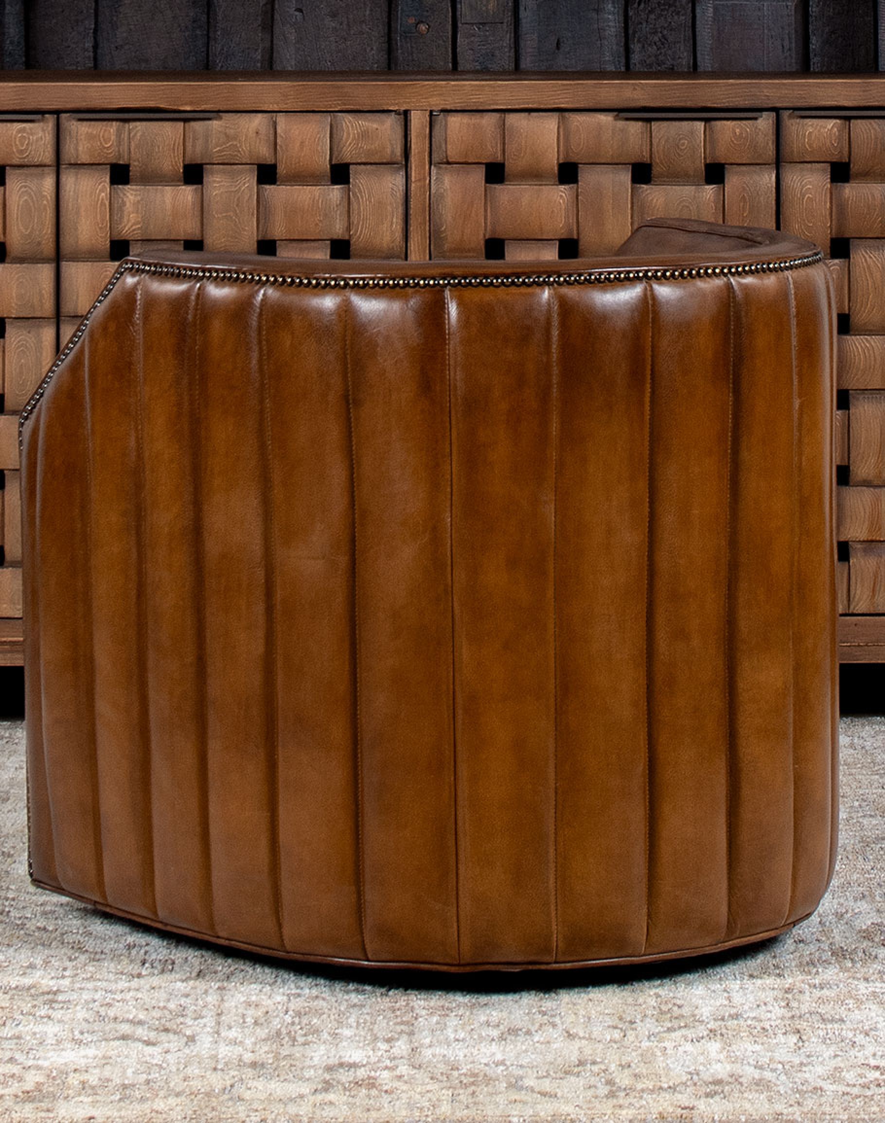 The Oliver boasts intricate hand-burnished details that tell a story of fine craftsmanship and refined aesthetics. The earthy color makes it a perfect addition to the Desert Ranch collection. The chair’s low profile and clean lines perfectly suit modern and Refined Ranch interiors. Its subtle design seamlessly integrates with any room's decor while remaining a standout piece. The outside back showcases pocketed channels sewn meticulously in a vertical pattern, adding a touch of contemporary elegance and a tactile dimension to its silhouette. Proudly 100% American-made, the Oliver Swivel Chair adheres to the highest quality standards. Delve deeper, and its 8-way hand-tied construction methods reveal an unmatched dedication to durability and excellence.