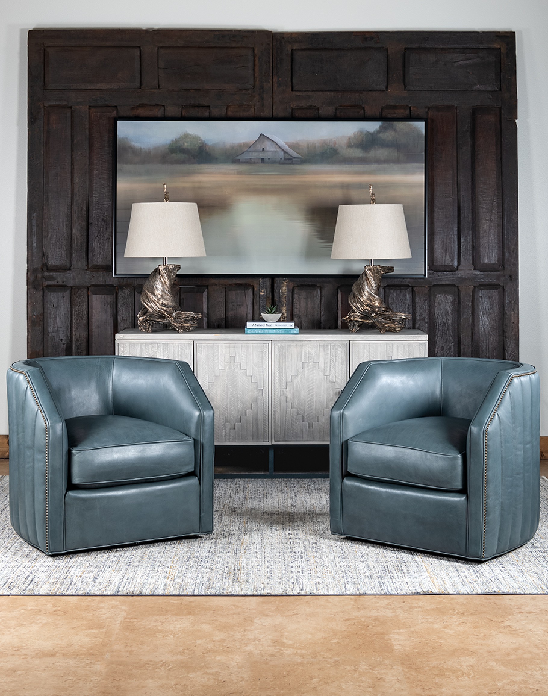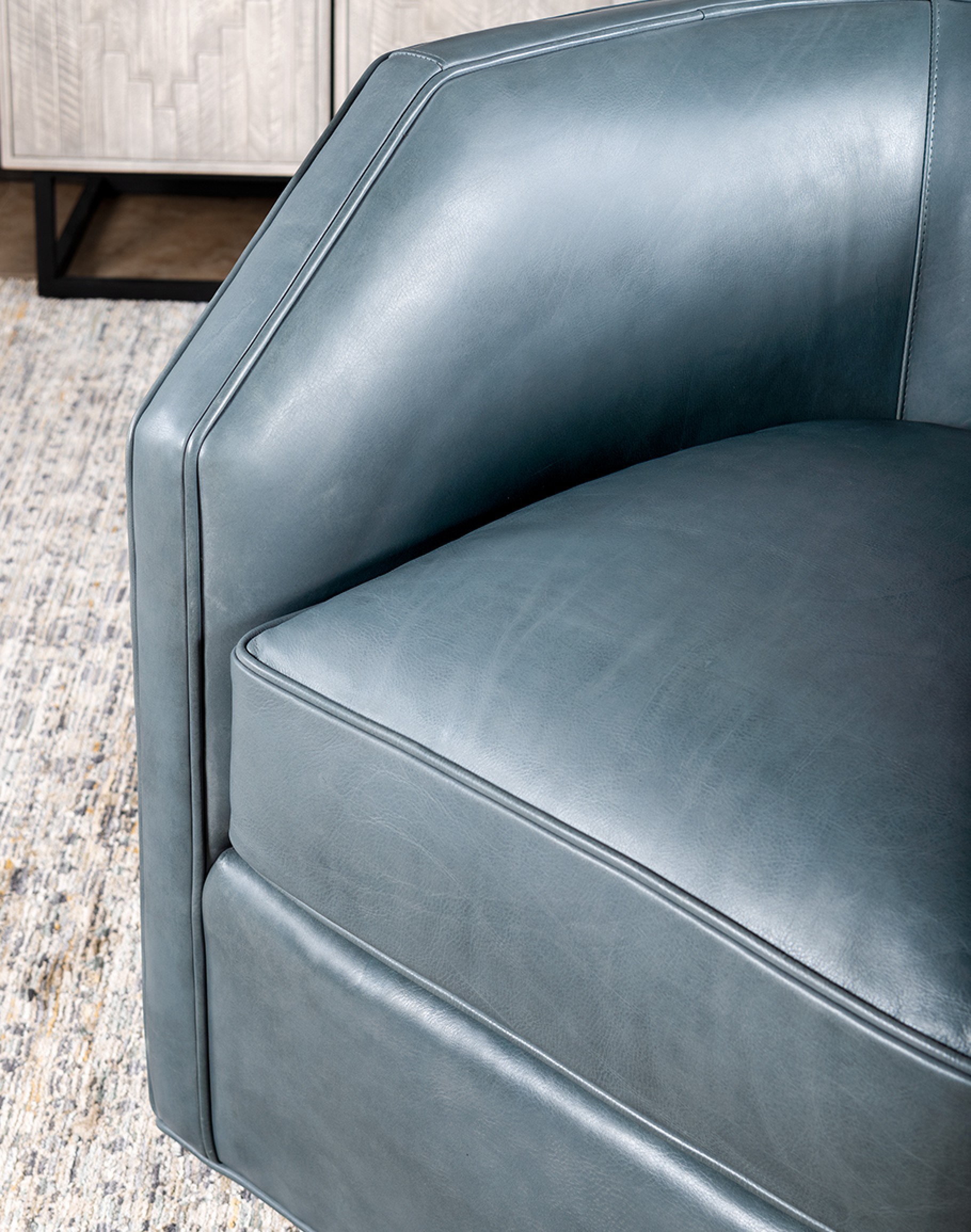 Introducing the Oliver Sky Leather Swivel Chair, an exquisite addition to Adobe Interiors' Coastal Ranch Collection. This luxurious barrel chair is meticulously crafted in the USA, embodying the pinnacle of quality and craftsmanship. Constructed with a robust hardwood frame and featuring 8-way hand-tied construction methods, the Oliver Sky Leather Swivel Chair promises unmatched durability and comfort. The chair's full-grain leather upholstery, showcased in a sophisticated slate blue hue, adds a touch of elegance to any interior.
