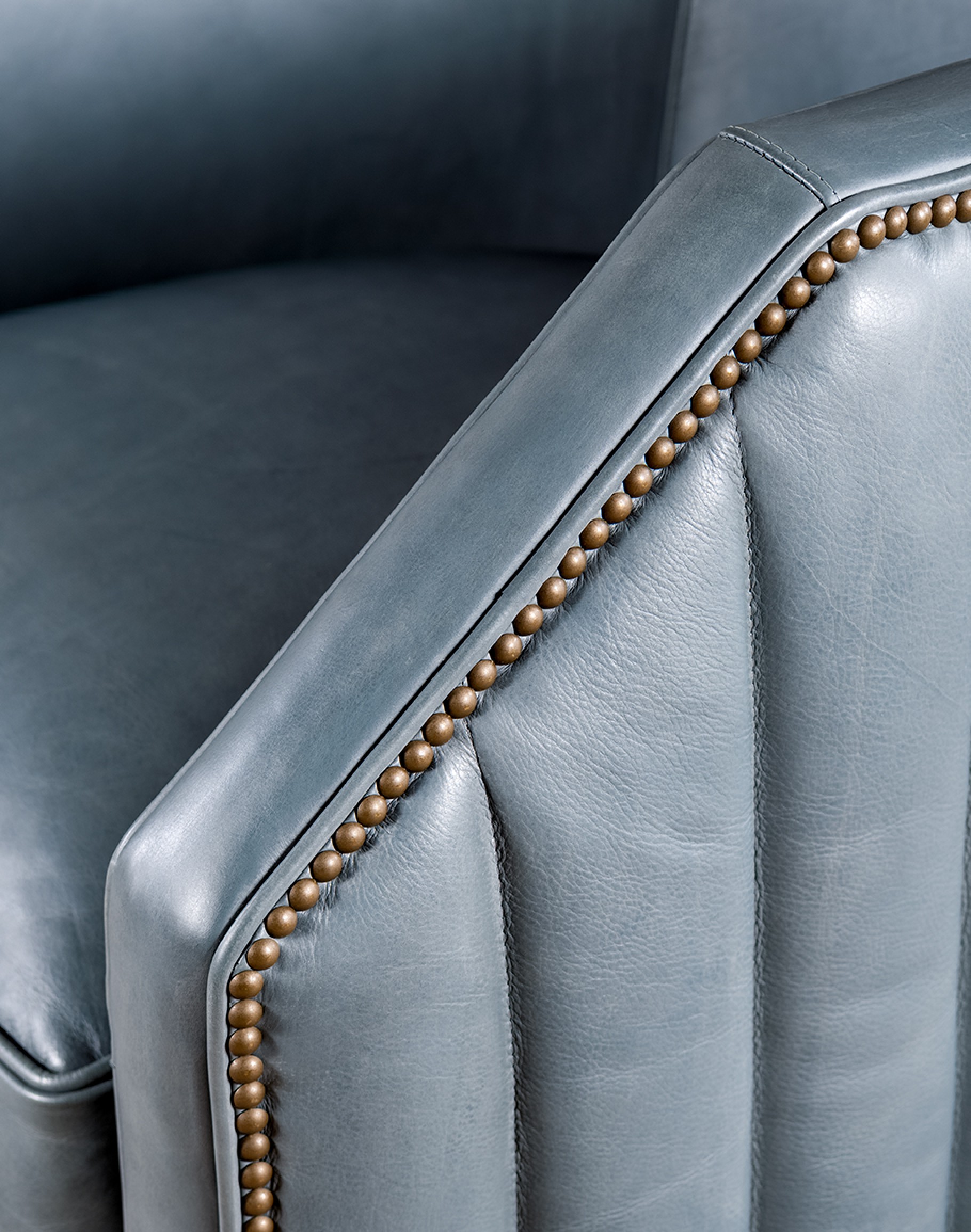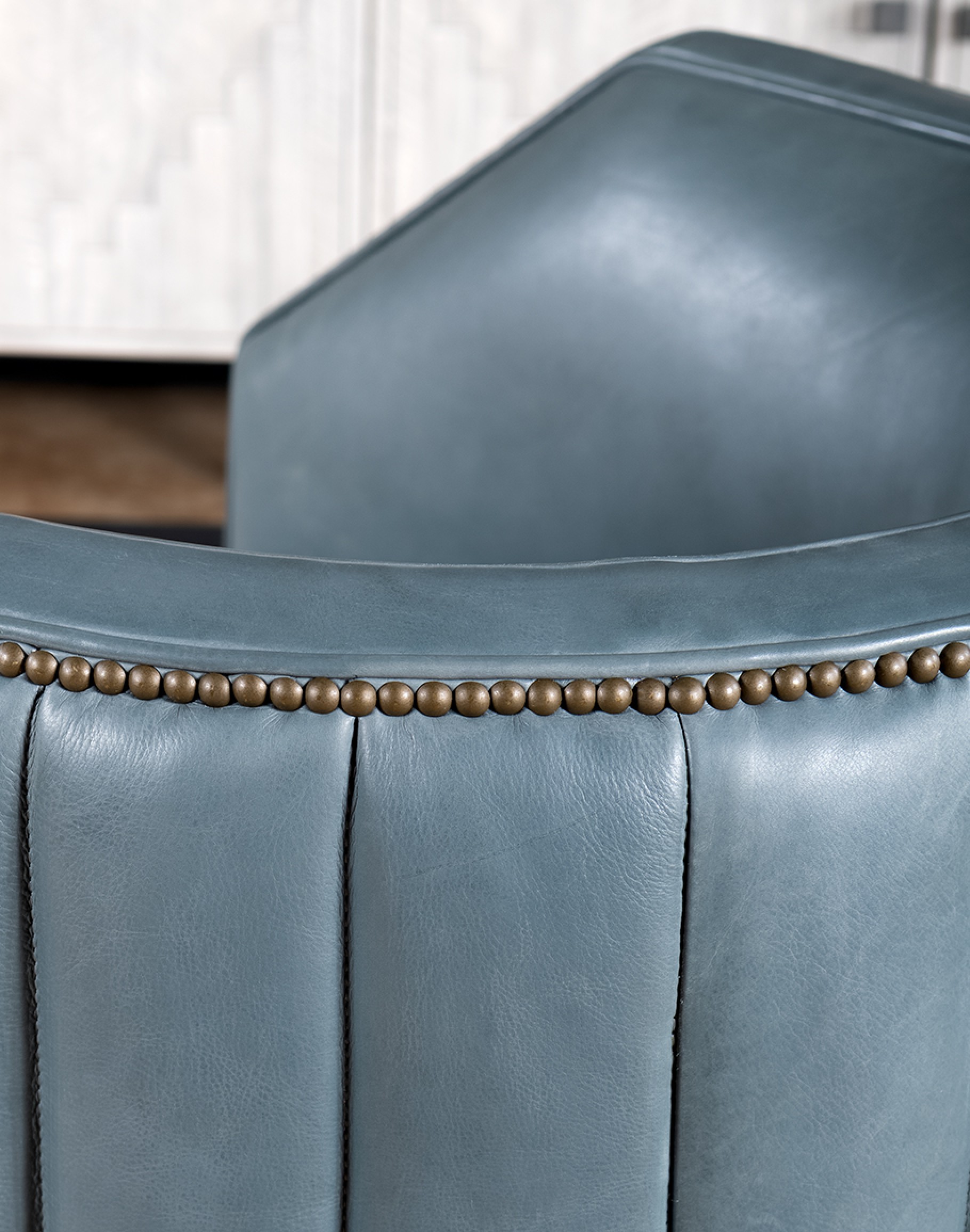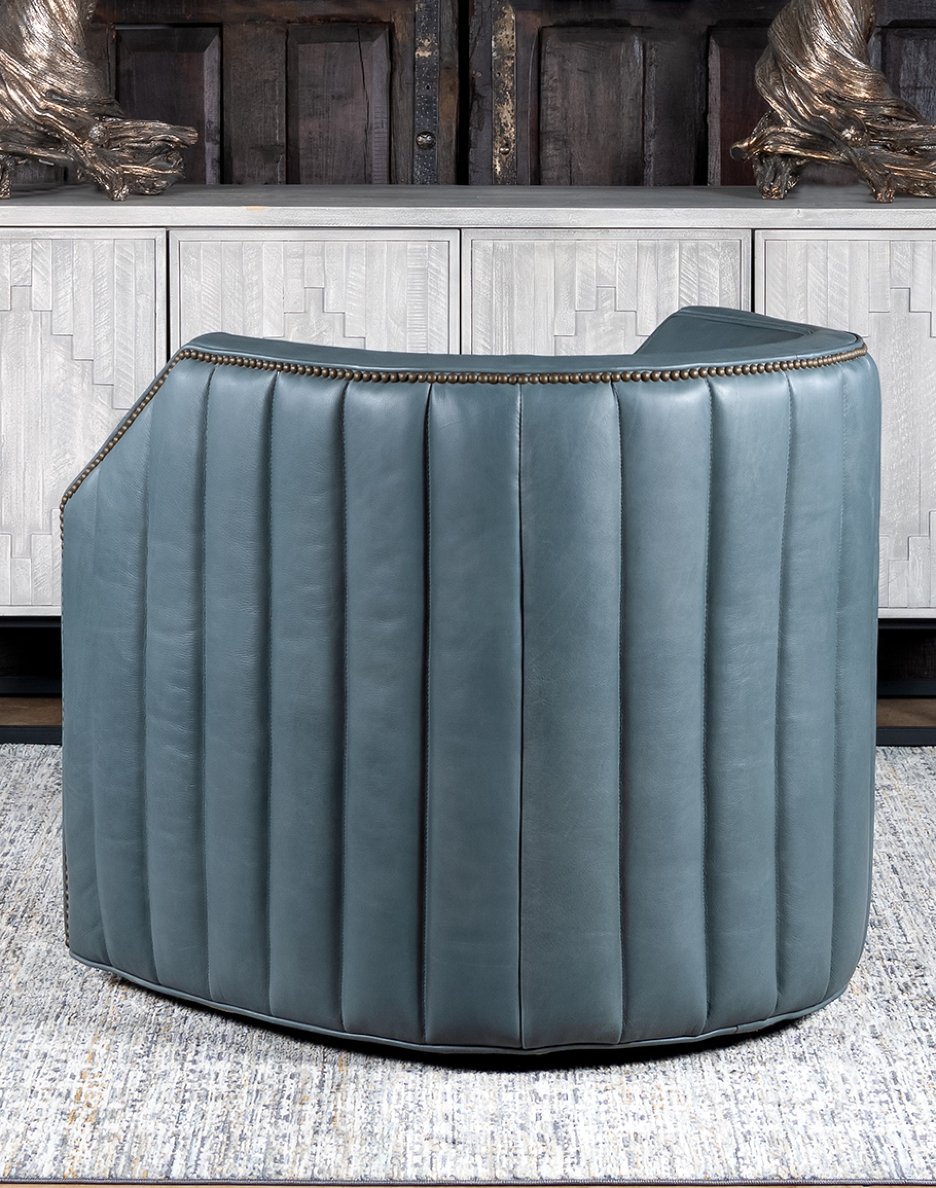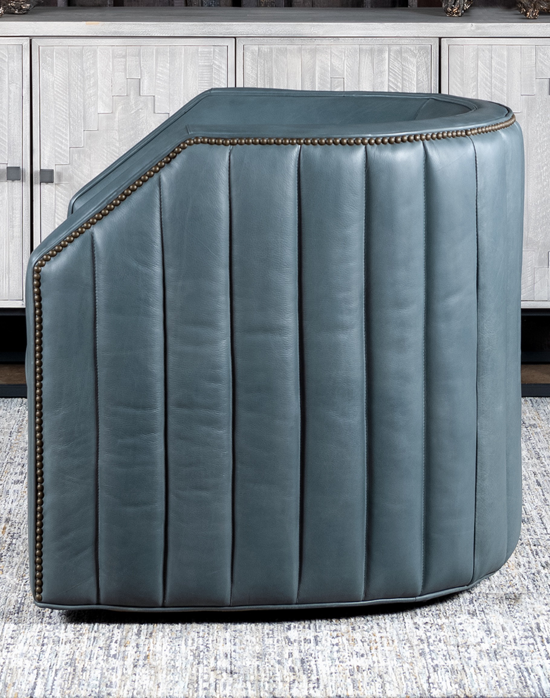 The padded channeling that wraps around the entire exterior of the chair offers both style and support, while the brass nail tacks provide a refined finishing touch. This design not only enhances the chair's aesthetic appeal but also ensures a comfortable seating experience. Perfect for both modern and traditional settings, the Oliver Sky Leather Swivel Chair seamlessly combines functionality with timeless design, making it an ideal choice for any living space. Elevate your home decor with this distinctive piece from Adobe Interiors. Transform your living space with the Oliver Sky Leather Swivel Chair, where comfort meets sophistication. At Adobe Interiors, we create the furniture, and you create the memories.
