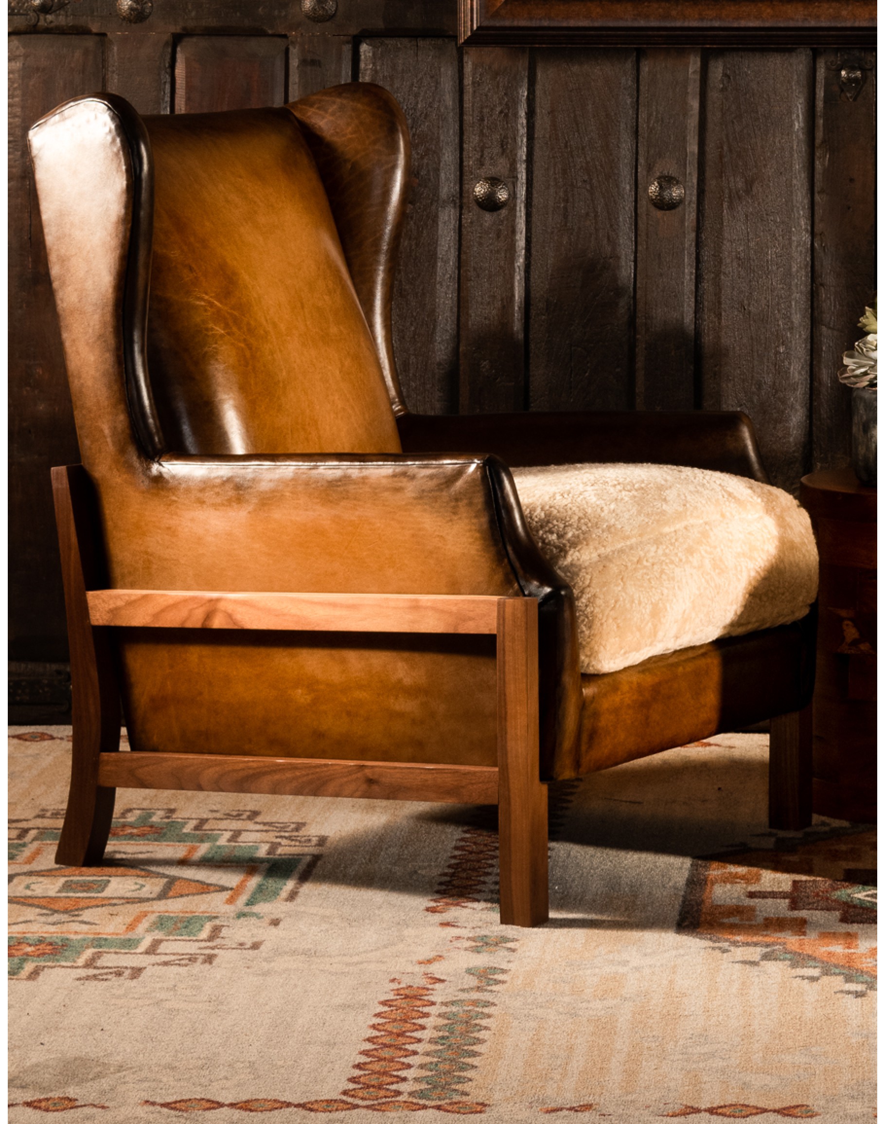 The Pagosa Leather Chair is a must have! A beautiful exposed Walnut frame with a hand burnish leather and genuine shearling seat cushion. 100% American Made to the highest standards of quality and craftsmanship!