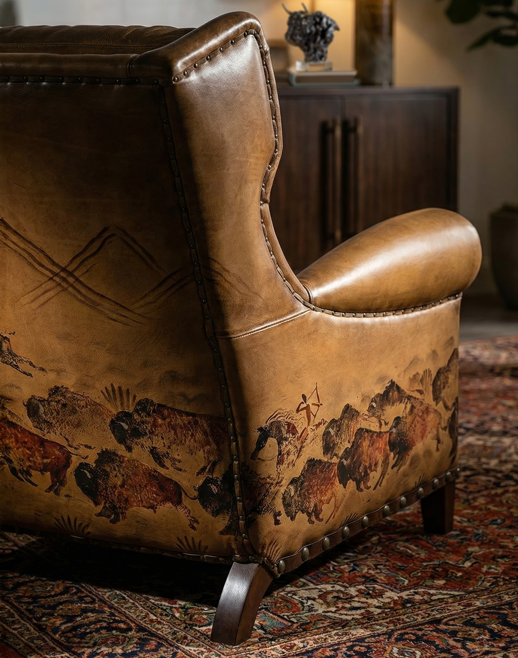 Painted Bison Leather Chair is a striking fusion of heirloom-quality craftsmanship and fine art. Upholstered in full-grain saddle leather in a warm palomino tan tone, this handcrafted chair embodies timeless Western style with modern comfort. The leather is richly hand-burnished to highlight its natural character, while the button wingback design, generously padded arms, and eight-way hand-tied spring system ensure lasting support and luxurious seating.