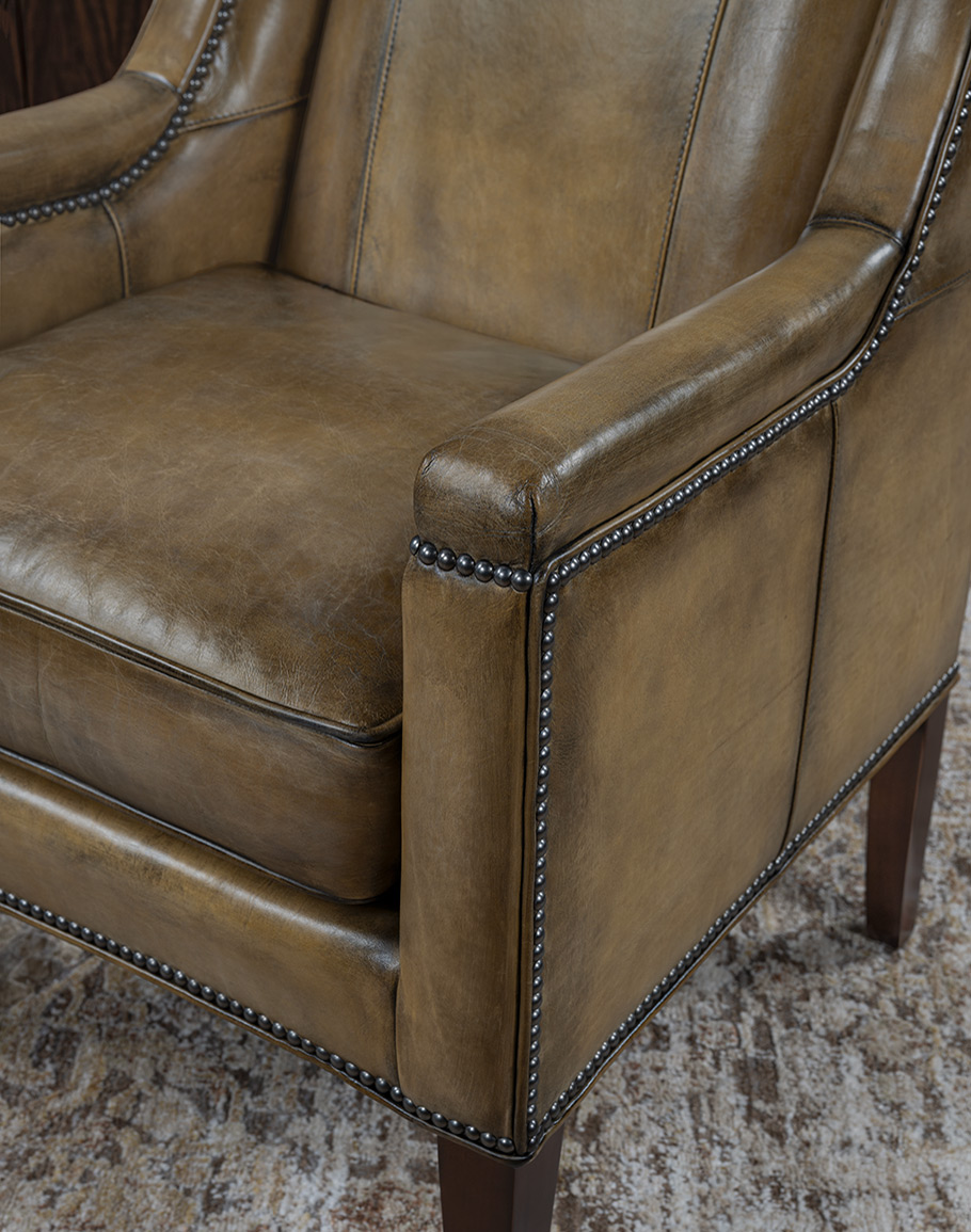 Handcrafted in the USA, the Pearson Relic Leather Chair brings elevated luxury to a clean, tailored wingback silhouette—built with heirloom-level craftsmanship. Designed for classic ranch, Pearson blends architectural lines with the rich warmth and natural character of genuine leather, making it a standout choice for a study, living room, or refined ranch-inspired sitting area.