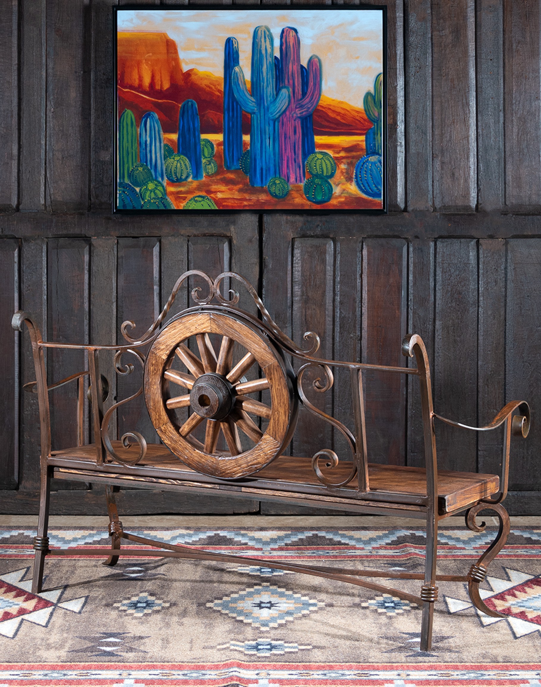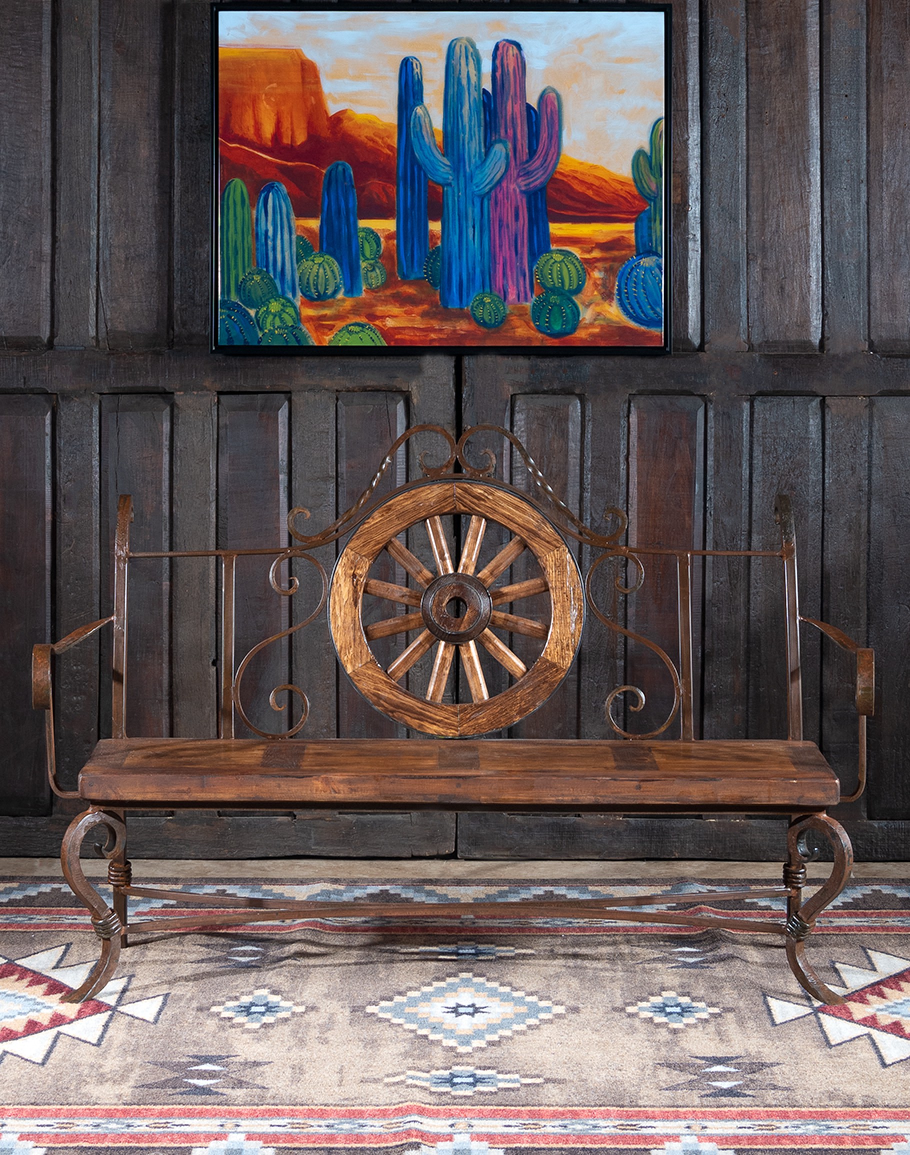 Distinctive Western Style: The bench features a striking replica wagon wheel integrated into the middle, adding an authentic Western touch to its design. This distinctive element not only serves as a captivating focal point but also pays homage to the pioneering spirit of the Old West.