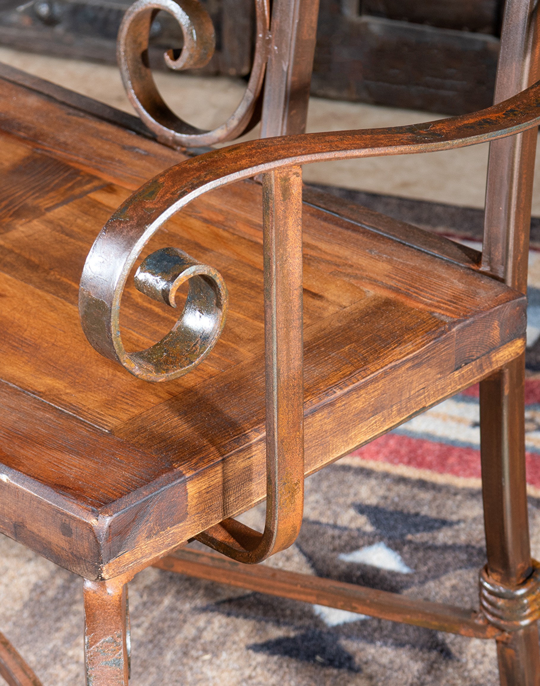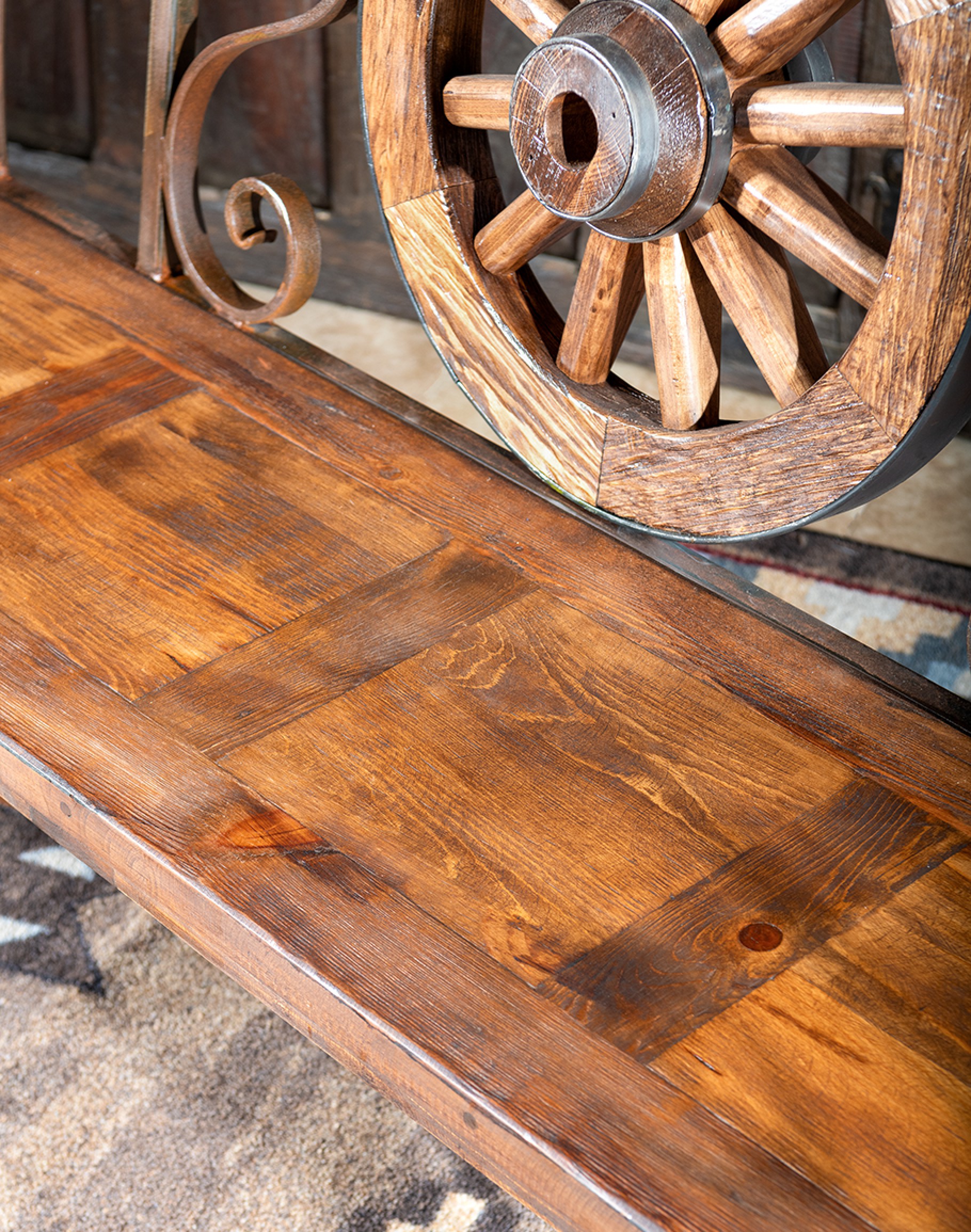 Solid Hand-Forged Iron Frame: The foundation of the Pioneer Wagon Wheel Bench is its solid hand-forged iron frame, designed for durability and strength. This sturdy construction ensures the bench can withstand the elements and the test of time, making it an ideal choice for any outdoor setting.