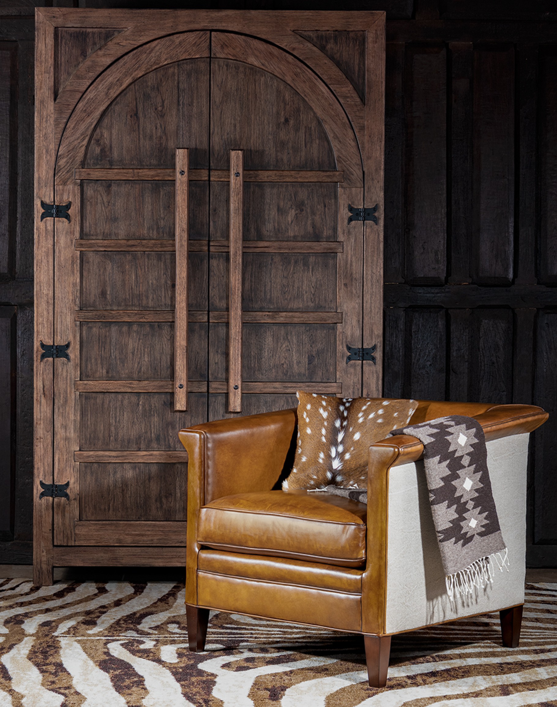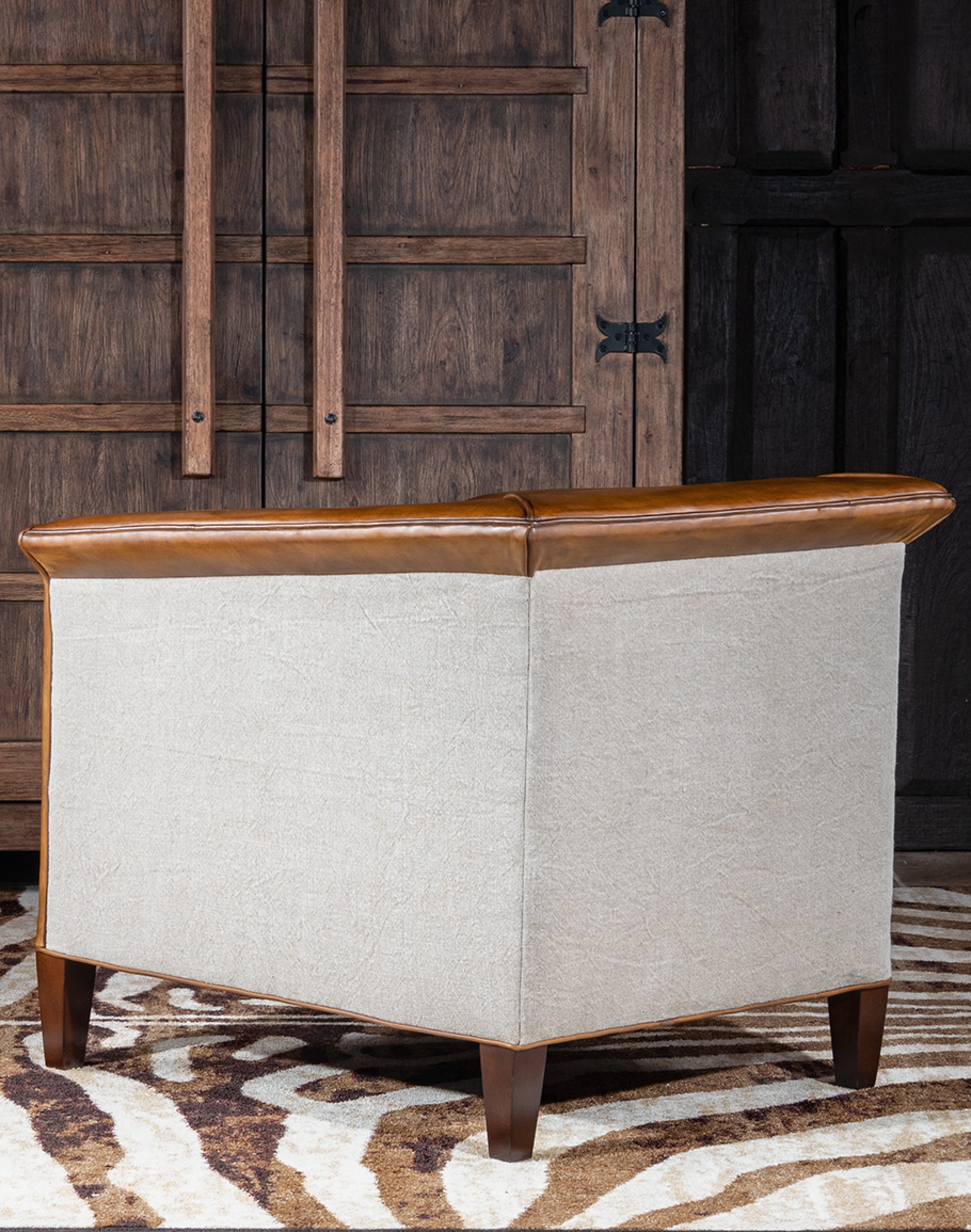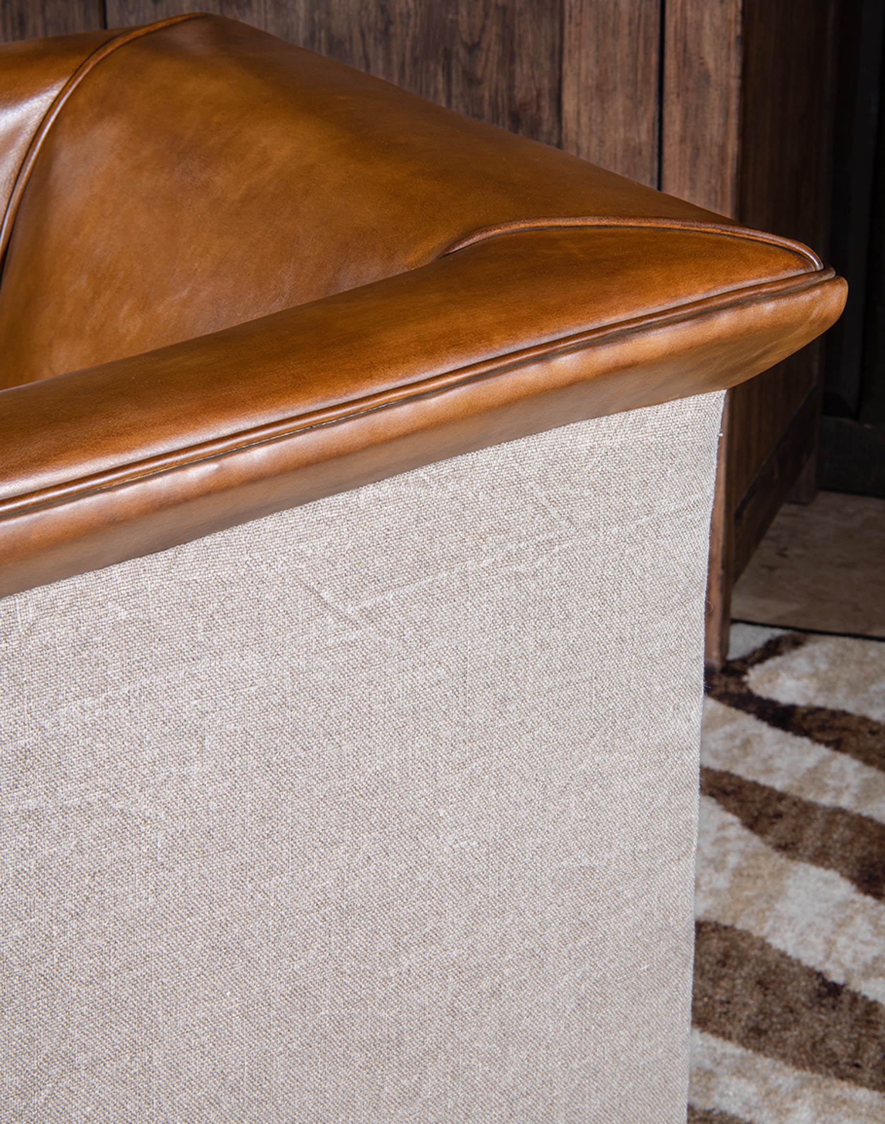 Discover the Polo Club Chair, a symbol of timeless appeal and modern rustic elegance. This 100% American-made masterpiece is meticulously crafted to uphold the highest standards of quality and craftsmanship. Our luxurious chair features 8-way hand-tied construction, ensuring supreme comfort and long-lasting durability. Wrapped in full-grain leather, the Polo Club Chair boasts hand-burnished details that add a layer of sophisticated charm to its aesthetics. It is right at home in the Refined Ranch collection. In a touch of unconventional elegance, the outside arms and back are encased in a creamy nylon fabric, textured to resemble a refined burlap look. Revel in the unparalleled style and comfort of the Polo Club Chair – a testament to the American tradition of handcrafted furniture excellence, an heirloom in the making. At Adobe Interiors, we create the furniture, and you create the memories.