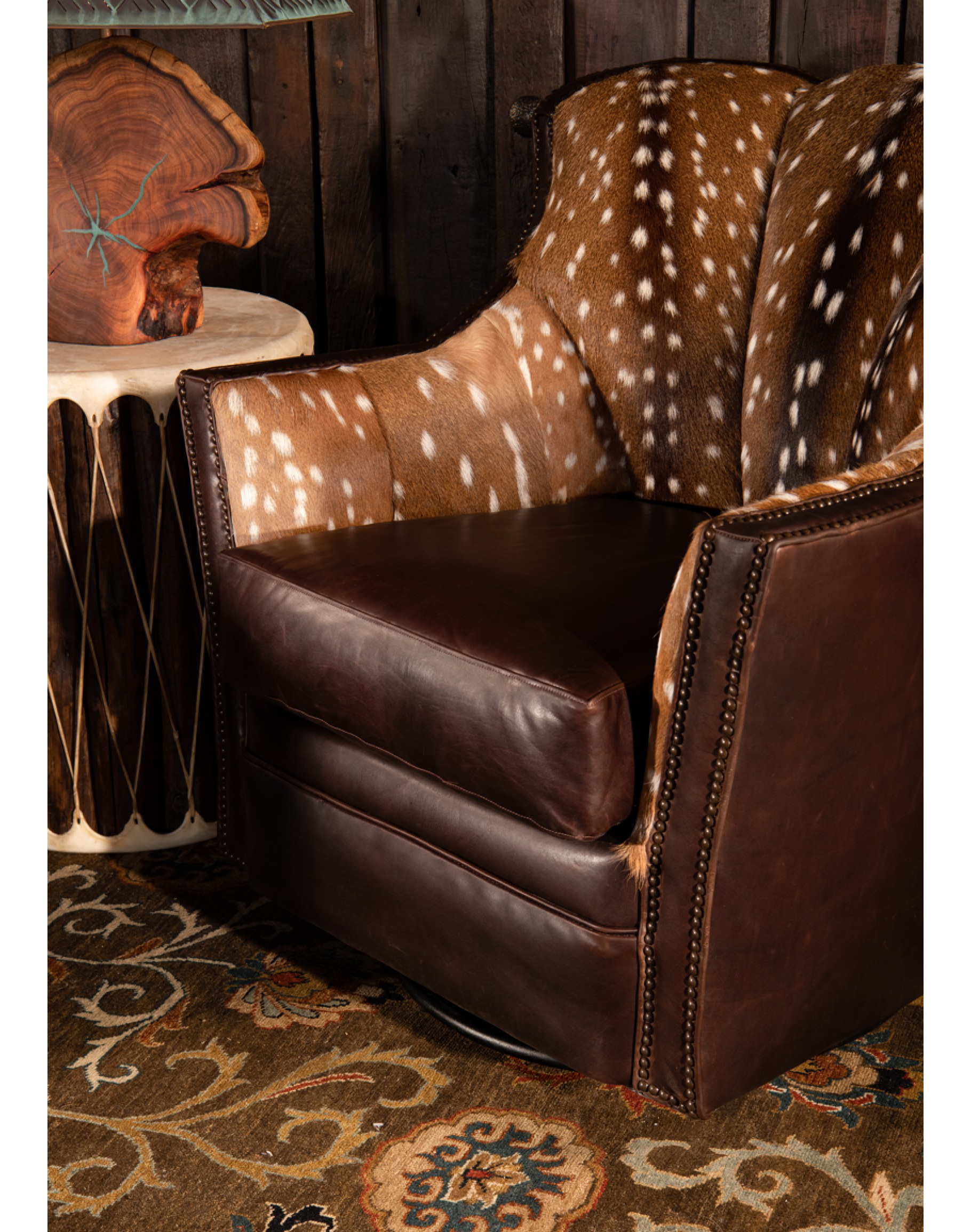 Our Lawton Swivel Glider Chair is not only eye catching but cozy and comfy! Hand Made with genuine axis deer skin, a buttery soft ivory leather and an..