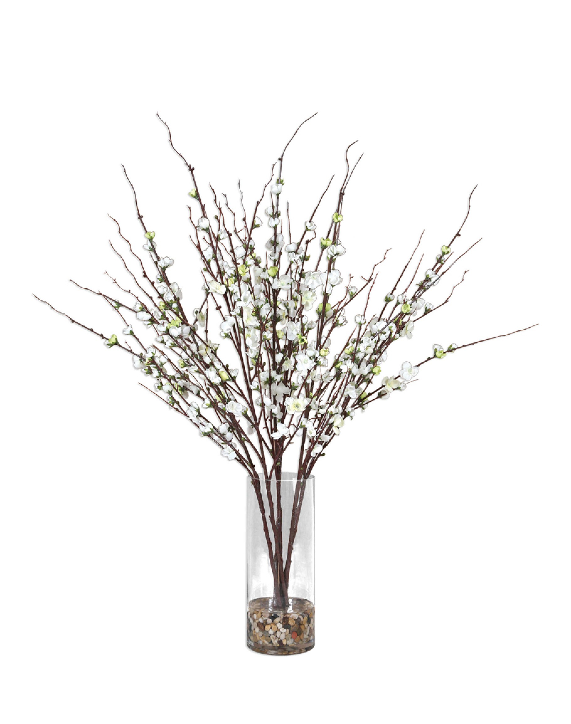 Effortlessly arranged as if freshly harvested, these quince branches exemplify the true characteristics of live blooms. Varying in stages of openness, cream buds are accented by natural rocks in a clear glass vase.