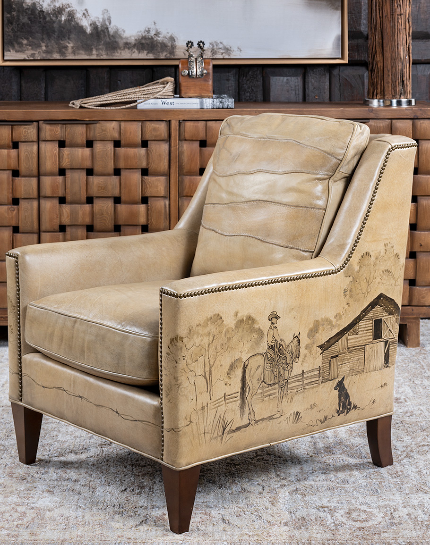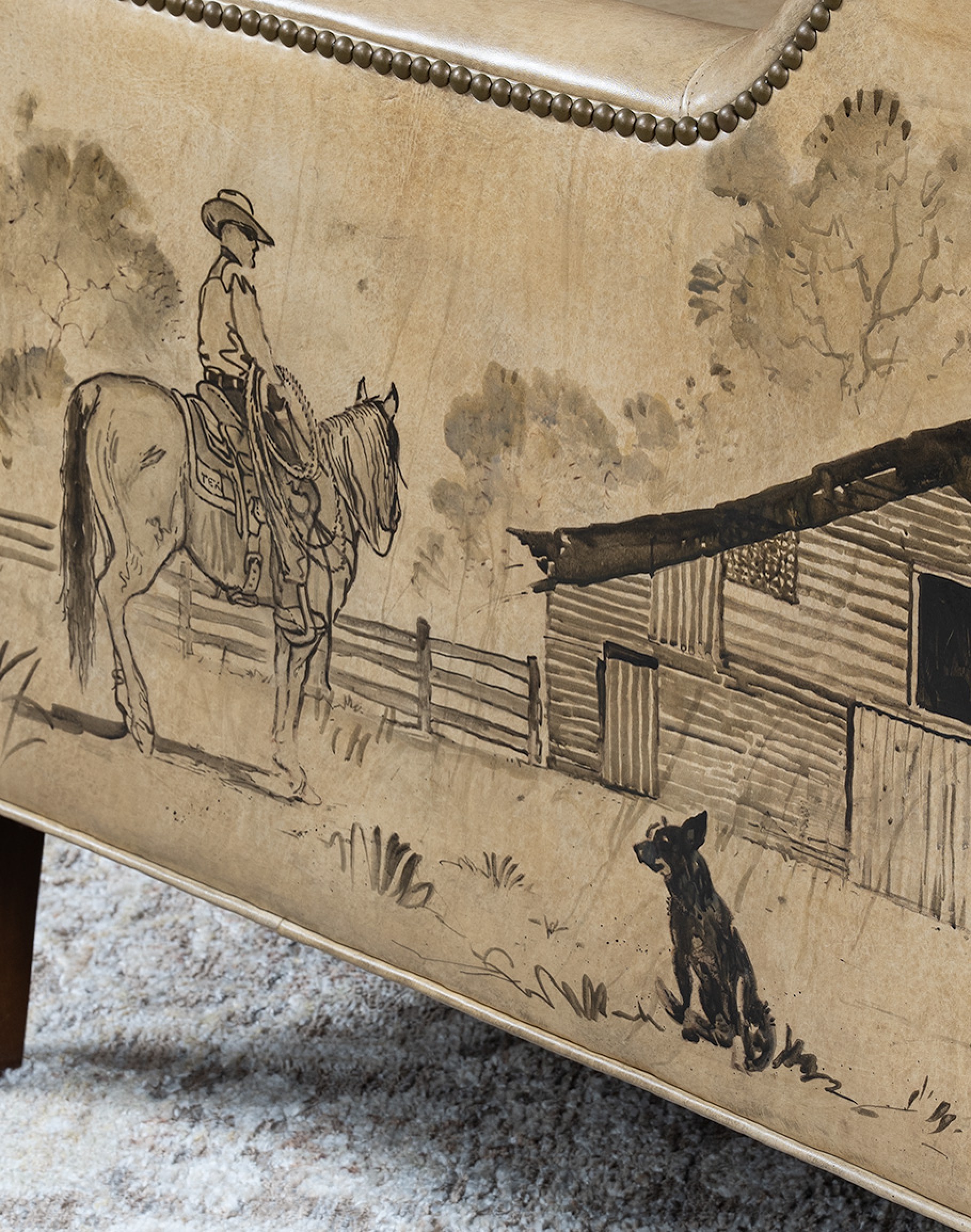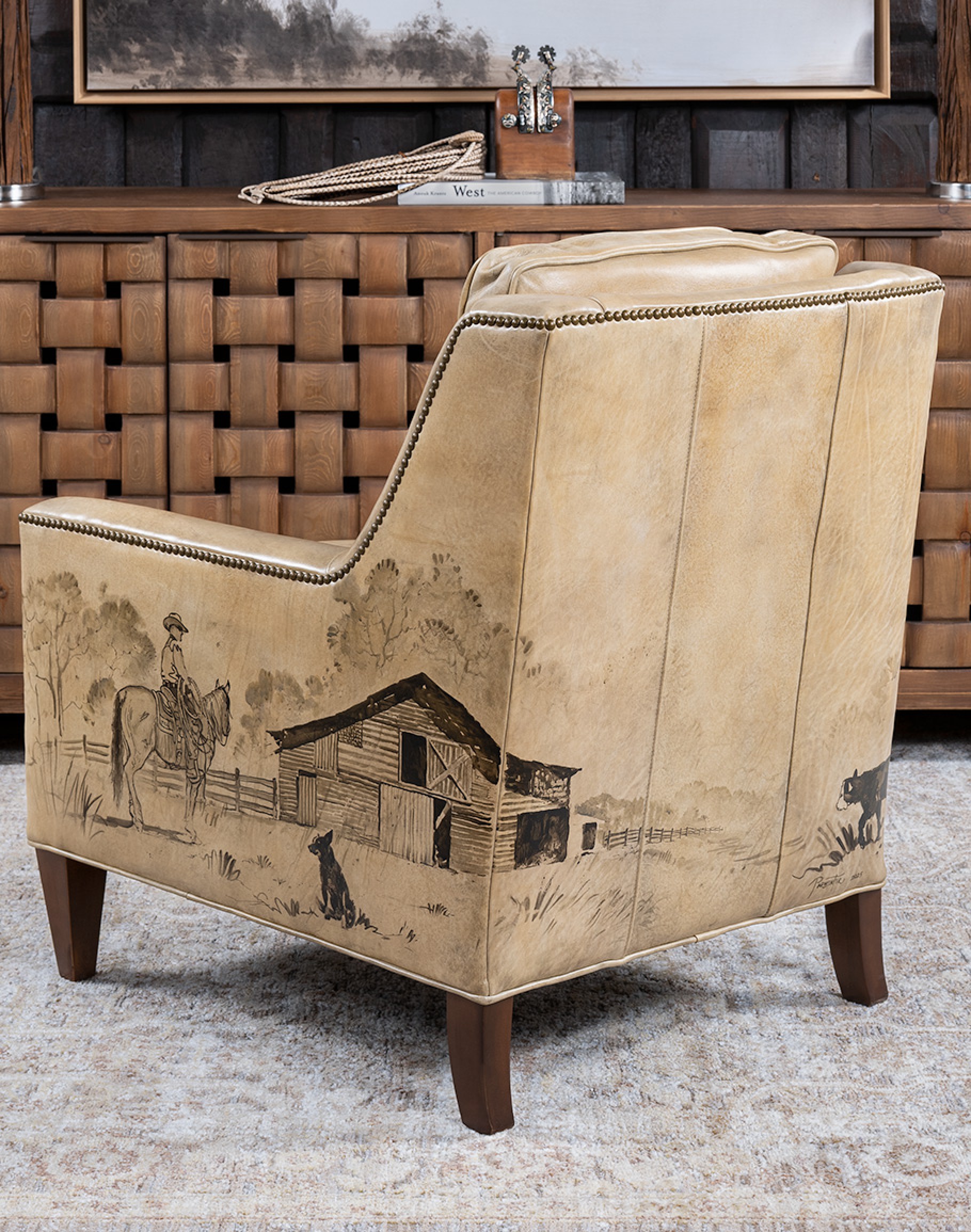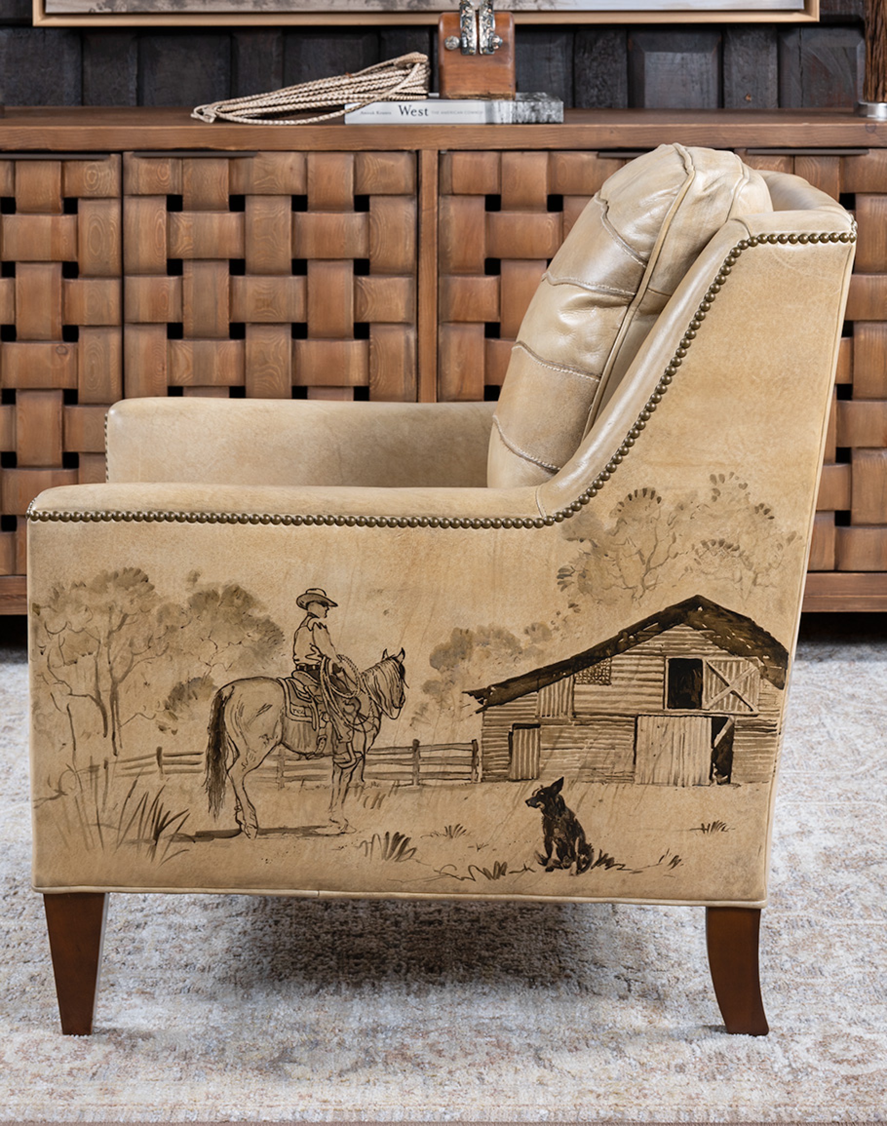 Upholstered in full-grain leather with a hand-burnished finish, the chair showcases a warm desert sand tan tone that enhances the natural variations of the hide. Each piece is one-of-a-kind, featuring hand-painted Western ranch scenes across the chair’s back and sides. Signed by the artist, these illustrations celebrate the heritage of cowboy life, from cattle and corrals to riders and ranch dogs, making this chair not just furniture, but a collectible statement piece.