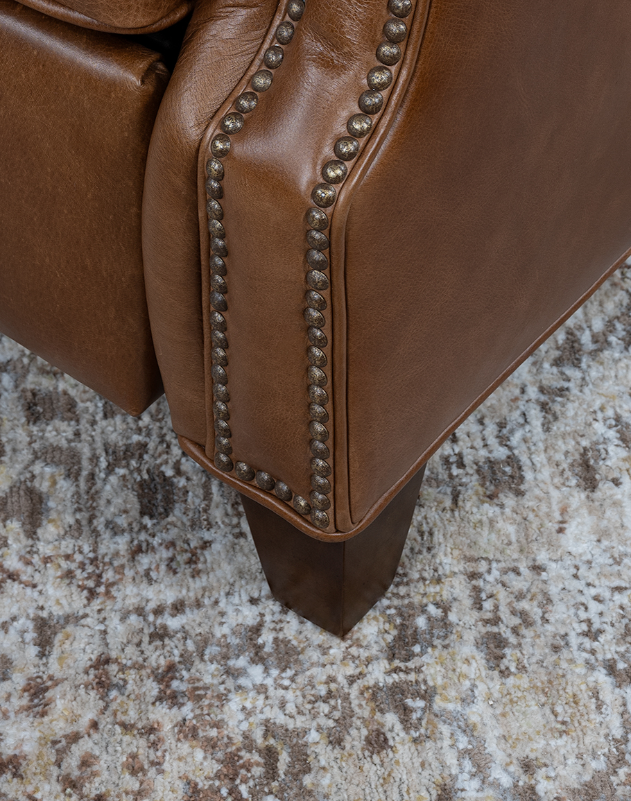 Hand-applied antique brass nailhead trim races the front of the arms in a double border, emphasizing the graceful contour and detail. Tapered wooden block legs in a deep espresso finish anchor the piece and complement the warmth of the whiskey leather. Crafted in the USA to the highest standards of quality and craftsmanship, the Ranger Whiskey Leather Recliner is designed to deliver long-lasting comfort, heirloom durability, and timeless Western style. At Adobe Interiors, we create the furniture, and you create the memories.