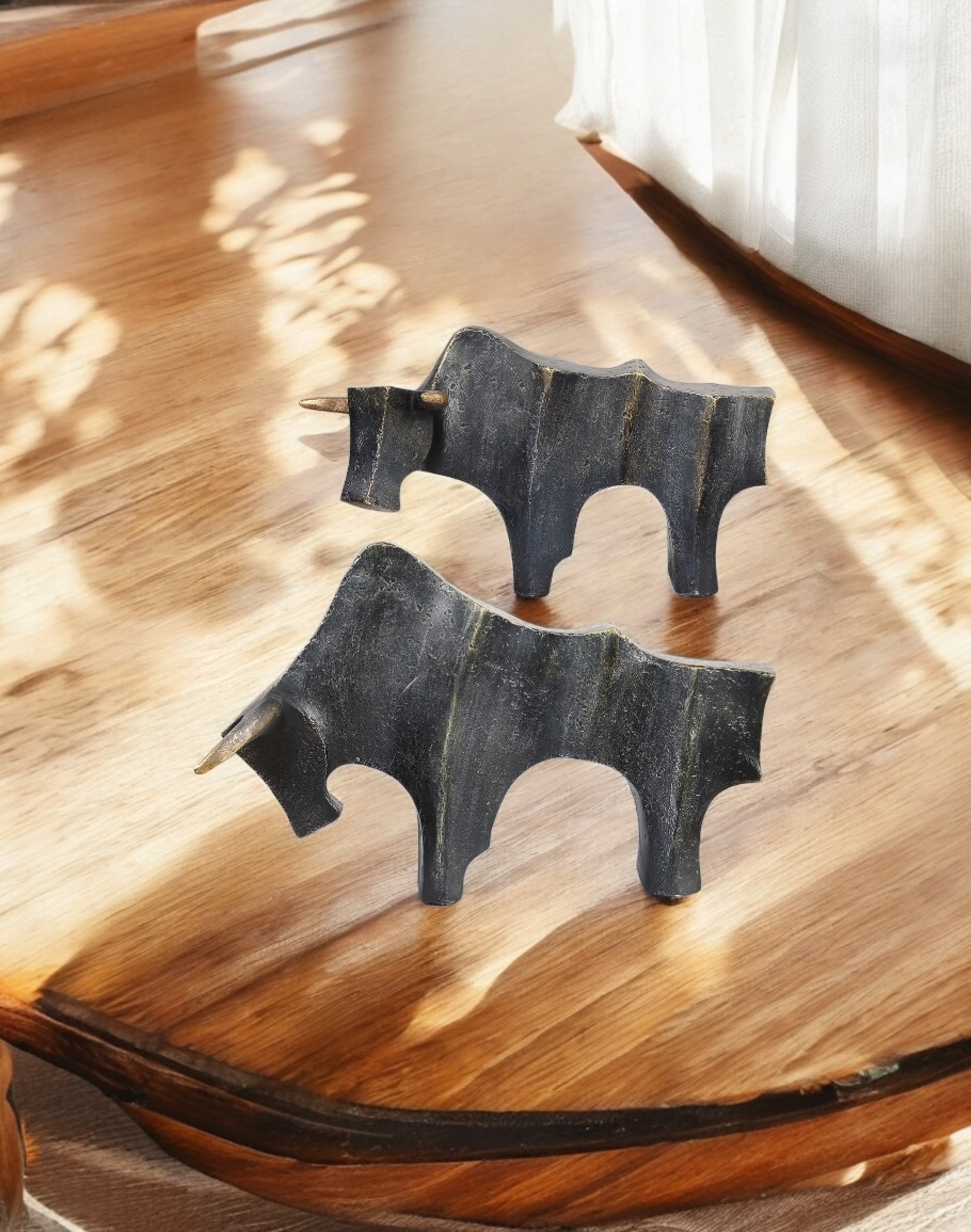 This striking set of two bull sculptures features a rich dark bronze finish complemented by elegant gold highlights, creating a dynamic and sophisticated look. Each sculpture captures the powerful essence and grace of these majestic animals, making them perfect decorative pieces for any space.