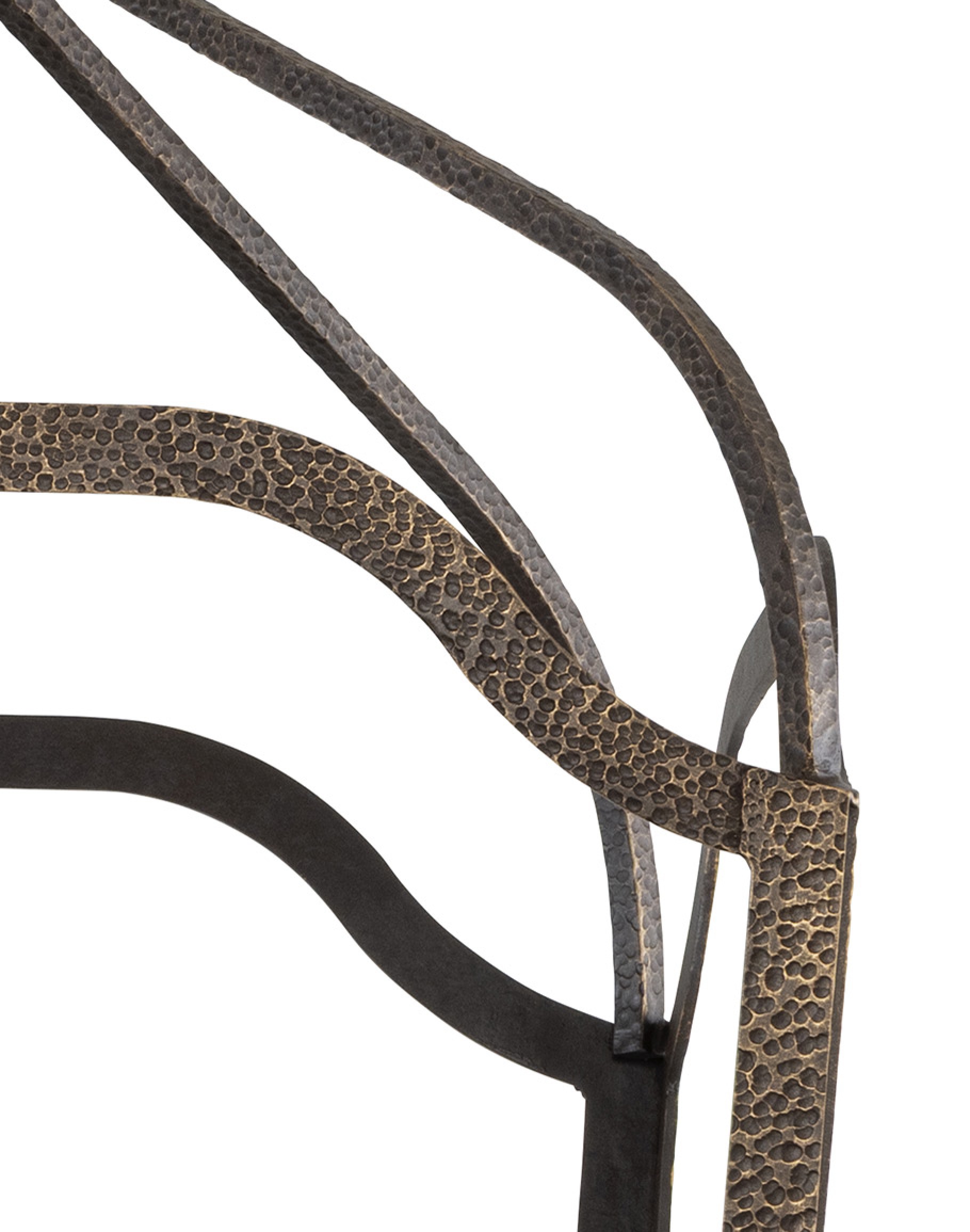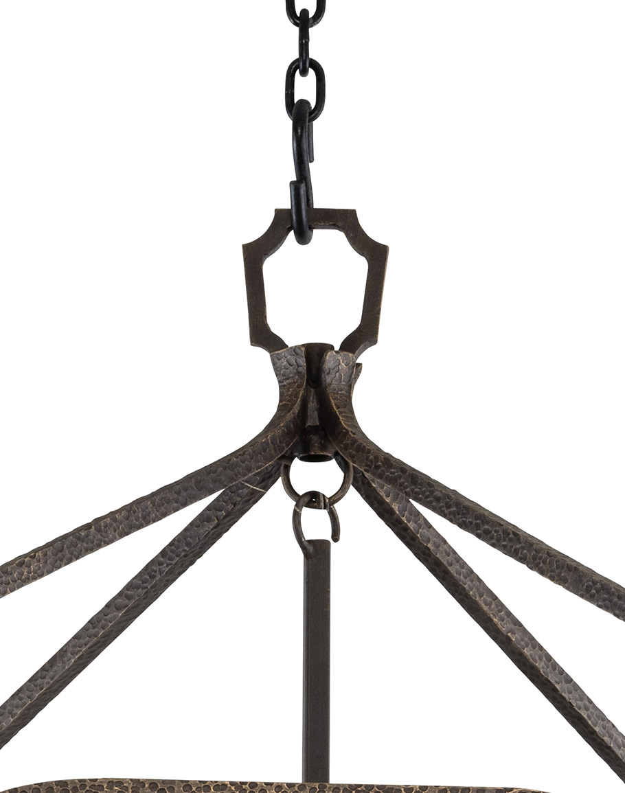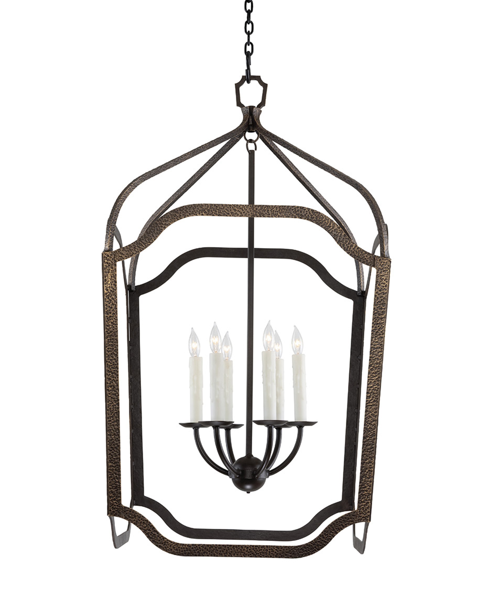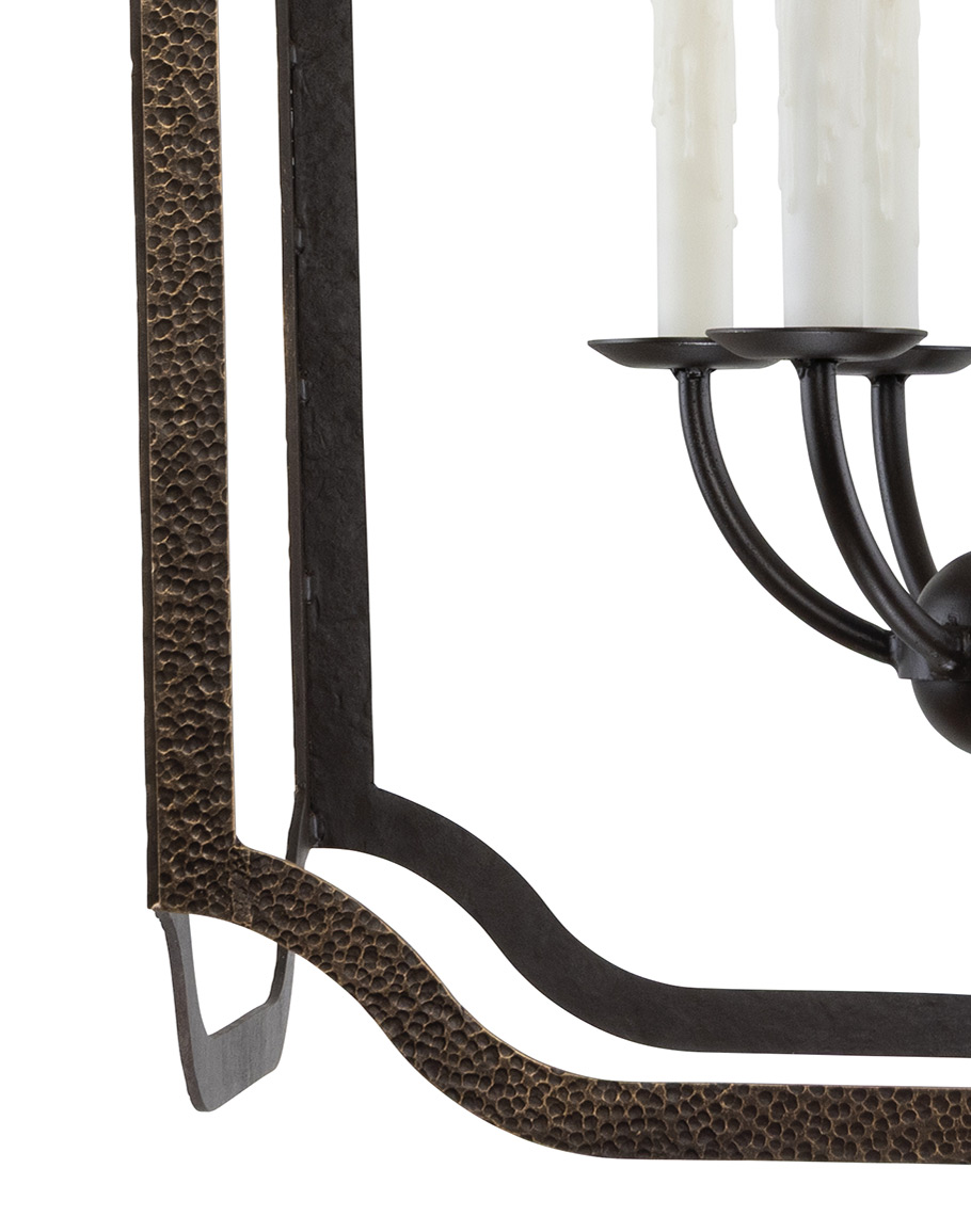 The Riley Lantern is a sculptural statement piece that blends Old World ironwork with refined, architectural lines. Designed in an elongated open lantern silhouette, the frame is constructed from hammered strap iron with a rich antique bronze finish and warm brushed gold undertones that catch the light. Softly contoured corners and gentle curves along the top and base give the lantern a custom, hand-forged look