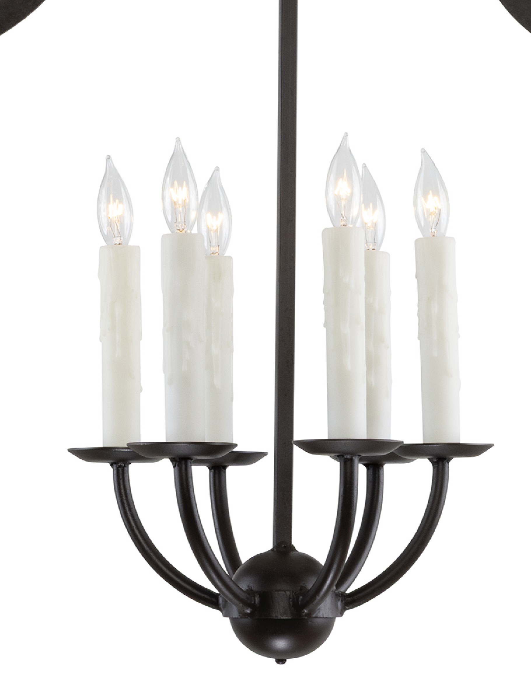 Suspended at the center is a classic six-light candelabra. The upward-swept arms rise from a round central hub and support detailed bobeches and ivory drip candle sleeves, creating the look of real wax candles with flame-tip bulbs. The open cage design preserves sightlines and highlights the negative space around the candelabra, delivering warm, ambient light without feeling visually heavy—perfect for an entryway, dining room, or vaulted great room.
