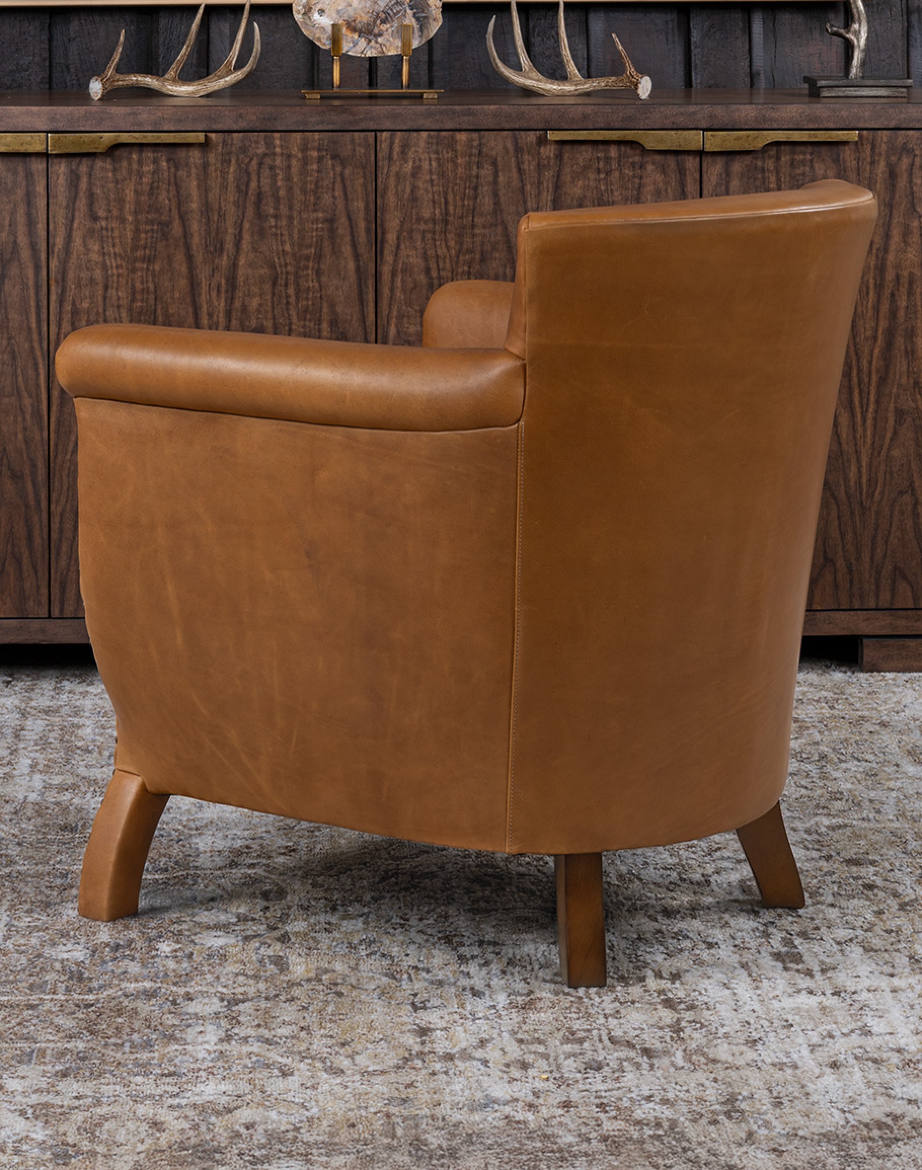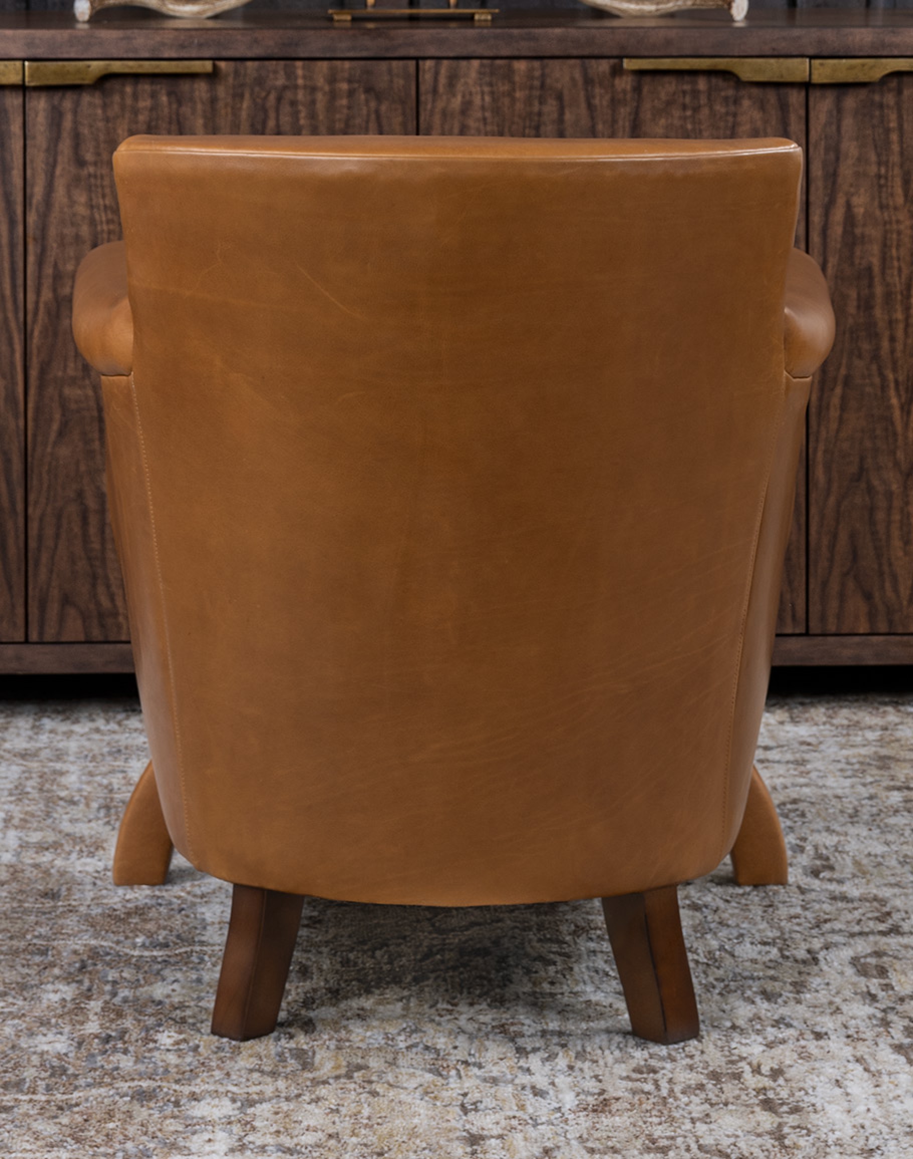 The Remington Saddle Leather Chair is a statement accent chair designed with the kind of tailored detailing you typically see in bespoke club seating—100 % America made to exceptional standards of quality and craftsmanship. Upholstered in a warm Saddle leather, the Remington showcases a clean tight back, generously scaled shelter arms, and refined top-stitched seam work that gives the silhouette a structured, designer-finished look.