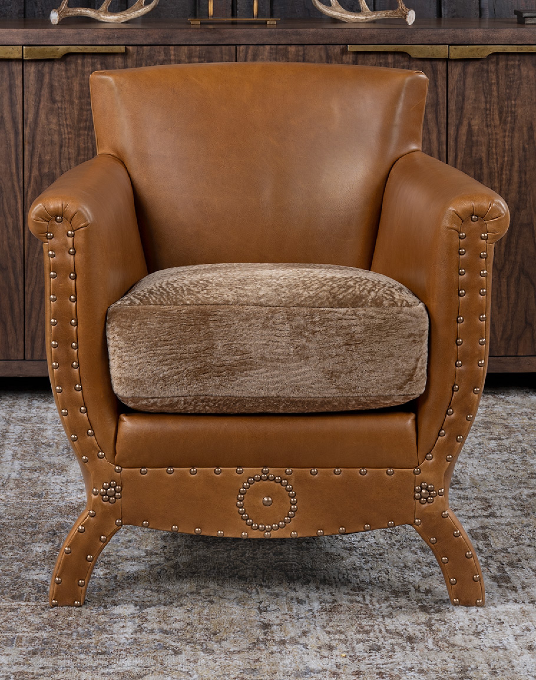 A plush loose seat cushion in a rich, tactile pile adds a layer of inviting contrast in a soft beige-gray — bringing depth, comfort, and a subtle play of texture against the smooth leather body. The chair is finished with antiqued bras-toned nailhead trim that follows the arm posts and apron. At Adobe Interiors, we create the furniture, and you create the memories.