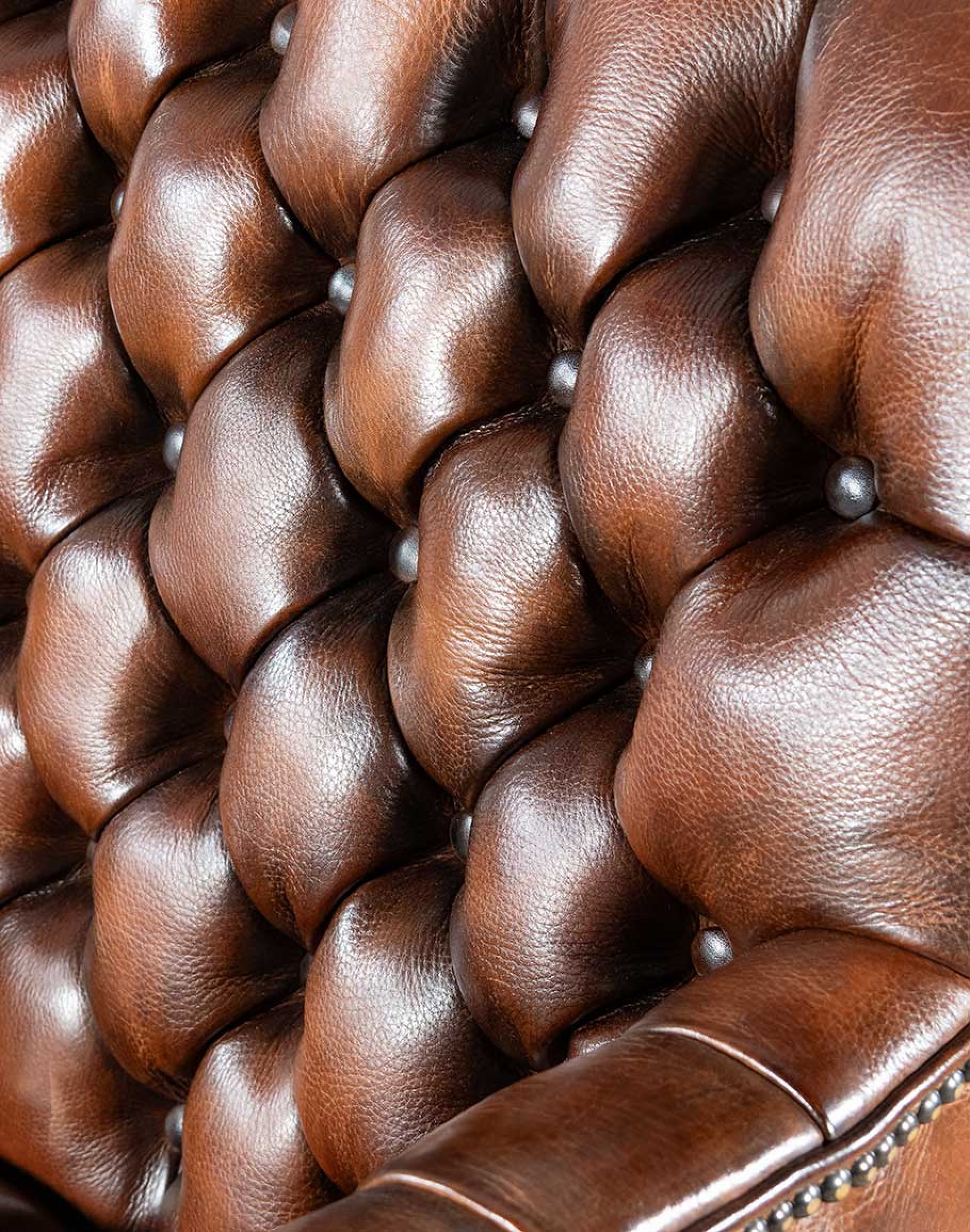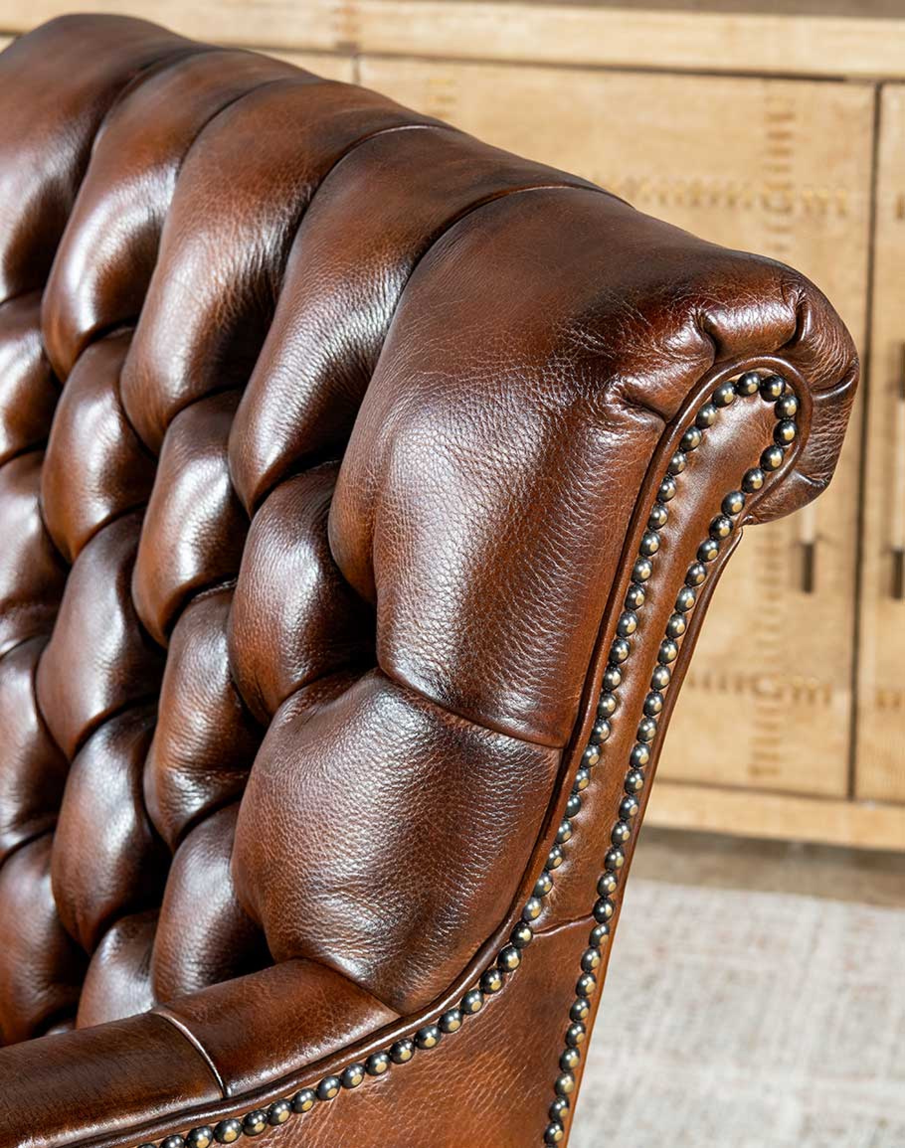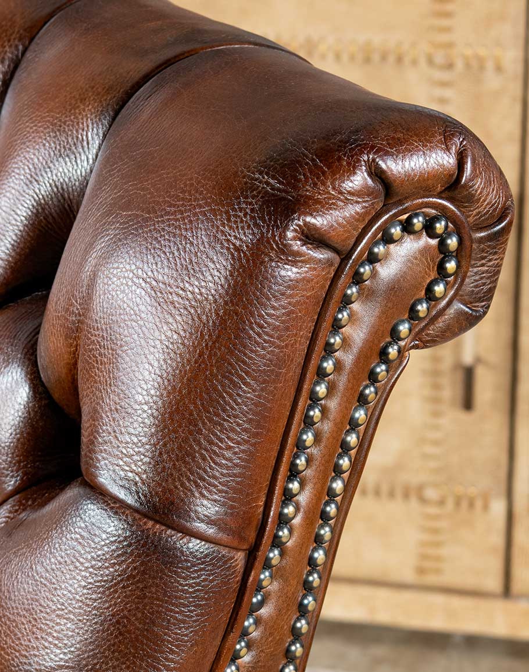 Leather Description: Artisan Leathers beautifully evoke this time worn quality, unique to every individual piece, like the originals. To pure aniline leather crusts, already fully and carefully upholstered to the piece, a base color is created with multiple applications of waxes and oils, hand-worked by the leather Artisan. After drying, this craftsman then carefully builds-up the finish with an expert's eye, and touch, to achieve an aged patina in just the right places to reflect the aged qualities only time, wear, and frequent care could have accomplished naturally. Every individual piece upholstered with Artisan Leather finishing methods is first beautifully built to the highest standards of quality. The leather is then hand-colored and aged to bespeak the loving touch of time, providing a quality antique appearance to a beautiful new piece of quality leather furniture. Every chair, sofa, or bench has its very own unique identity only these hand-crafted methods can provide, reflecting the presence of a time honored past.