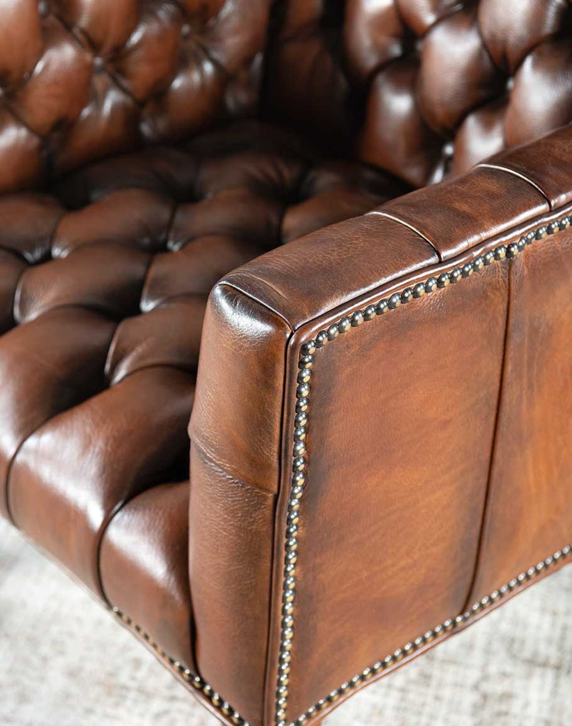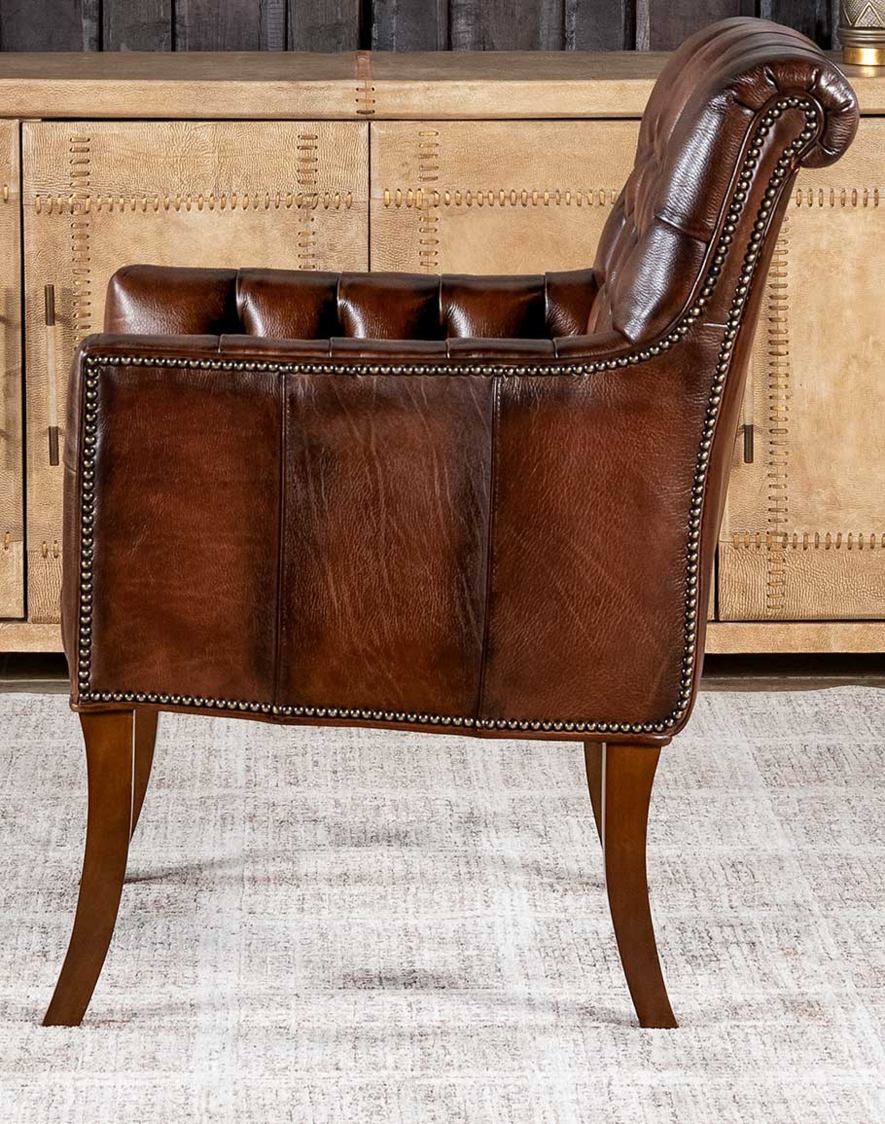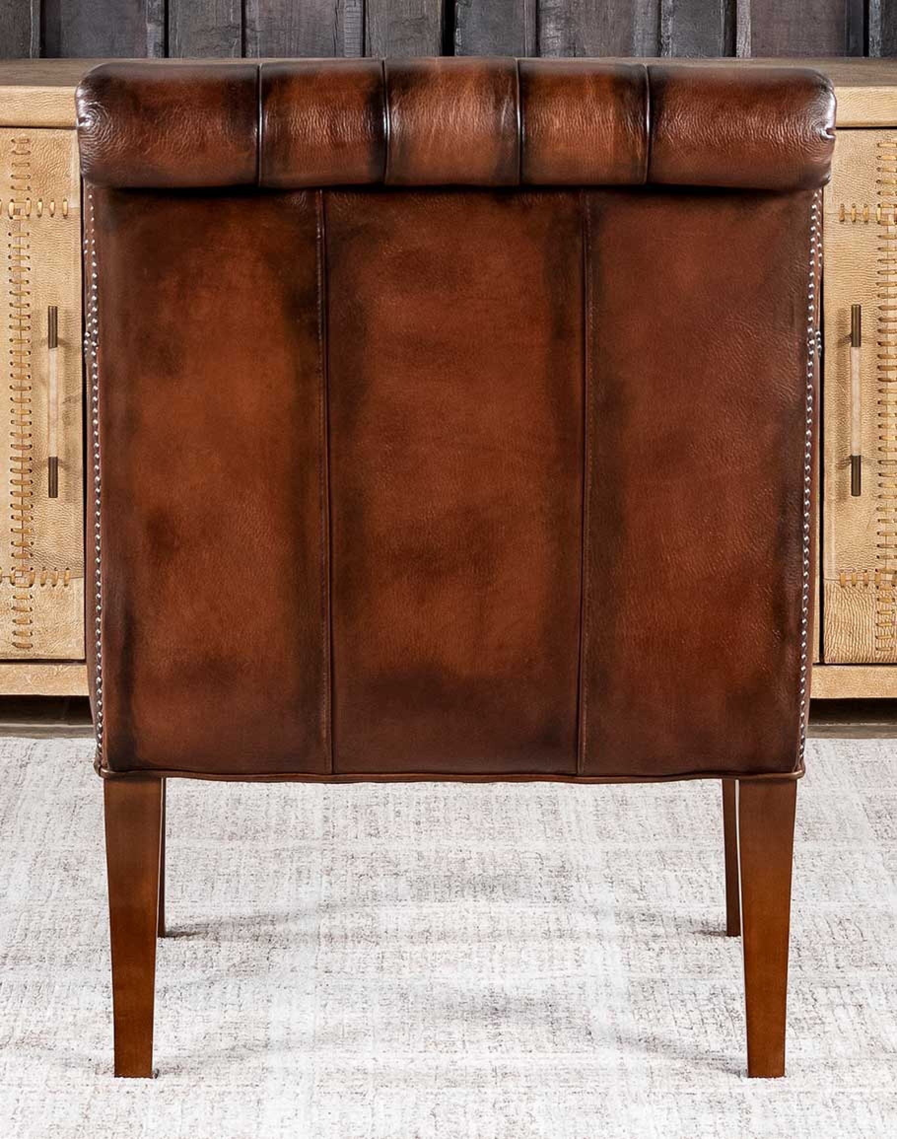 The Reno Sable Tufted Leather Chair is a masterful blend of elegance and craftsmanship, perfectly suited for any refined space. This medium-scaled chair is 100% American-made, adhering to the highest standards of quality and craftsmanship. It features luxurious full-grain leather, meticulously hand-burnished to enhance its natural character and depth.