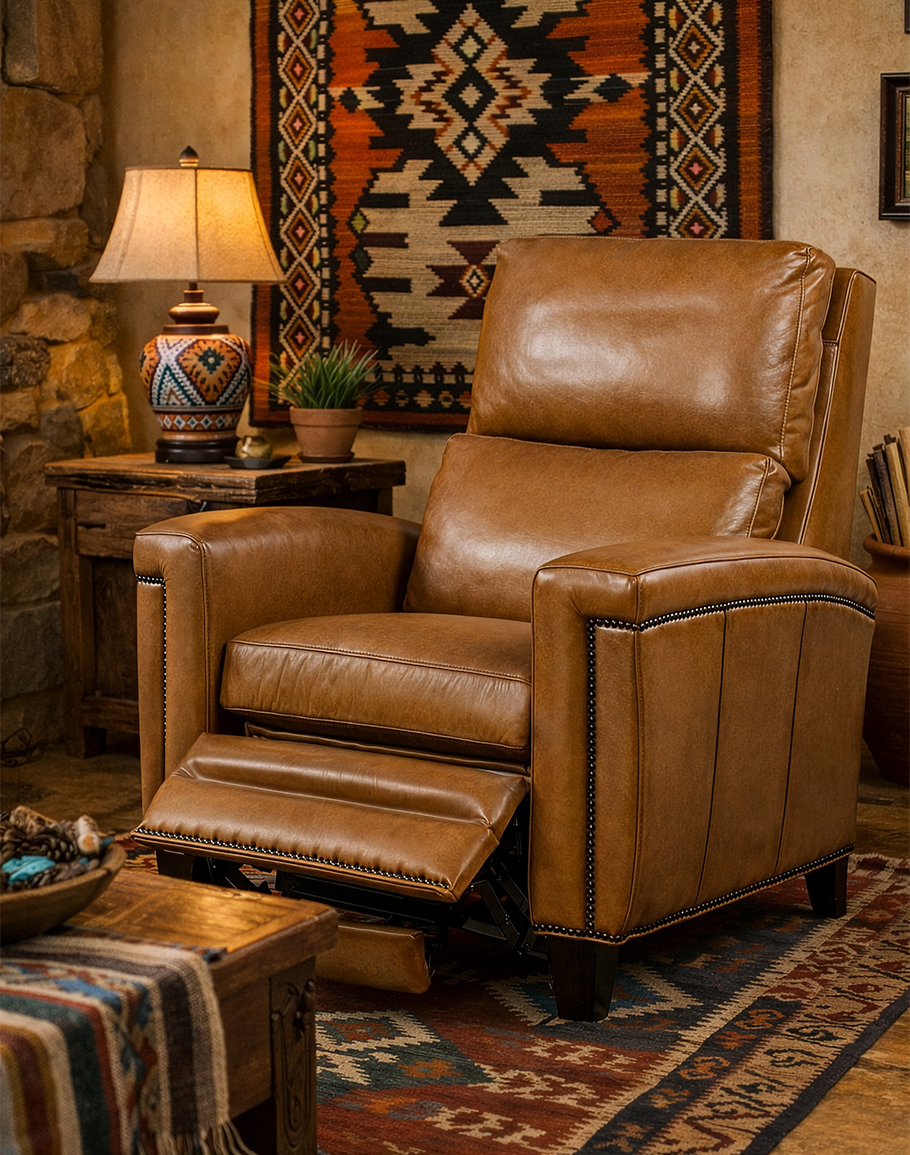 Discover the height of luxury and comfort with the Revolver Bourbon Leather Recliner. Crafted in the USA, this recliner embodies elevated ranch living with a refined blend of Classic and Mountain Ranch style. Wrapped in luxurious full-grain leather with artfully hand-burnished detailing, it offers a rich, dimensional finish that feels as good as it looks. A kiln-dried hardwood frame with true 8-way hand-tied construction provides heirloom-level durability while preserving a sleek, modern rustic profile. Clean, tapered arms, a supportive bustle back, and a smoothly engineered recline mechanism create a lounge experience that’s both tailored and deeply comfortable. Revel in the ultimate relaxation experience with our sumptuous, high-end recliner. Expertly crafted with 100% American-made materials and built to the highest standards of quality and craftsmanship, this recliner is designed to last a lifetime. At Adobe Interiors, we create the furniture, and you create the memories.