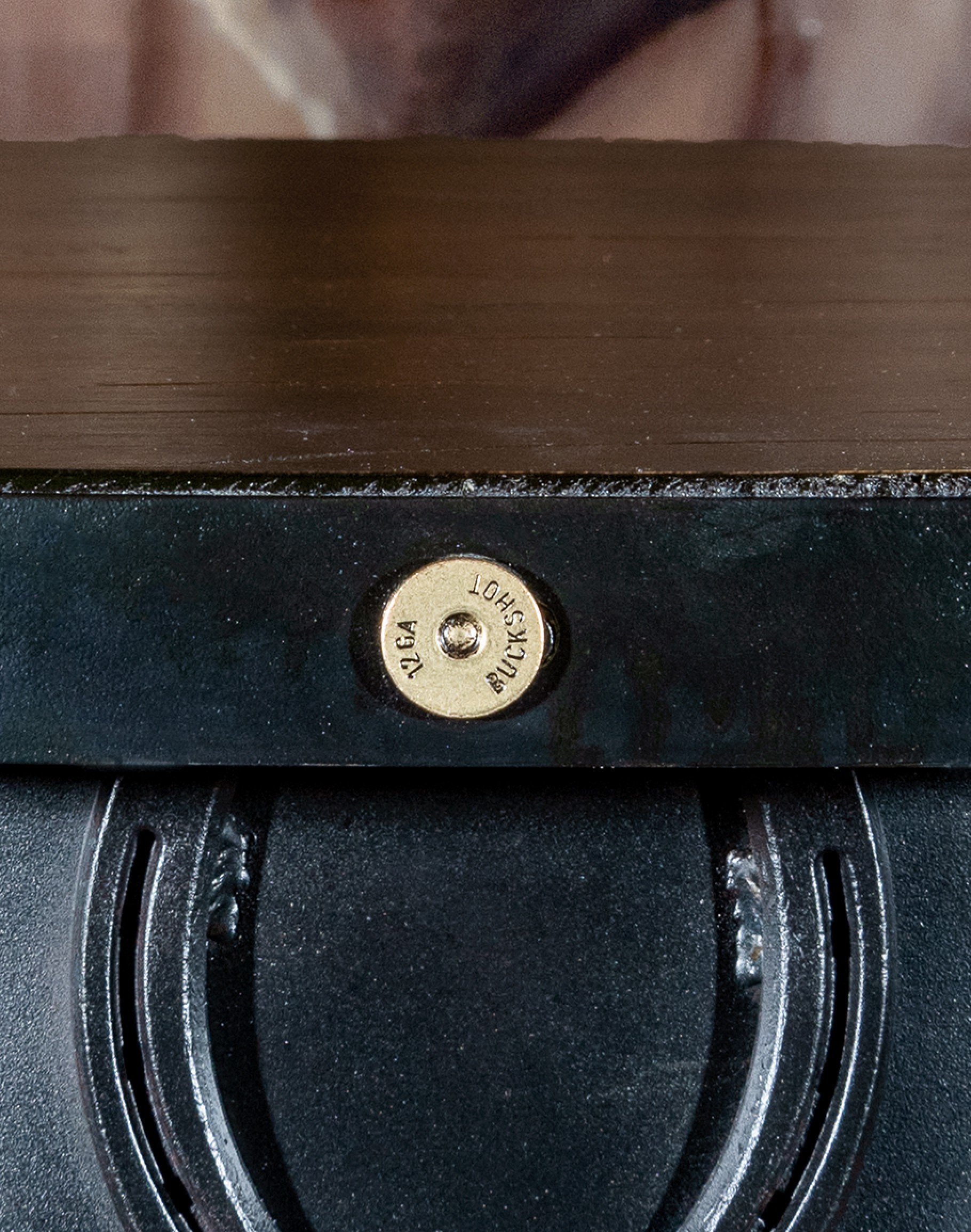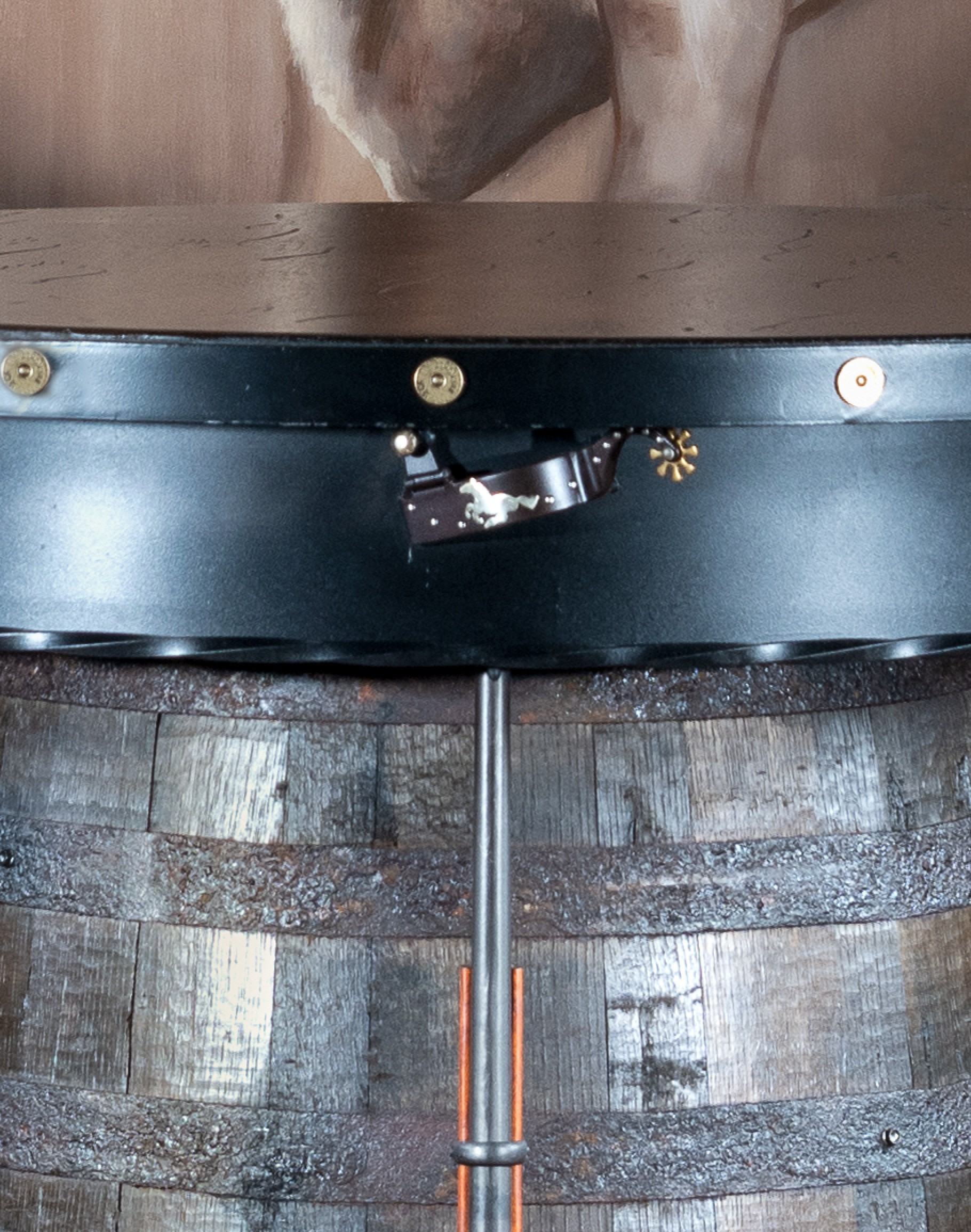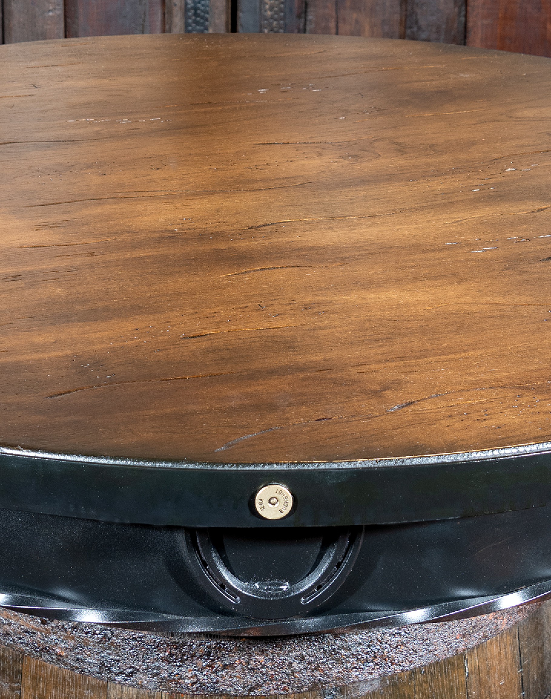 The table top is crafted from high-quality American alderwood, known for its durability and beautiful grain, providing a sturdy and stylish surface for your social gatherings. Surrounding the edge, shotgun casing tops add a distinctive, rugged edge to the design, further enhancing its saloon-style aesthetics.