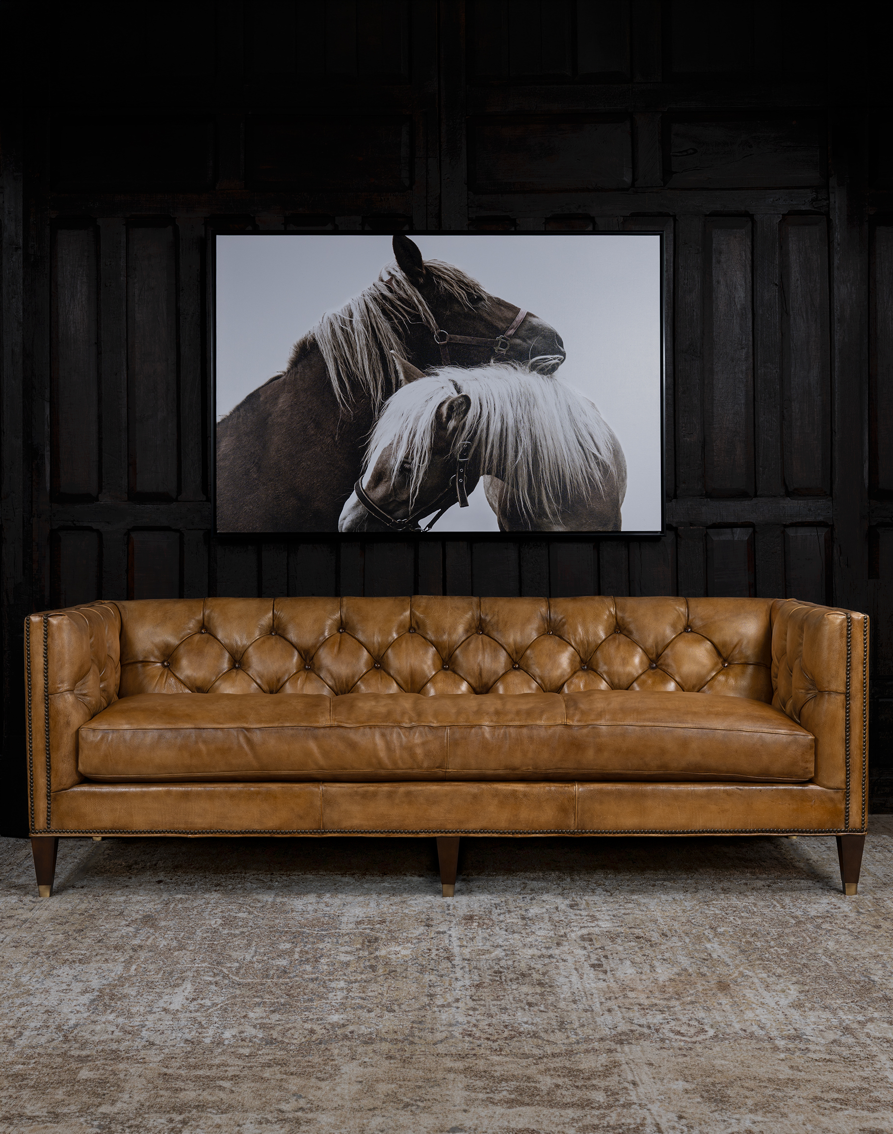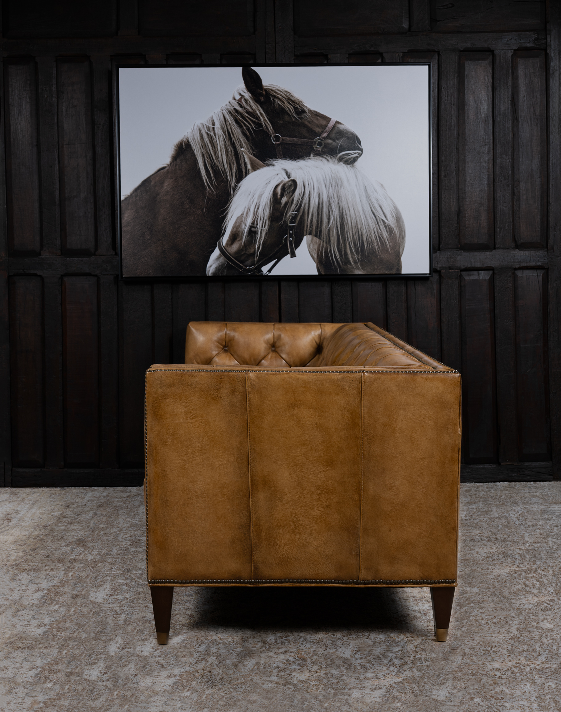 The Kingston Black Tufted Leather Sofa is a bold expression of refined Western luxury. Upholstered in full-grain leather dyed in an elegant obsidian b..