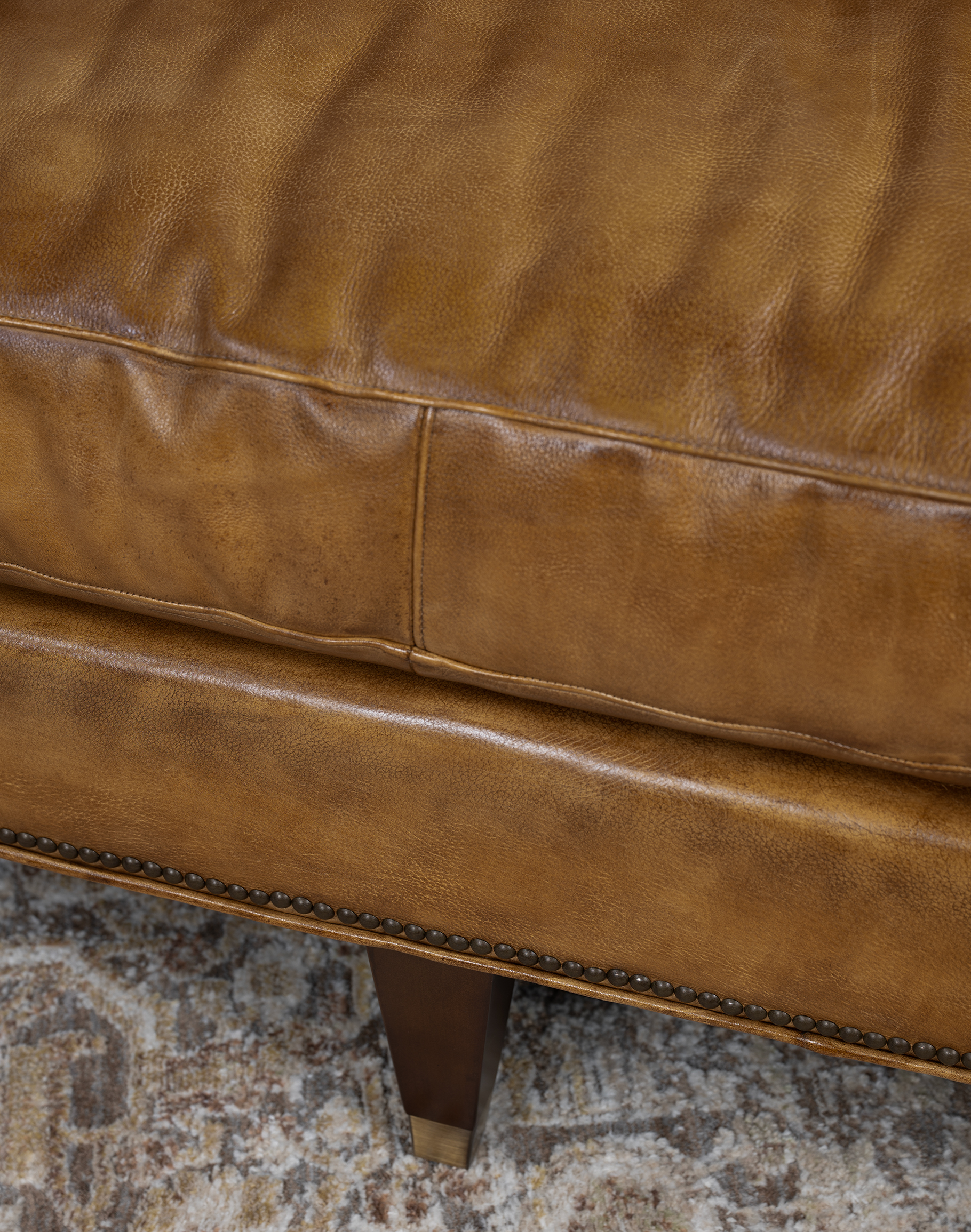 Leather Description: Artisan Leathers beautifully evoke this time worn quality, unique to every individual piece, like the originals. To pure aniline leather crusts, already fully and carefully upholstered to the piece, a base color is created with multiple applications of waxes and oils, hand-worked by the leather Artisan. After drying, this craftsman then carefully builds-up the finish with an expert's eye, and touch, to achieve an aged patina in just the right places to reflect the aged qualities only time, wear, and frequent care could have accomplished naturally.