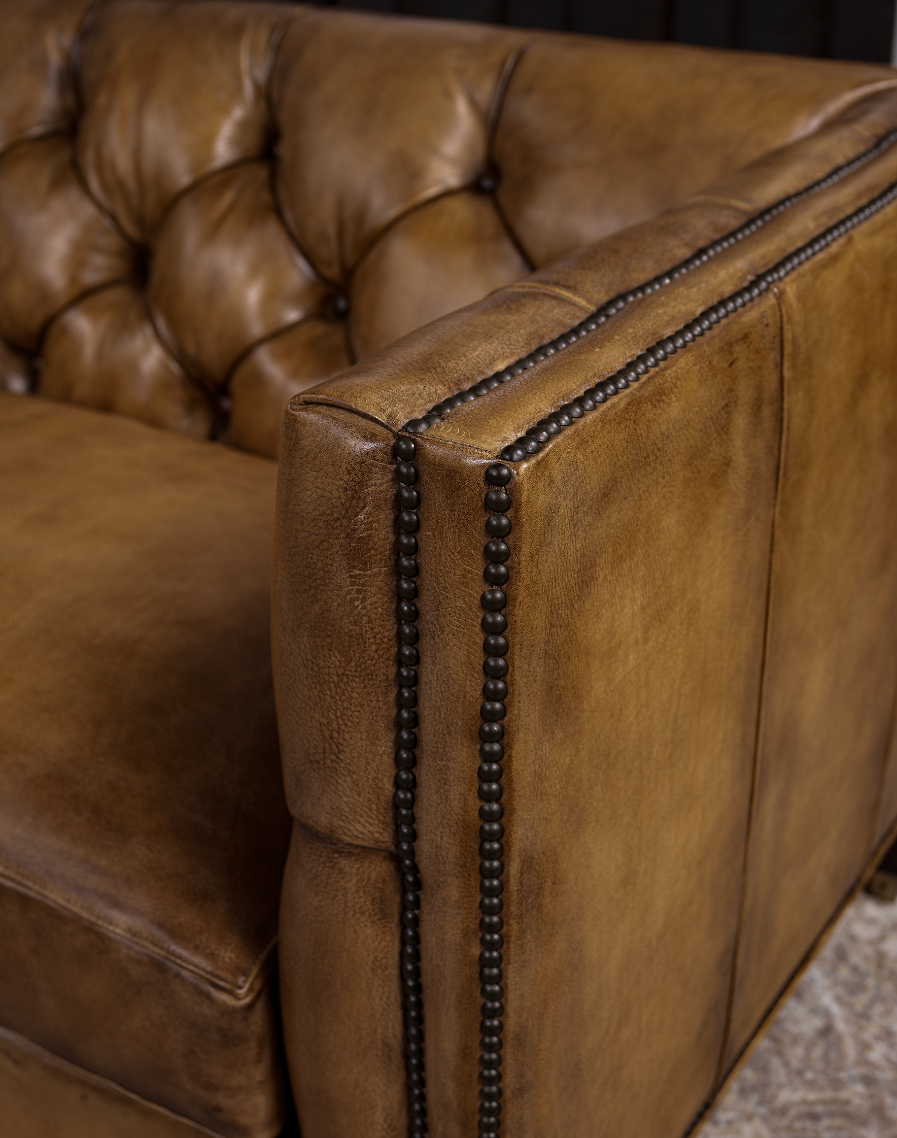 4. Elegant Details: Deep button tufts on the inside seat back and arms, along with brass nail tacks, elevate its overall aesthetic.