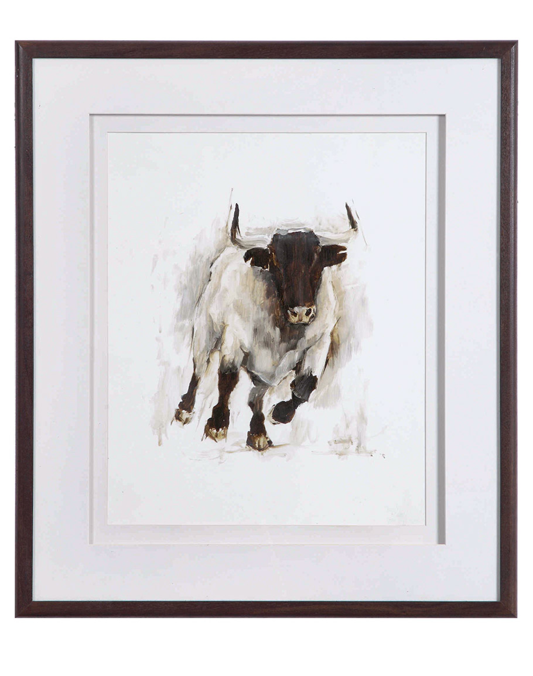 Neutral brown, white, and gray tones are used in this modern lodge style framed print. The print is complemented by double white matting with a simple wood frame and is placed under glass.