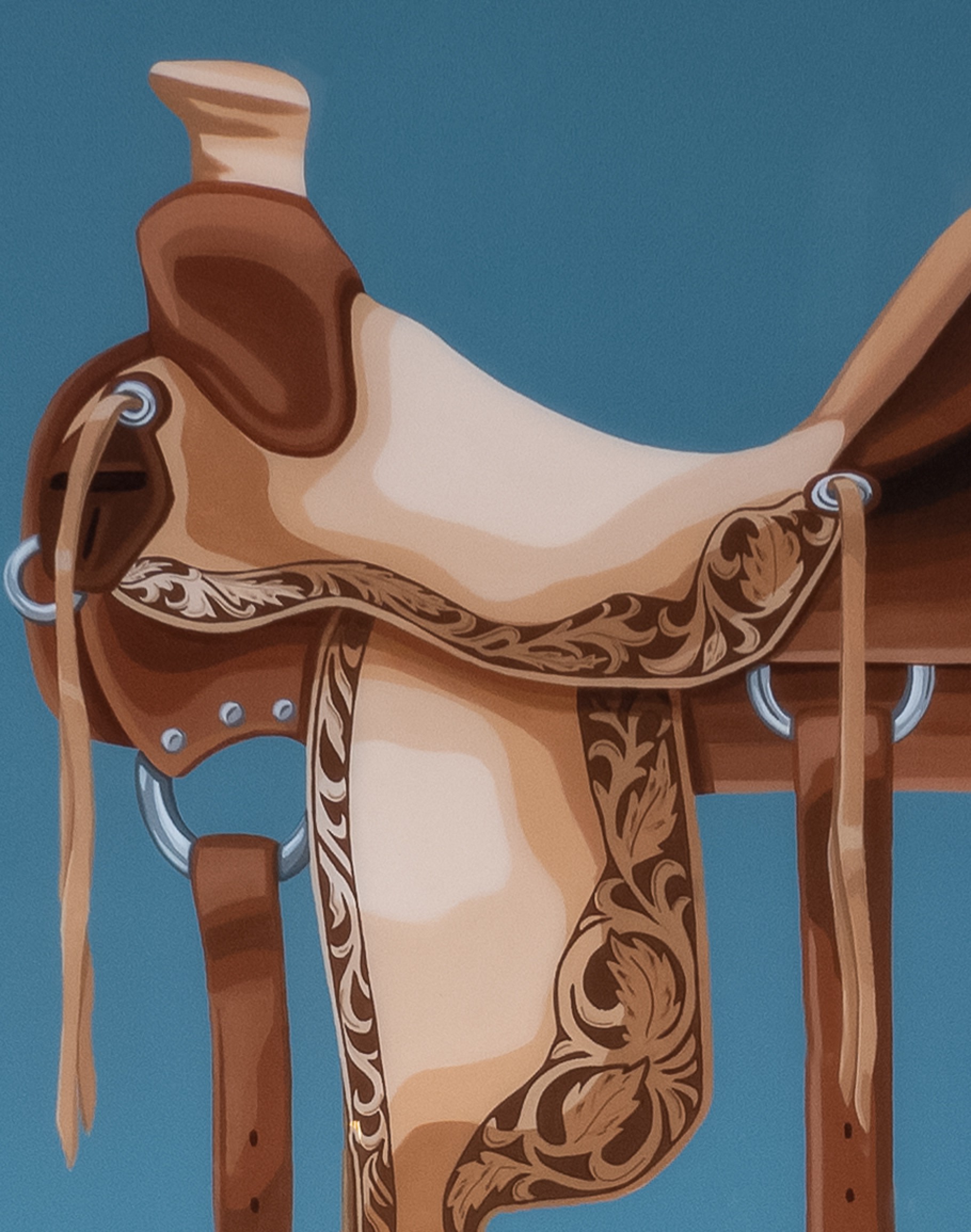 Enhance your interior decor with the exquisite Saddle Sky Framed Art Piece. This stunning vertical artwork features a beautifully detailed depiction of a western saddle set against a serene sky blue background. The piece is elegantly framed with a mat back wood frame, providing a sophisticated touch that complements any room.