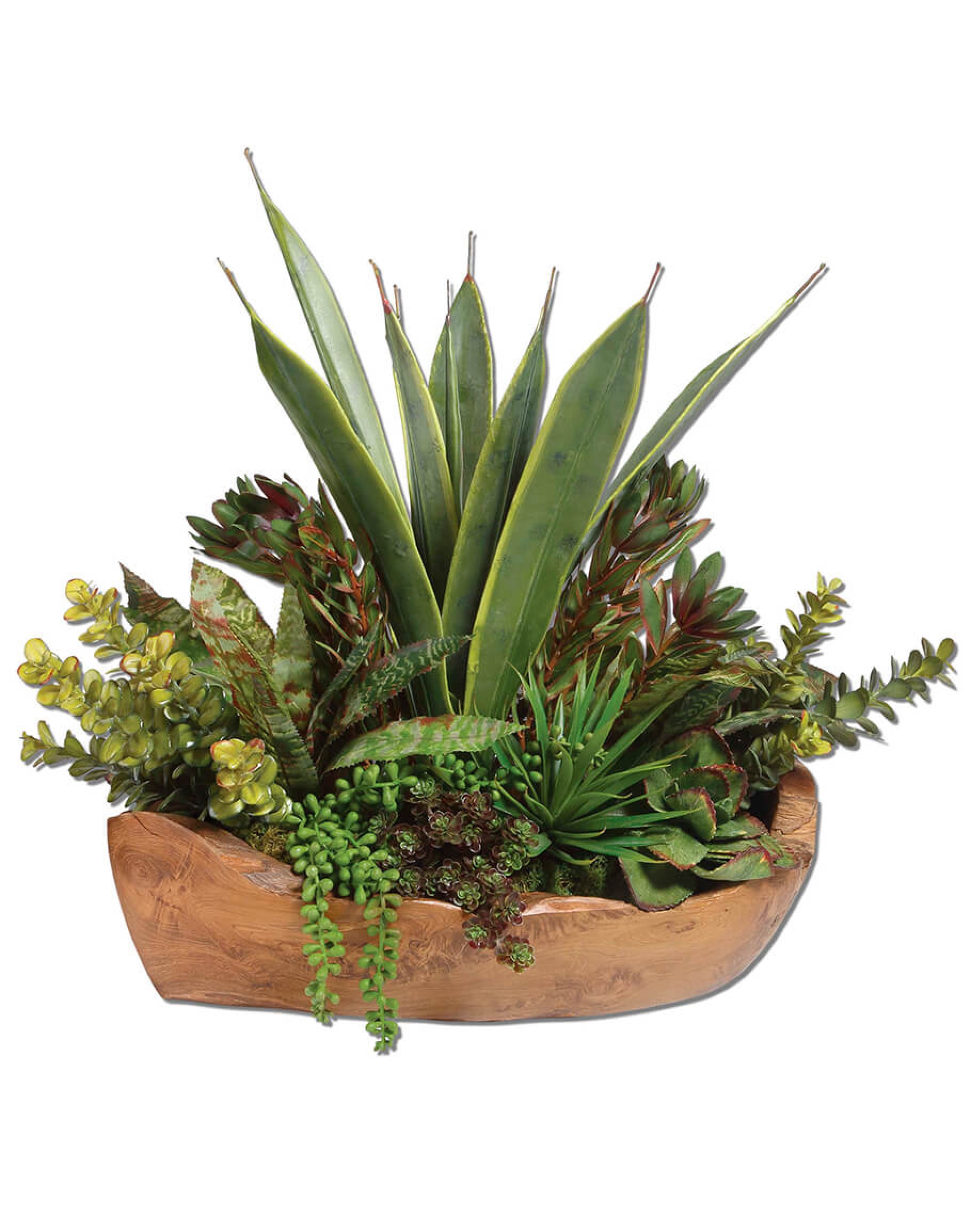 Dense and lush mix of succulent plants including aloe, jade, bromeliad, string of pearls and others in a hand carved, natural teak bowl.