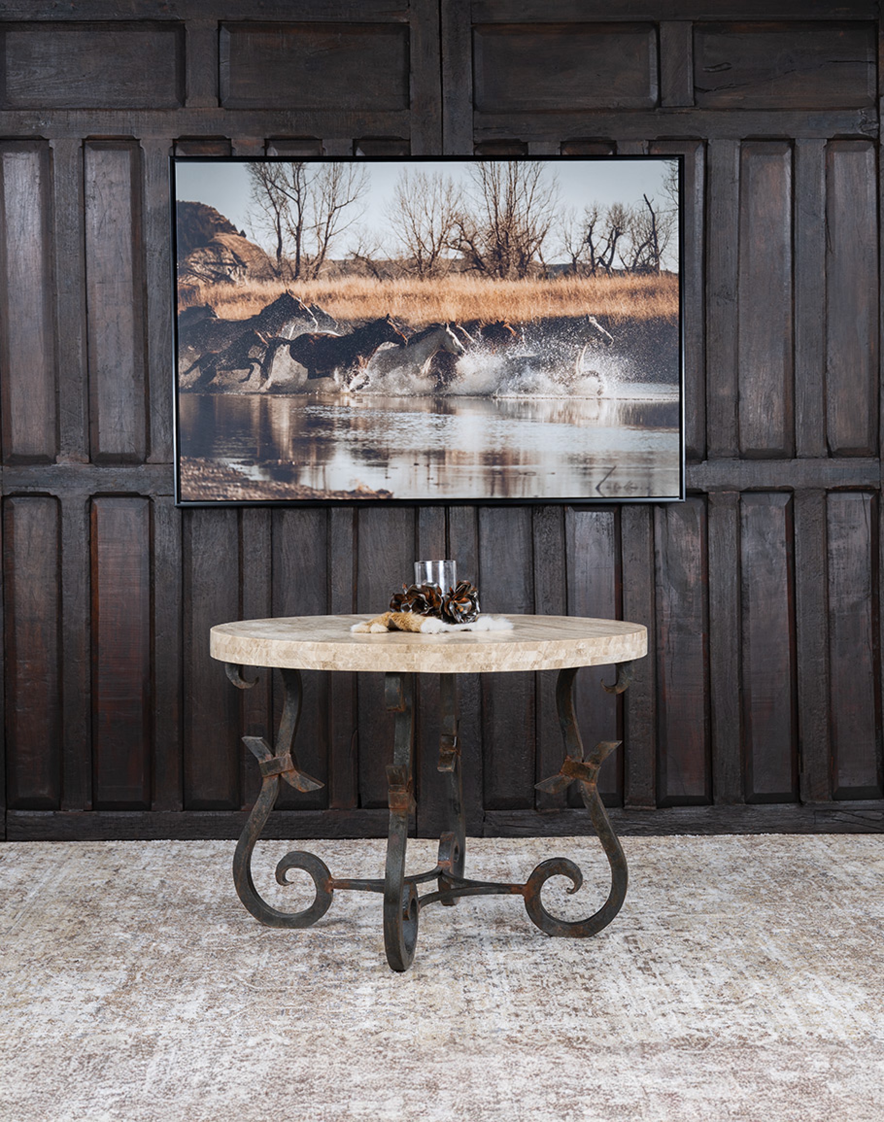 Bring artisan Western elegance to the center of your home with our Sandstone Travertine Round Dining Table. A naturally textured, honed travertine surface in warm sandstone-beige tones is expertly cut and set over a reinforced core for exceptional stability and everyday durability. The round top features a smooth eased edge that highlights the stone’s organic veining—soft ivory currents and sun-warmed caramel movement—while the hand-forged iron base adds sculptural strength with a rich, aged patina. The result is a timeless, high-end dining statement that feels collected, grounded, and built to last.