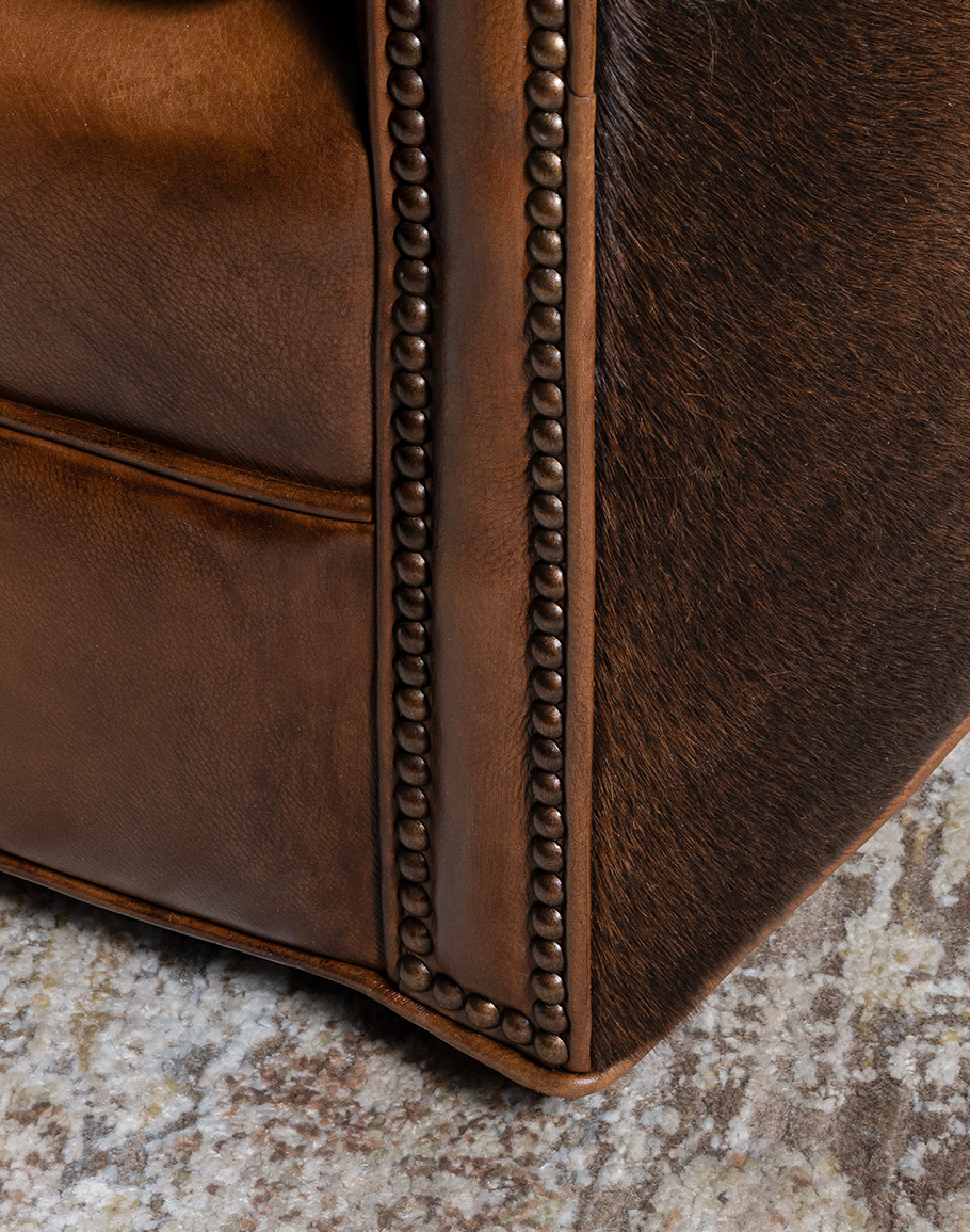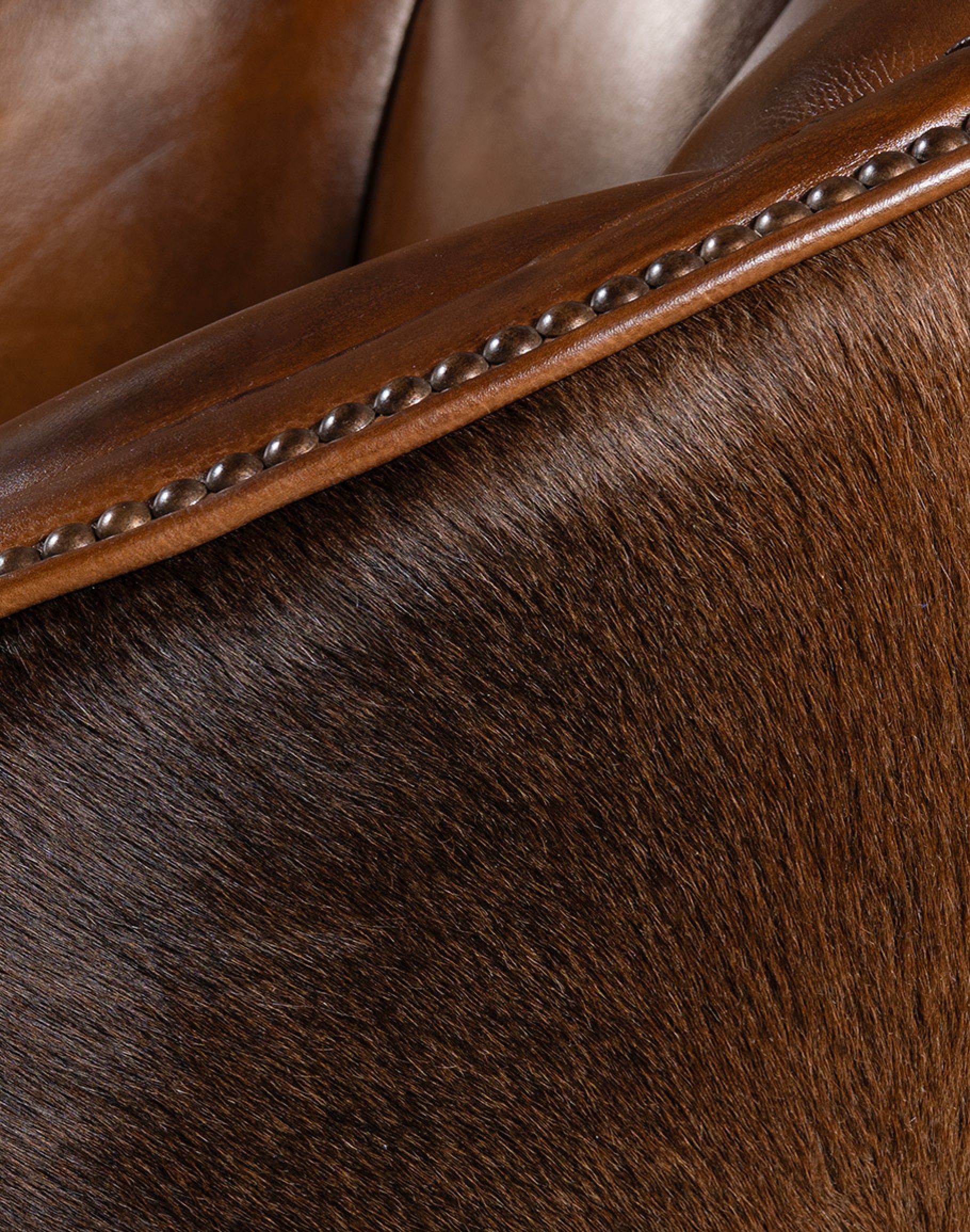 The exterior back panel is wrapped in genuine dark brindle cowhide, introducing depth and organic texture with deep espresso and chocolate undertones. This contrast between the smooth saddle leather and the natural cowhide creates a bold two-tone design that feels both rustic and refined—perfect for Western, ranch, mountain, or upscale lodge interiors.