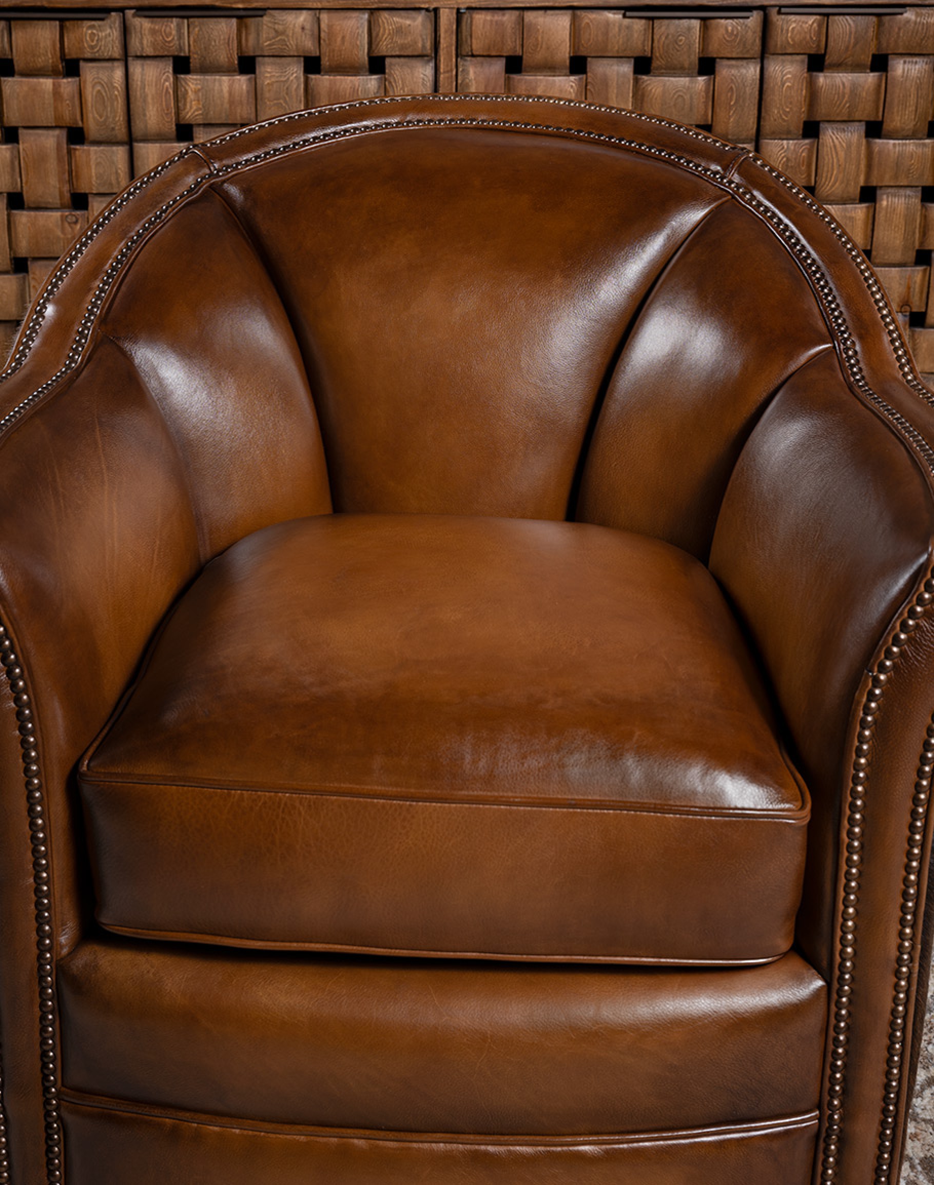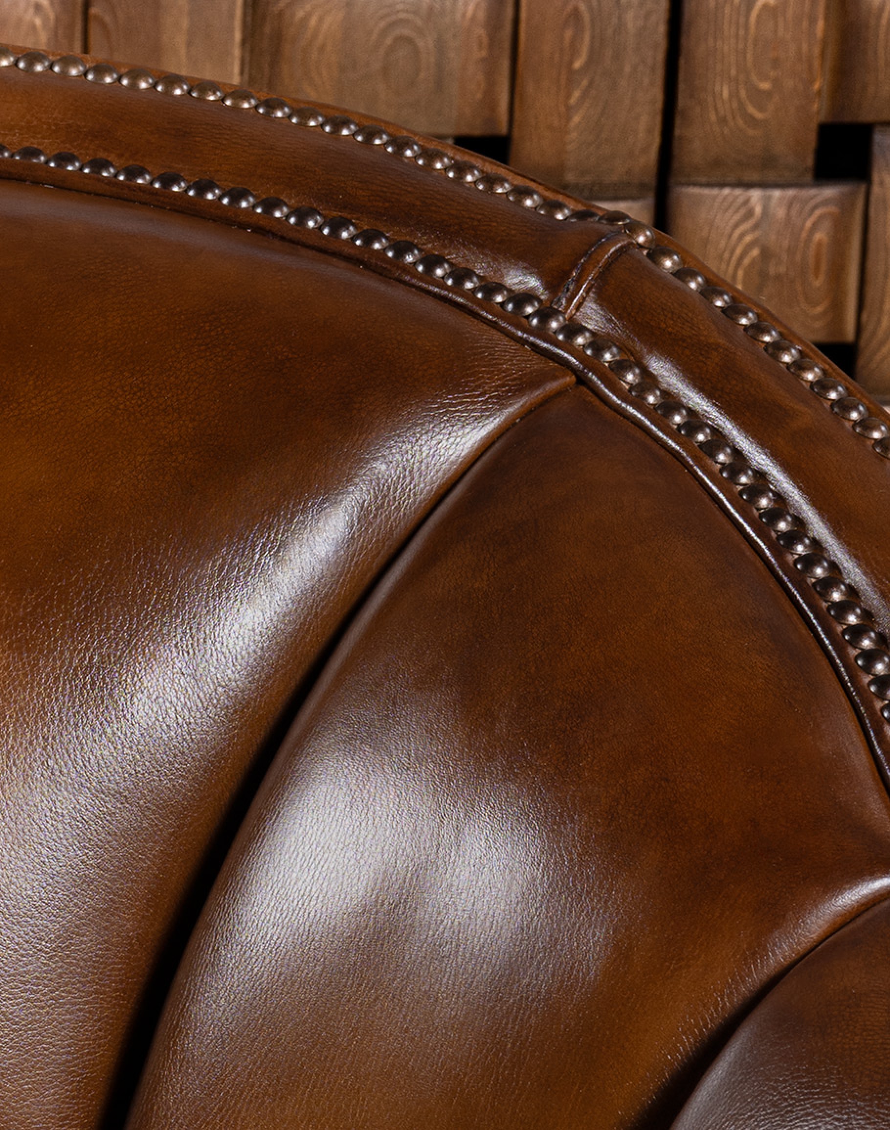 Upholstered in rich brown full-grain leather, the Sheridan features a warm, medium-toned cognac hue with subtle burnishing that highlights the natural character of the hide. The interior seat, back, and arms showcase smooth, top-grain leather with a soft hand and natural sheen, offering both durability and elevated comfort.