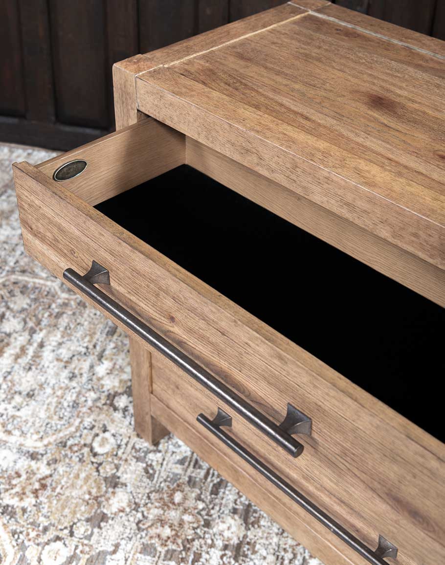 This piece features three self-closing drawers, providing ample storage for your essentials. The top drawer includes a removable black felt liner, adding an extra layer of protection for delicate items. The rustic hammered bar pulls and subtle metal stretchers add to its authenticity, reflecting the influence of Spanish missions and the earthy architecture of Sonoma and Napa Valley.