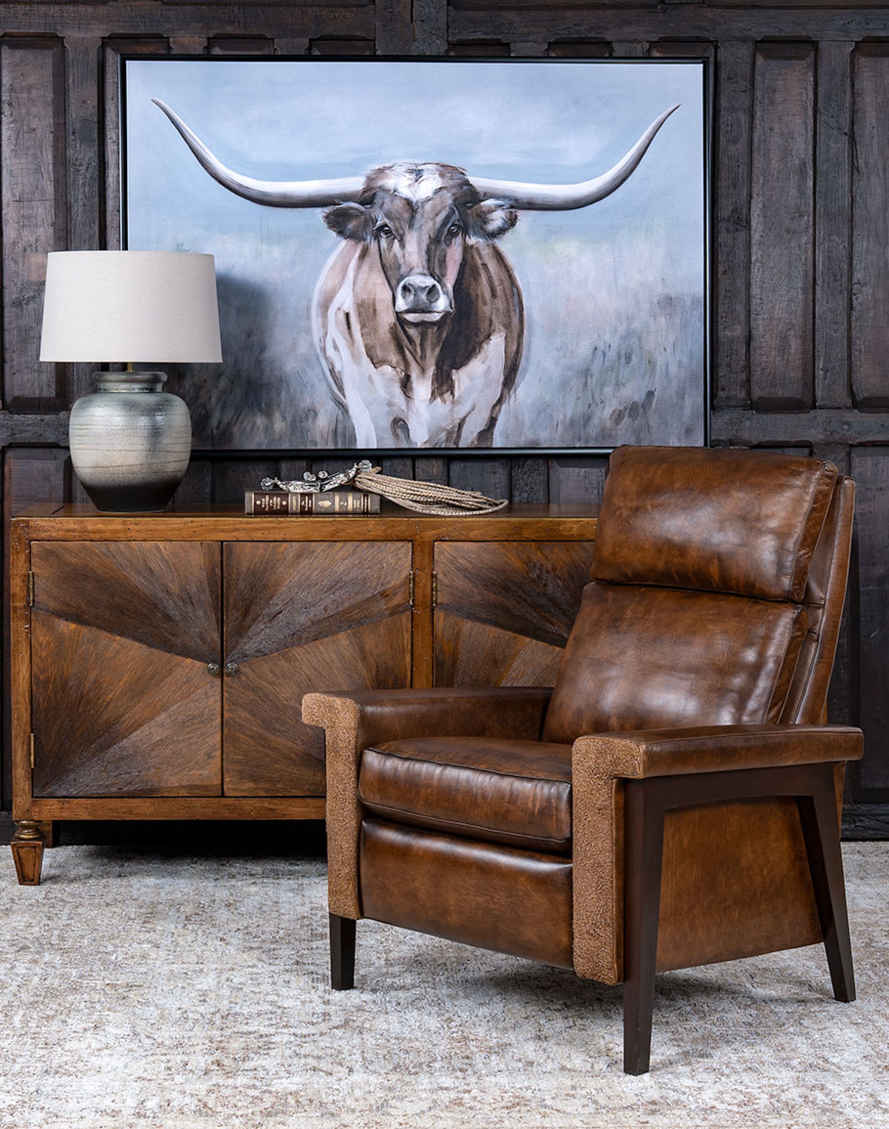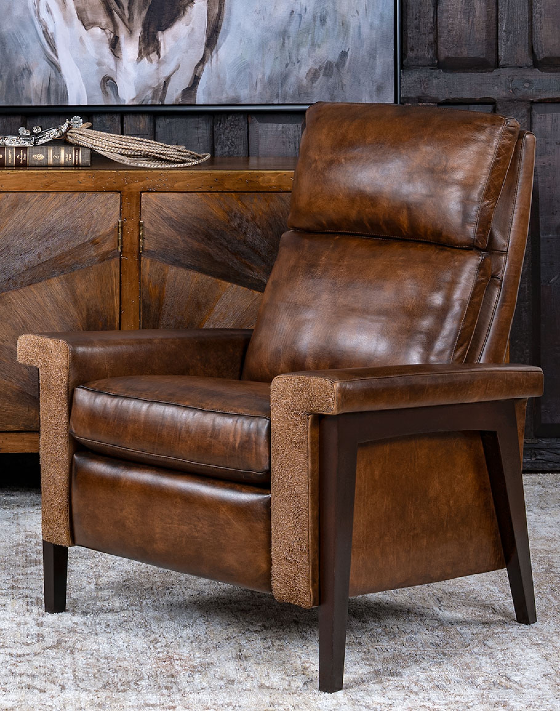 Experience the ultimate in relaxation with our Slayden Rough Out Leather Recliner. Its sleek silhouette blends seemingly into mountain, desert, refined, and eclectic ranch styles. Upholstered with supple hand-burnished leather and rough out sueded accents in the arm panels, this recliner blends artisan craftsmanship, comfort, and appealing materials to create a centerpiece perfect for any fine decor scheme.