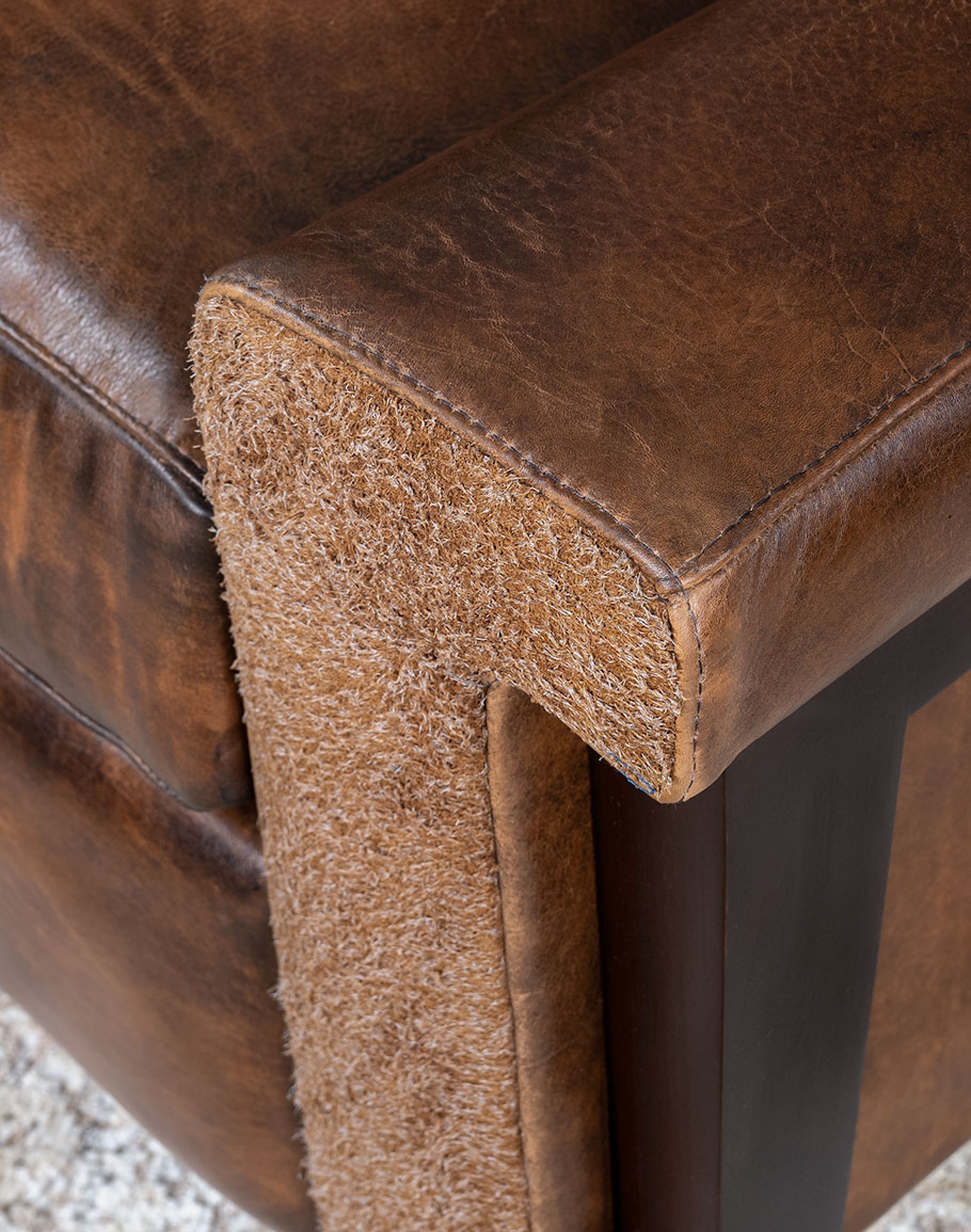 Leather Description: Artisan Leathers beautifully evoke this time worn quality, unique to every individual piece, like the originals. To pure aniline leather crusts, already fully and carefully upholstered to the piece, a base color is created with multiple applications of waxes and oils, hand-worked by the leather Artisan. After drying, this craftsman then carefully builds-up the finish with an expert's eye, and touch, to achieve an aged patina in just the right places to reflect the aged qualities only time, wear, and frequent care could have accomplished naturally.