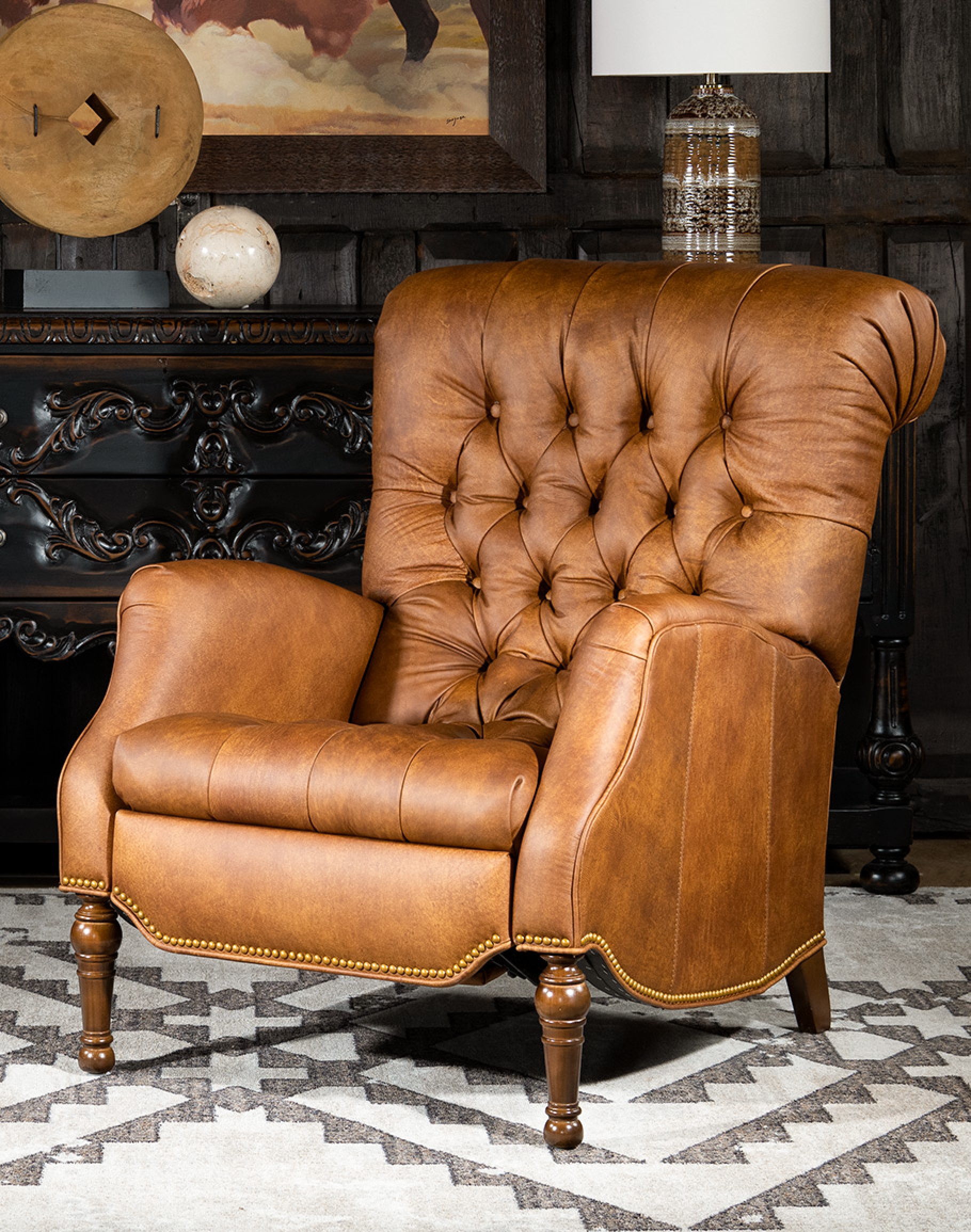 Experience the ultimate in comfort and luxury with our Sleepy Hollow Leather Recliner. Designed to be the perfect napping chair, this quality leather recliner features deep button tufting throughout the seat and seat back, adding an elegant touch to its timeless design. Crafted with luxuriously soft, tan distressed leather, the Sleepy Hollow Chair is built to last and provide you with endless hours of comfort. Its exceptional quality and expert craftsmanship ensure that this recliner will become a cherished part of your home for years to come. Order now and discover why the Sleepy Hollow Leather Recliner is the perfect addition to any living area. Whether you're looking to curl up with a good book, take a nap, or simply relax after a long day, this recliner has got you covered. 100% American Made to the highest standards of quality and craftsmanship