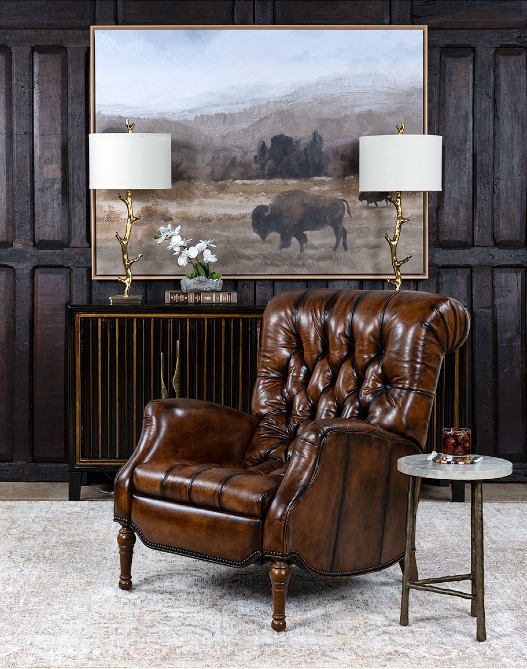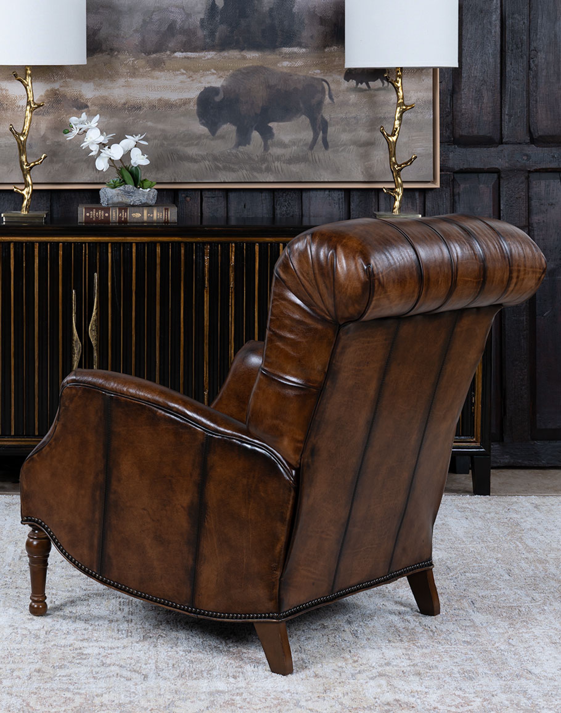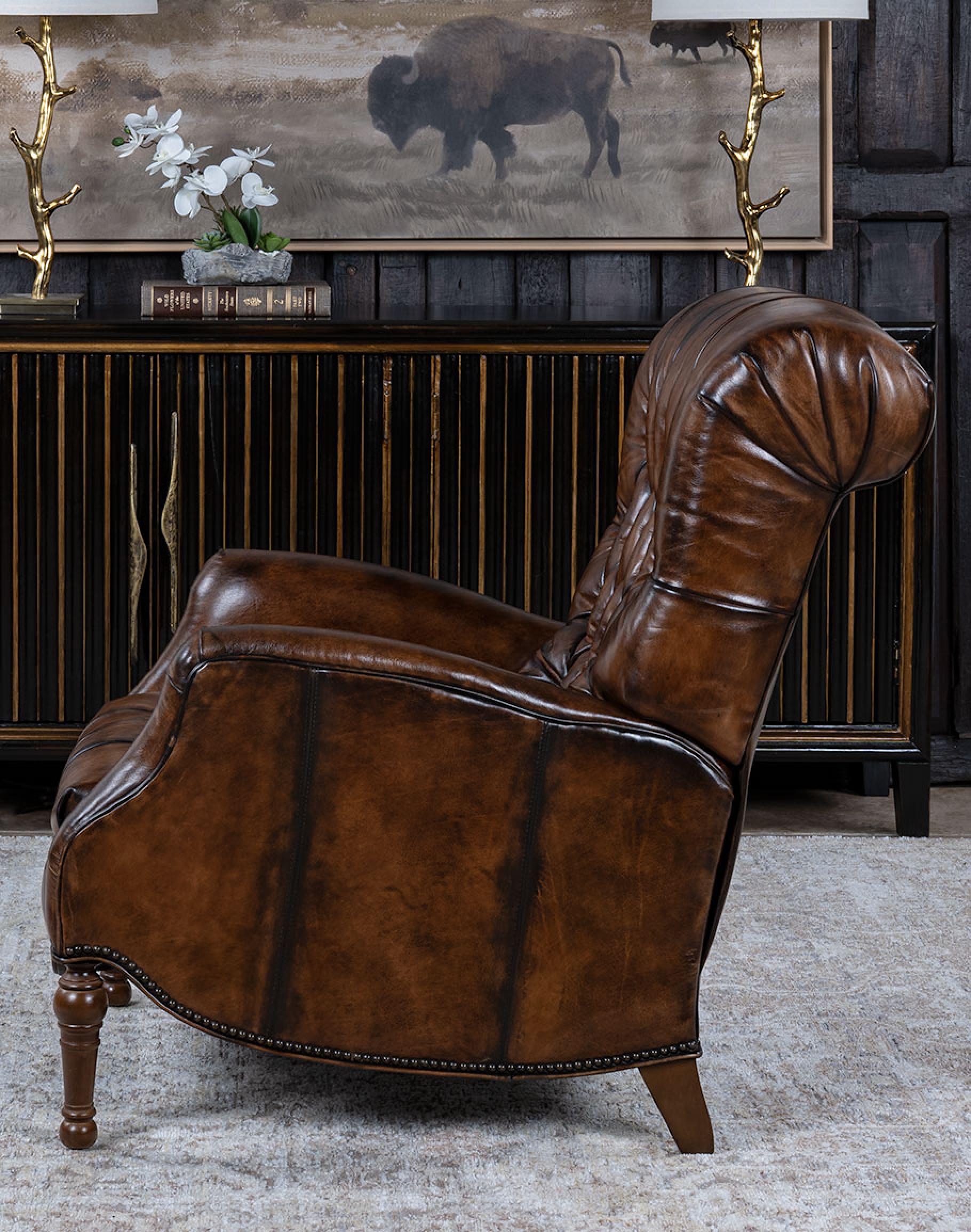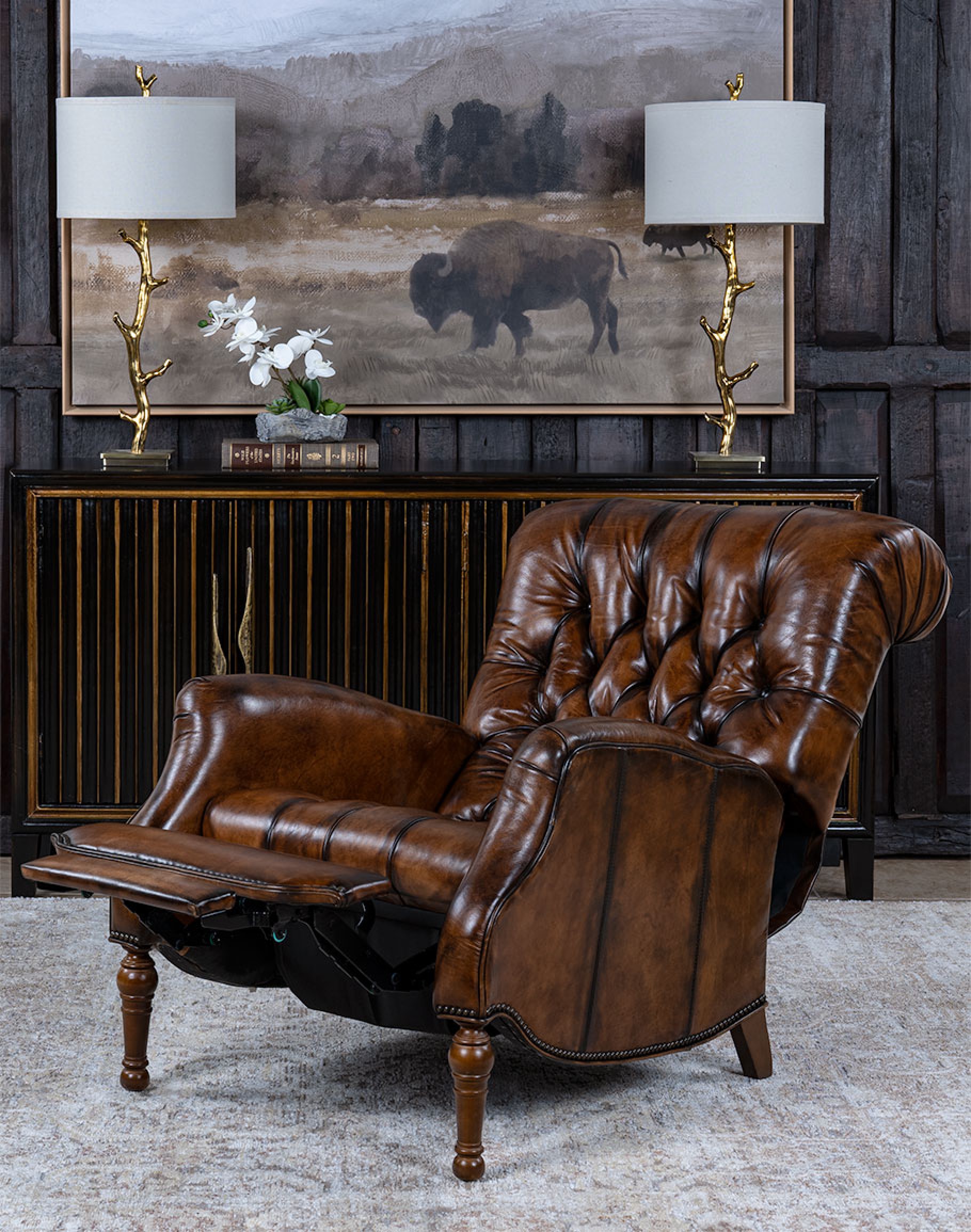 Experience the ultimate in relaxation and comfort with our classic and refined ranch-styled Sleepy Hollow Saddle Leather Recliner. Designed to be the perfect napping chair, this quality leather recliner will not just provide comfort, but also transport you to a world of tranquility and serenity. Crafted with exceptional artisan leather tanned to the highest standards of quality, the Sleepy Hollow Saddle Leather Recliner boasts a timeless design that blends comfort, style, and elegance. Its deep button tufting throughout the seat and seat back adds a touch of luxury and sophistication. Expertly crafted with 100 percent American-made materials and built to exceed our own high standards, the Sleepy Hollow Saddle Leather Recliner ensures that you'll enjoy hours of comfort and years of use. It's a true heirloom in the making. At Adobe Interiors, we create the furniture, and you create the memories.