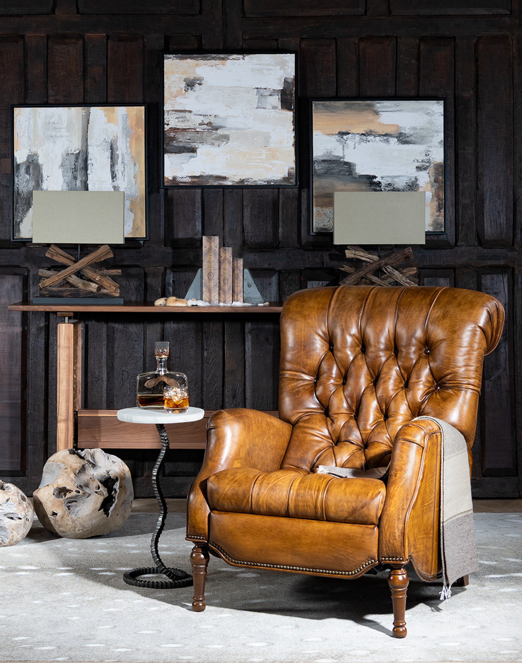 Leather Description: Artisan Leathers beautifully evoke this time worn quality, unique to every individual piece, like the originals. To pure aniline leather crusts, already fully and carefully upholstered to the piece, a base color is created with multiple applications of waxes and oils, hand-worked by the leather Artisan. After drying, this craftsman then carefully builds-up the finish with an expert's eye, and touch, to achieve an aged patina in just the right places to reflect the aged qualities only time, wear, and frequent care could have accomplished naturally.