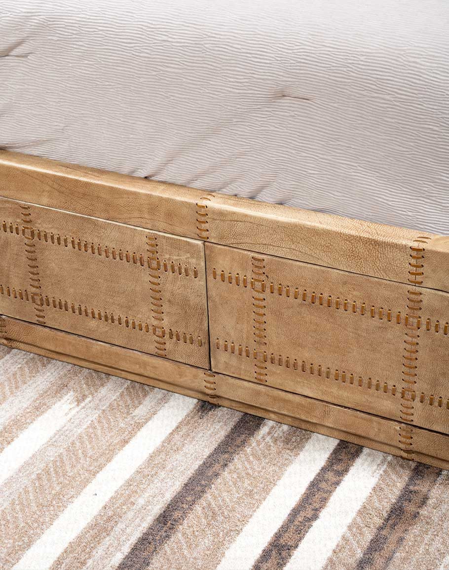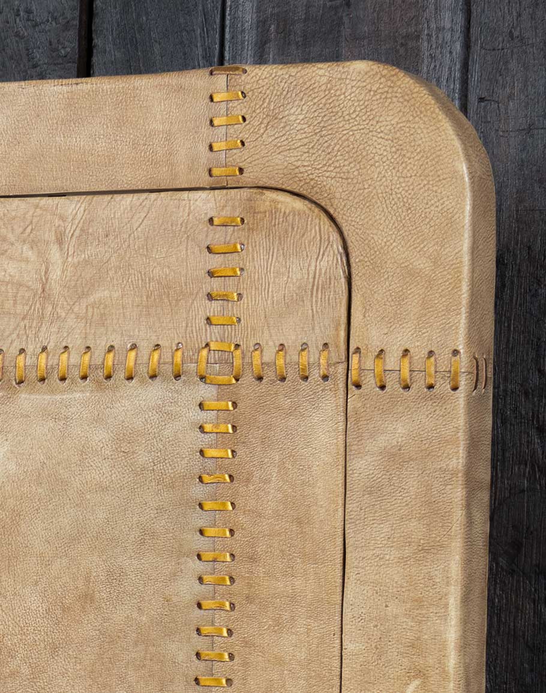Leather Description: Tanned on premium South American full-grain leather, celebrated for its unmatched durability and natural beauty. This thick saddle leather is meticulously hand-dyed and burnished to perfection, revealing a rich, light palomino color that highlights its authentic grain patterns and natural variations. The hand-finishing process ensures each piece is unique, adding a warm, rustic charm while preserving the leather's supple texture and luxurious appeal. This high-quality leather not only enhances the bed's aesthetic but also ensures a timeless elegance that will age gracefully over time.