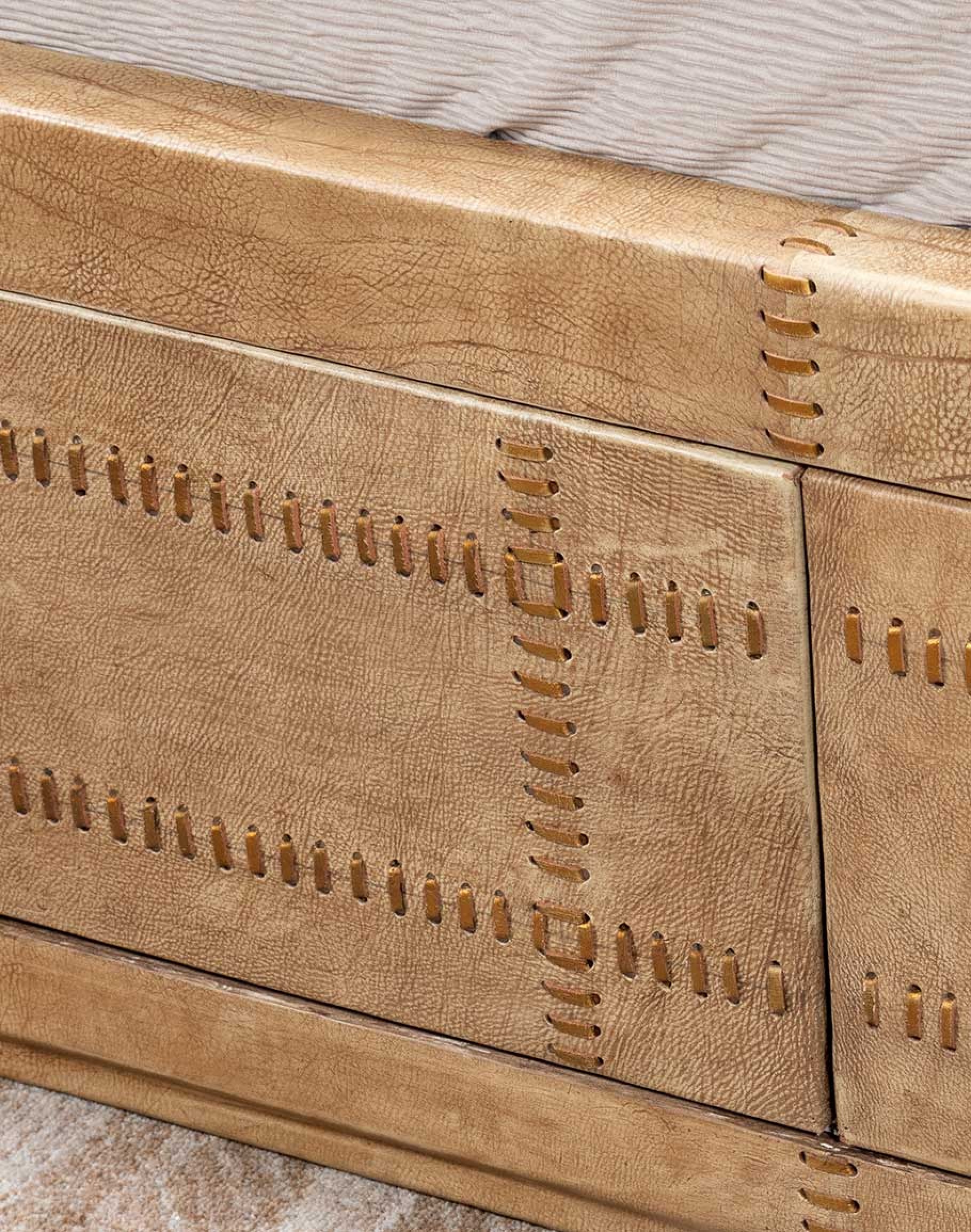 Transform your bedroom into a luxurious retreat with the Sonora Sand Leather Bed. This exquisite piece is masterfully crafted from solid wood and fully wrapped in thick, hand-selected saddle leather in a warm palomino hue. Designed for discerning tastes, the bed showcases meticulous attention to detail with contrasting leather laces intricately woven into a refined stitch pattern, adding a touch of artisanal charm to its bold, rustic elegance.