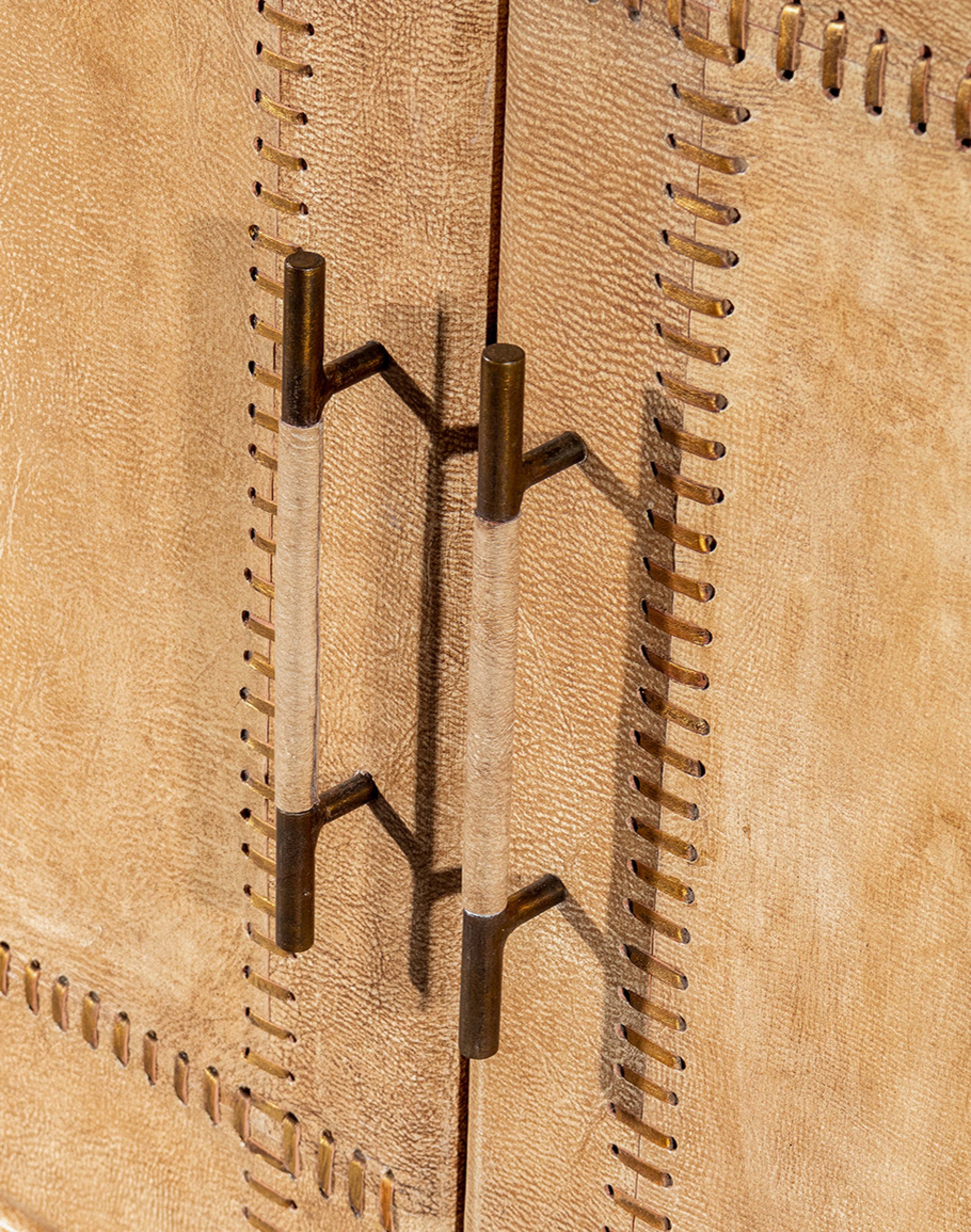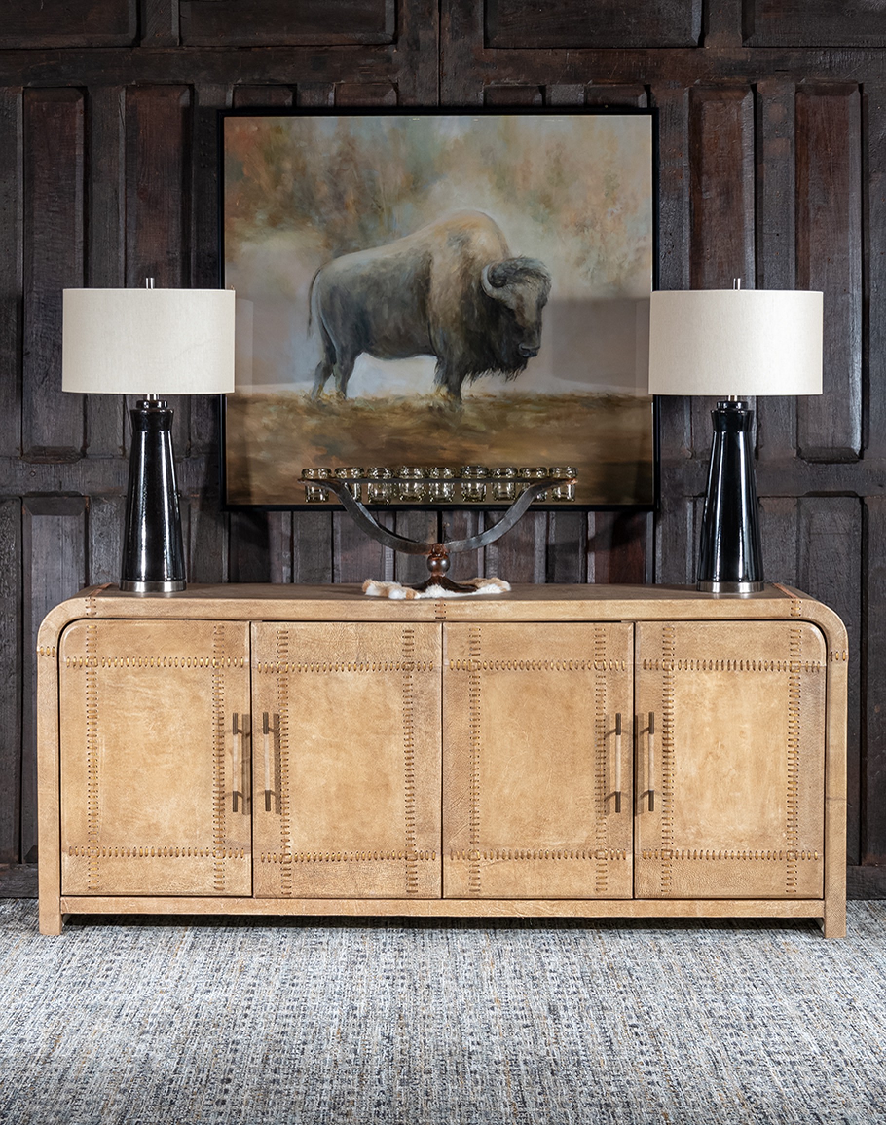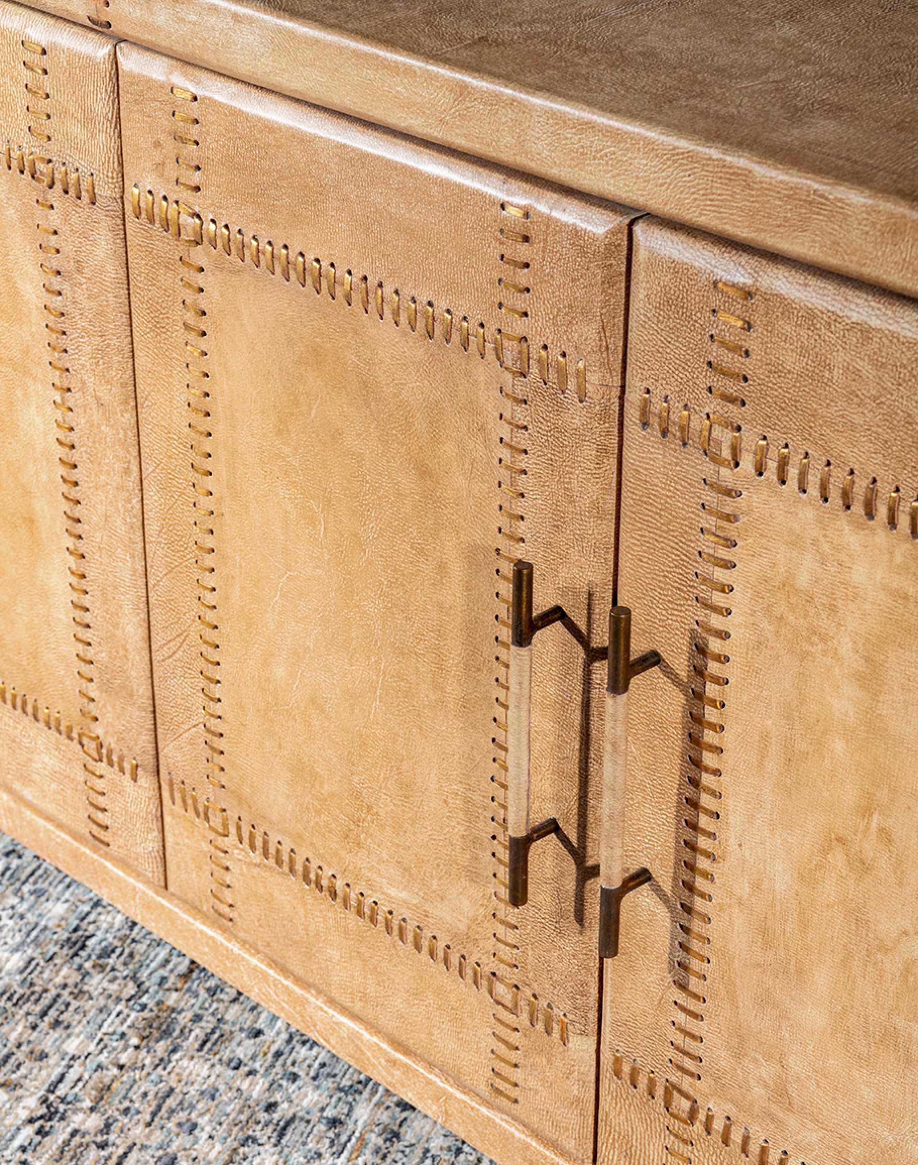 Practical Storage: Four doors with leather-wrapped handles provide easy access to ample storage space.