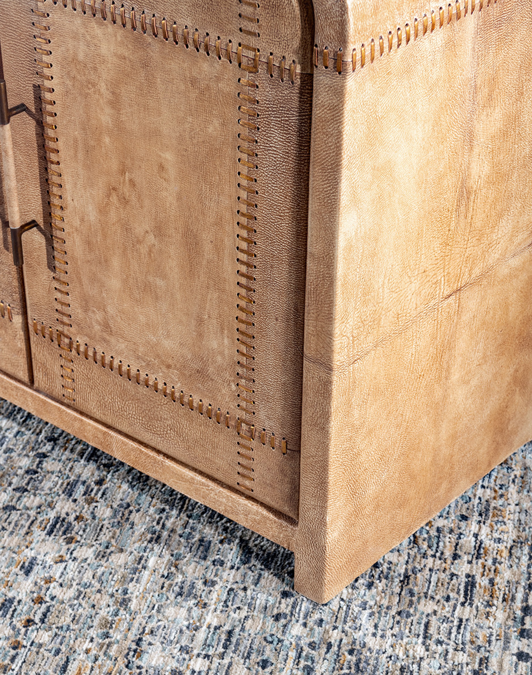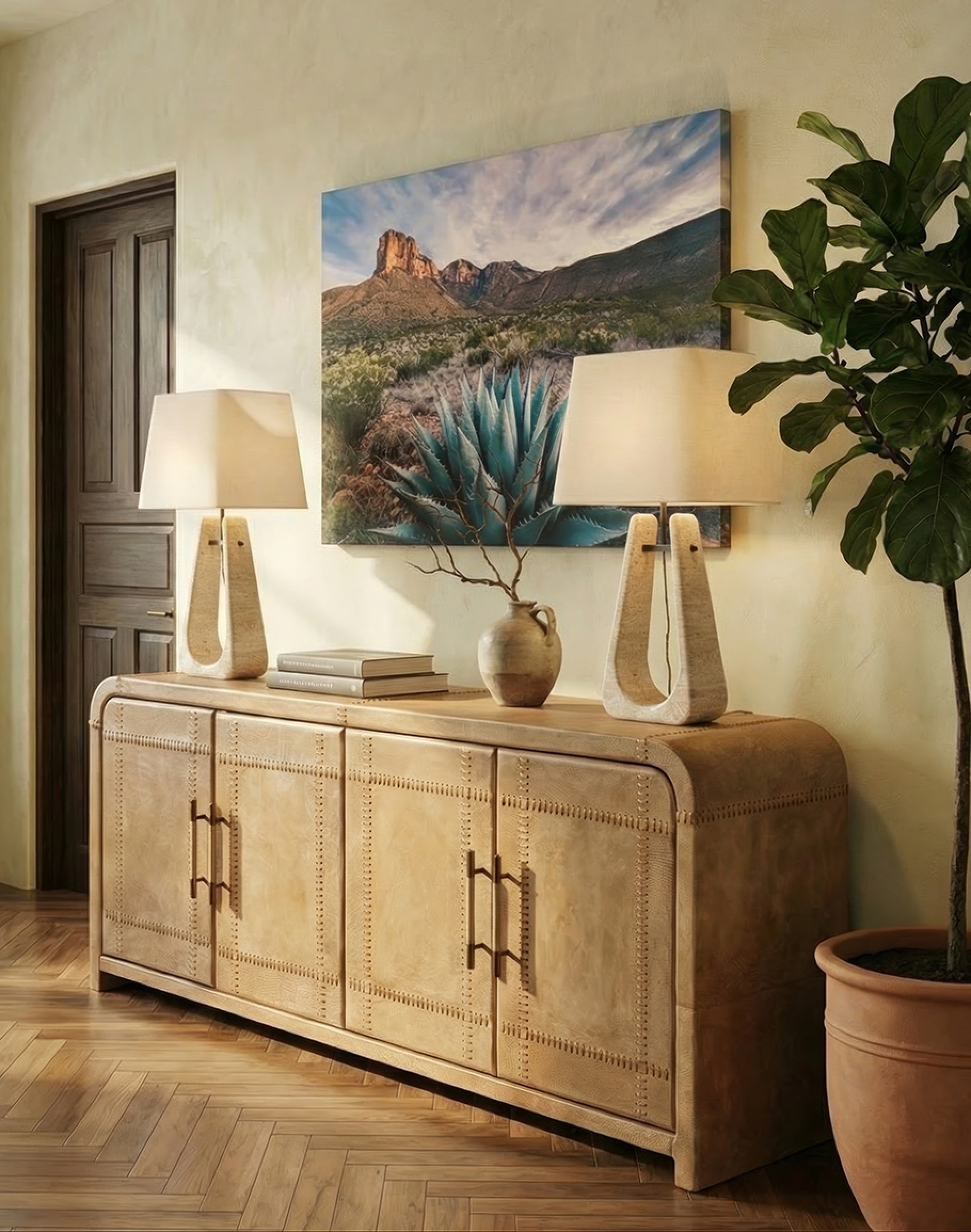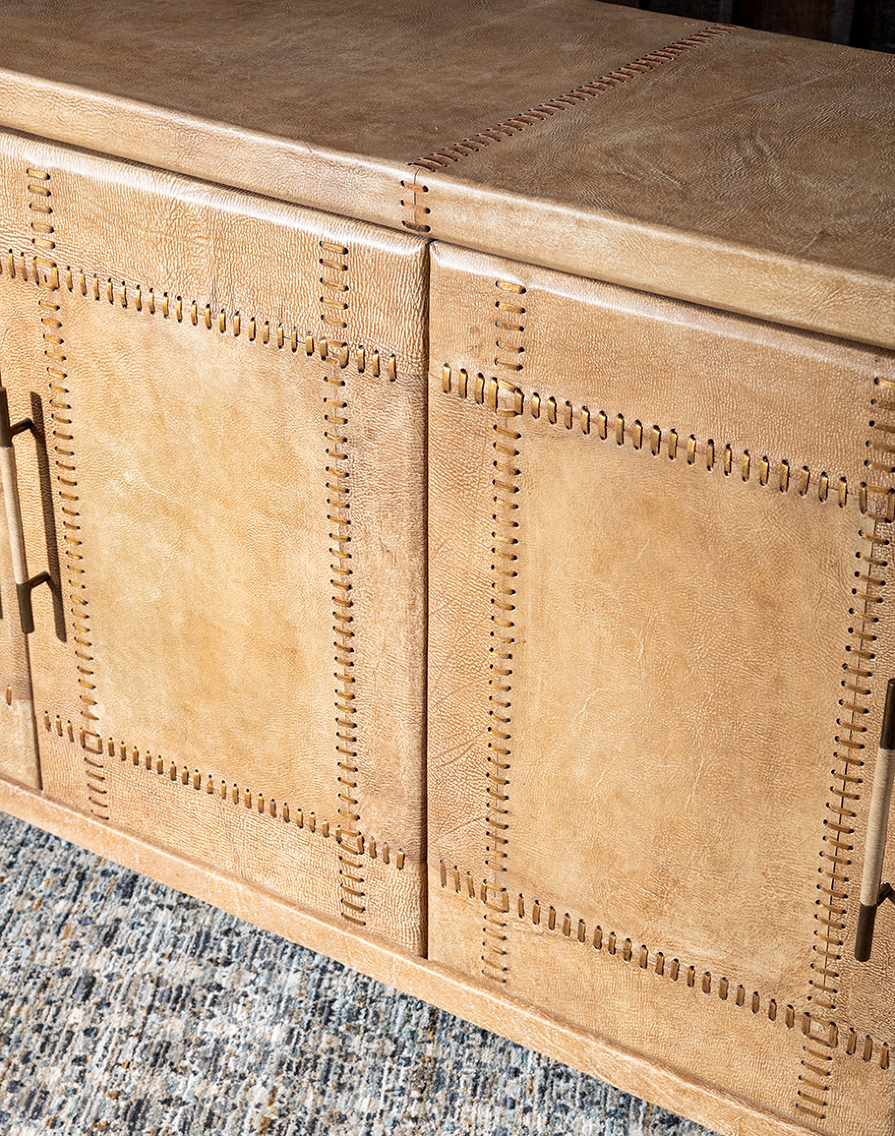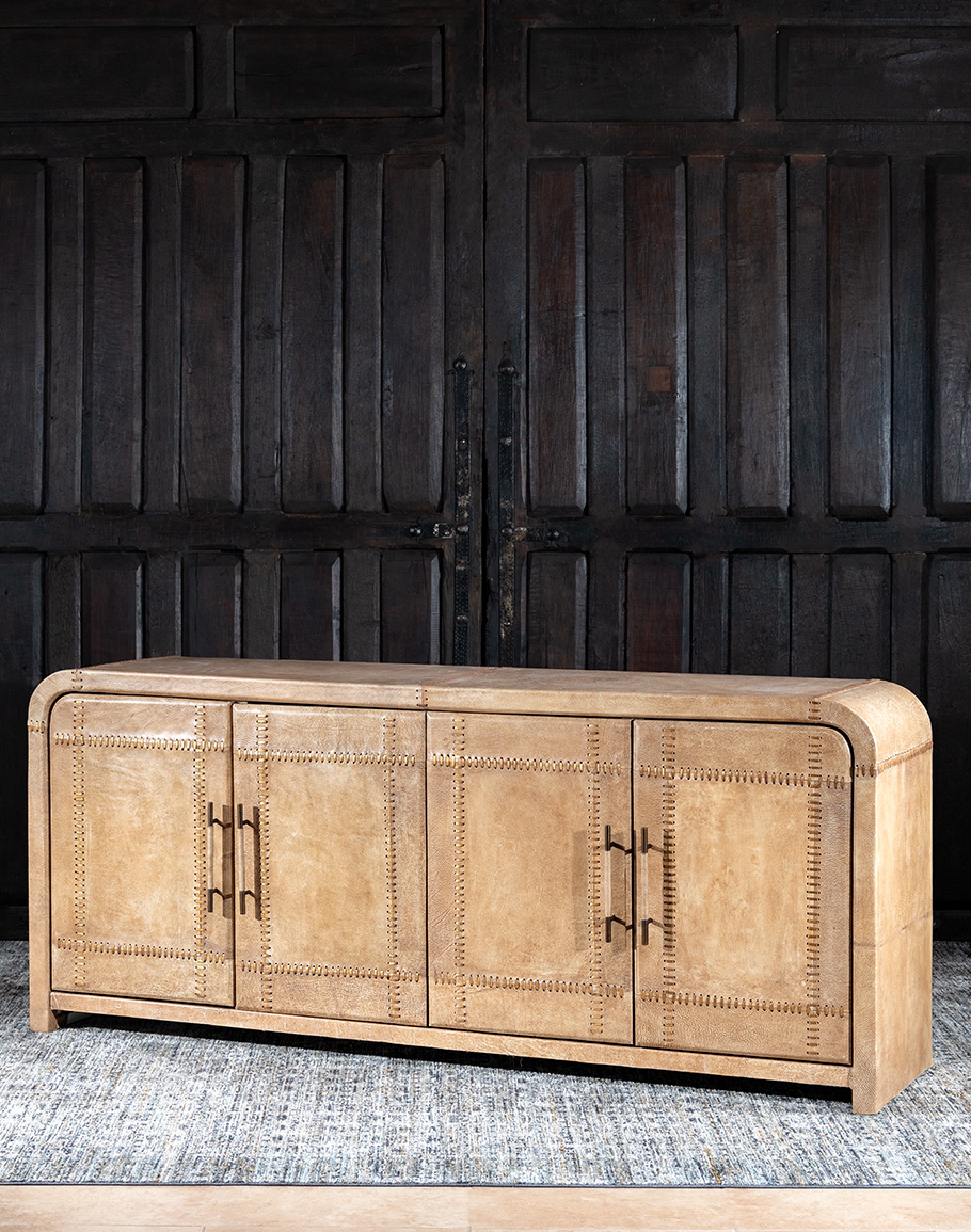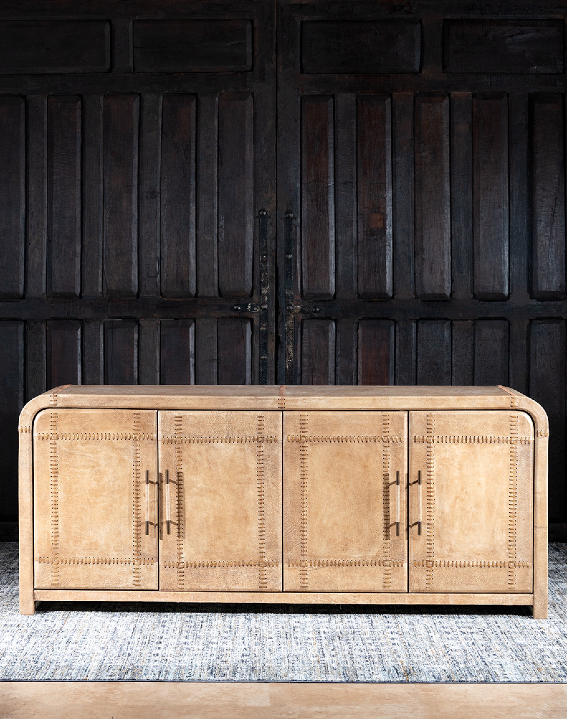 The Sonora Sand Buffet is not just about looks; functionality meets design with its spacious four-door storage. The doors, adorned with leather-wrapped handles, offer a tactile experience and reveal ample space to keep your essentials organized and out of sight, making it perfect for storage and display.