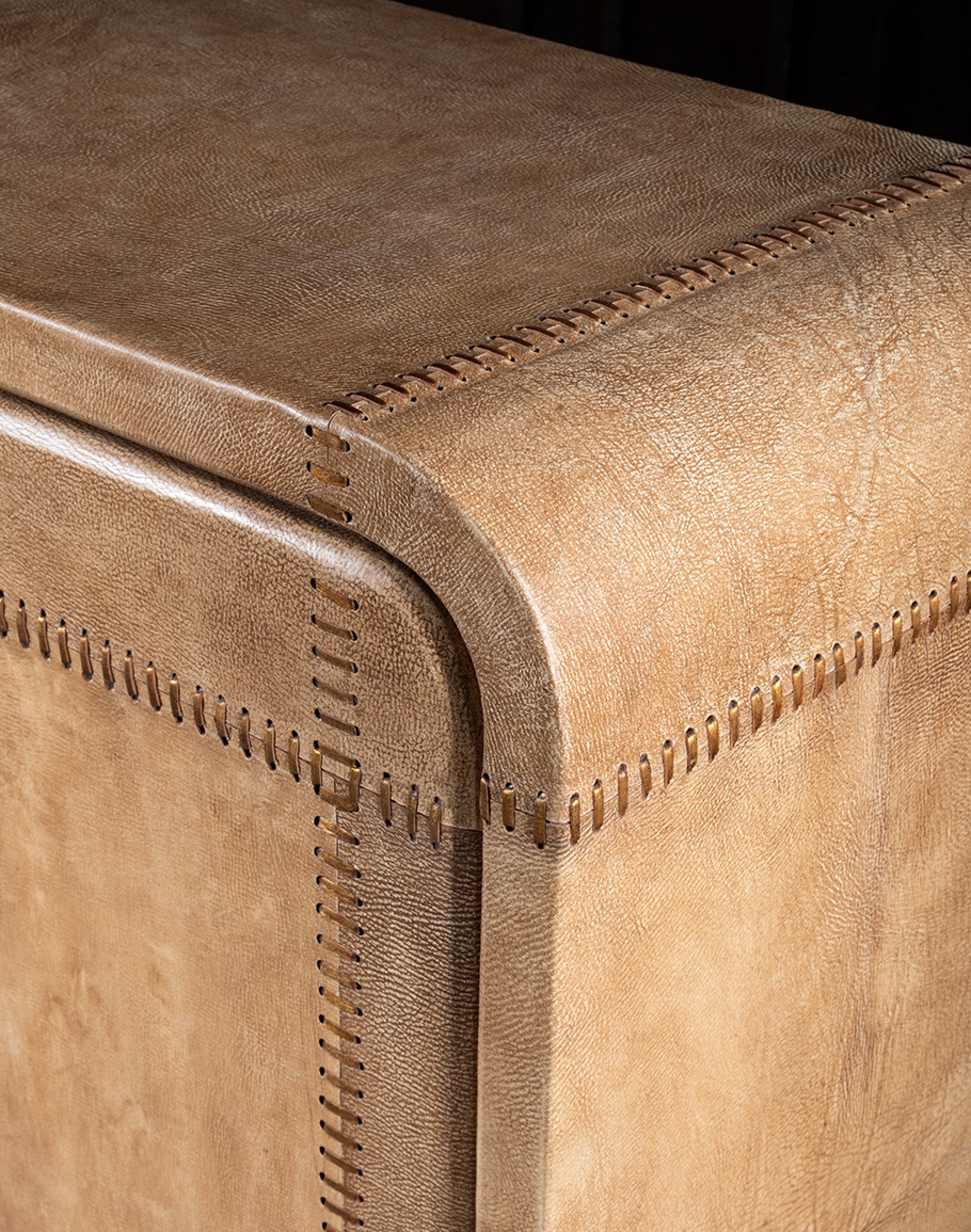 Elevate your dining or living room with the exquisite Sonora Sand Buffet, a masterpiece that seamlessly blends into sophisticated interiors. Its texture, color, and unique details make it a perfect fit for our Desert, Classic, and Eclectic Ranch collections. This luxurious buffet features soft, curved corners and is meticulously crafted from high-quality wood, ensuring durability and style. Each element of this buffet is wrapped in thick saddle leather in a chic palomino color, exuding an aura of elegance and warmth.