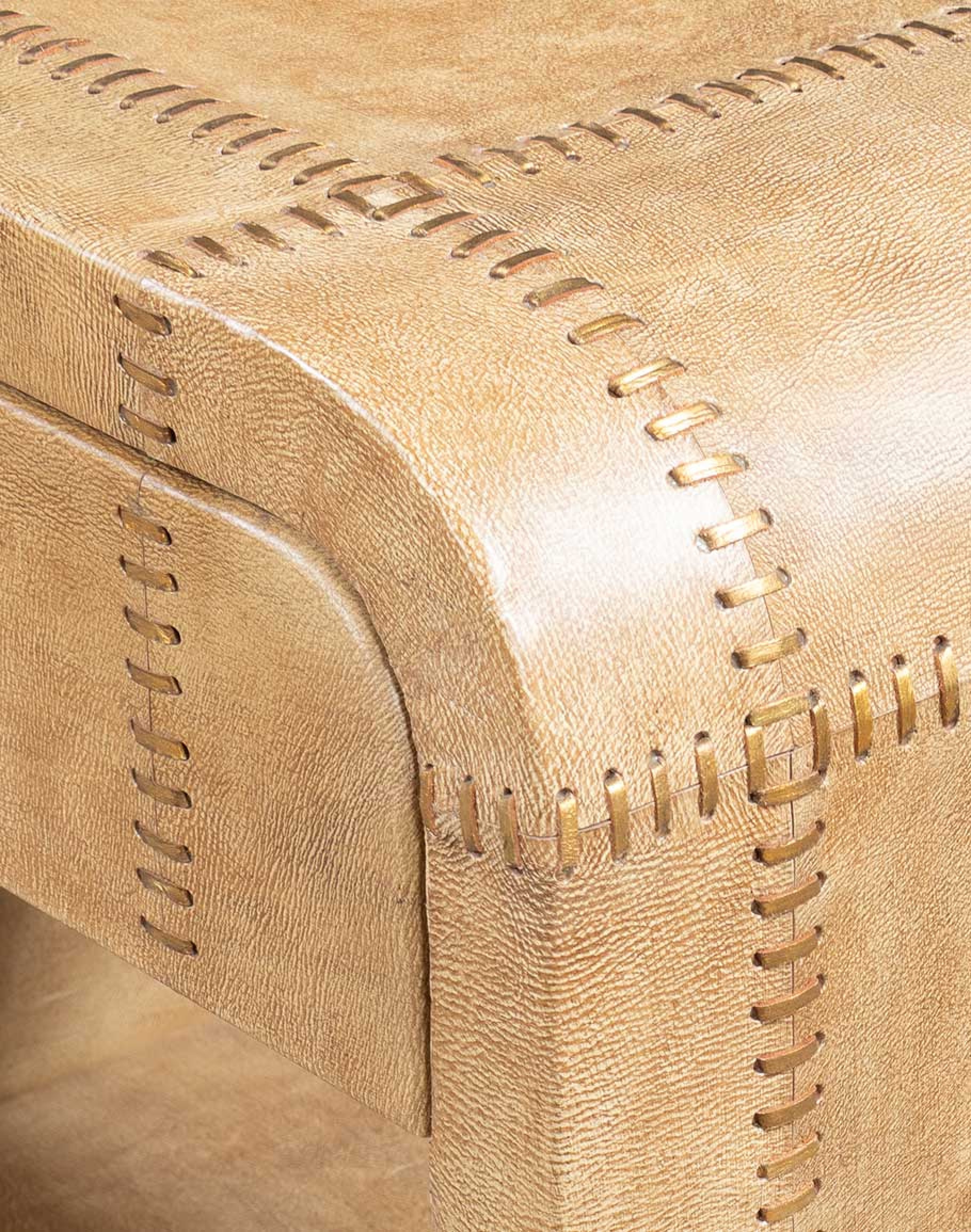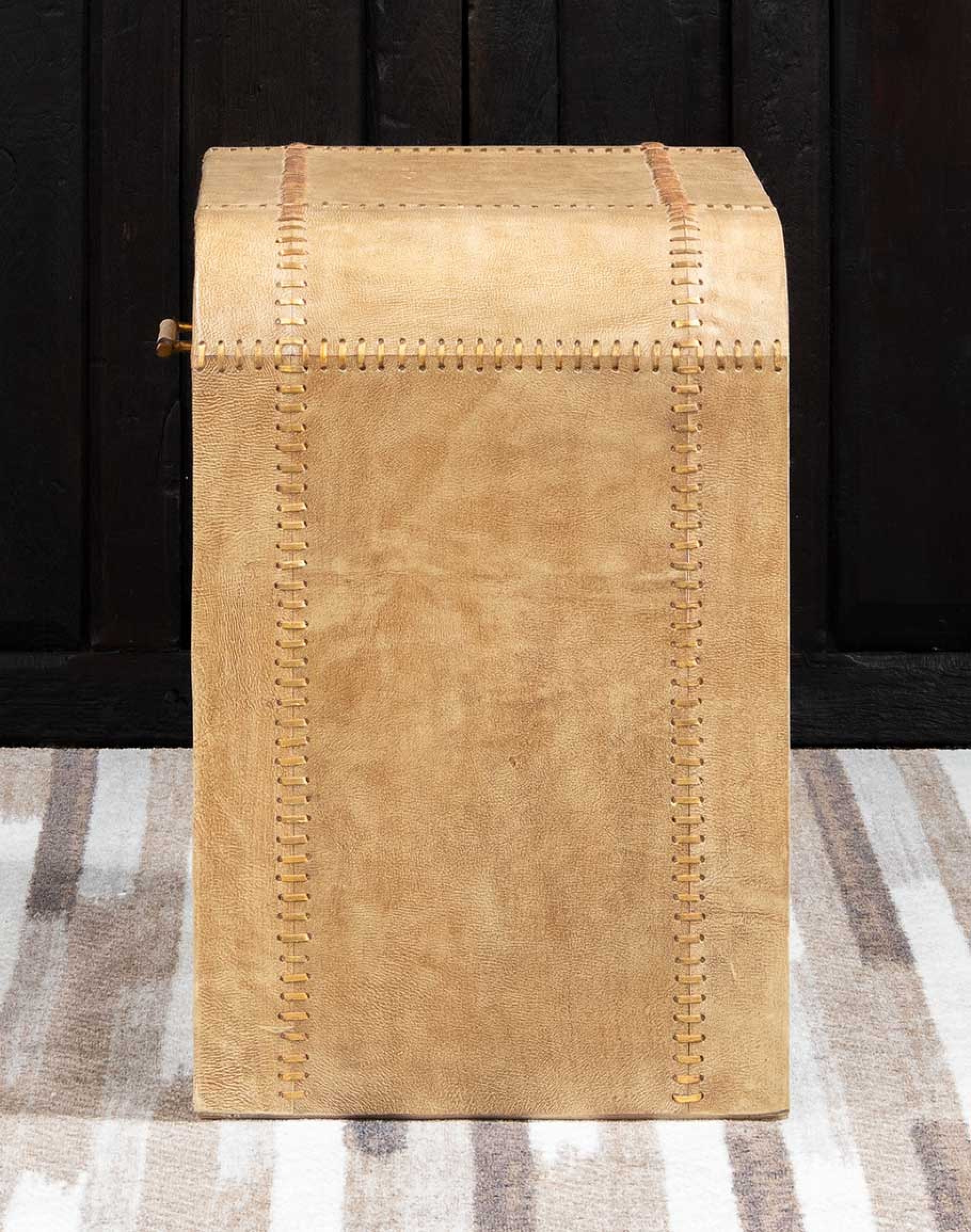 Elevate your bedroom décor with the Sonora Sand Leather Nightstand, a seamless blend of functionality and artisanal craftsmanship. This expertly designed piece is crafted from solid wood and fully wrapped in premium South American full-grain saddle leather in a rich, hand-dyed palomino color. The nightstand features contrasting leather laces handwoven in a stitch pattern that highlights its meticulous detailing and sophisticated style.