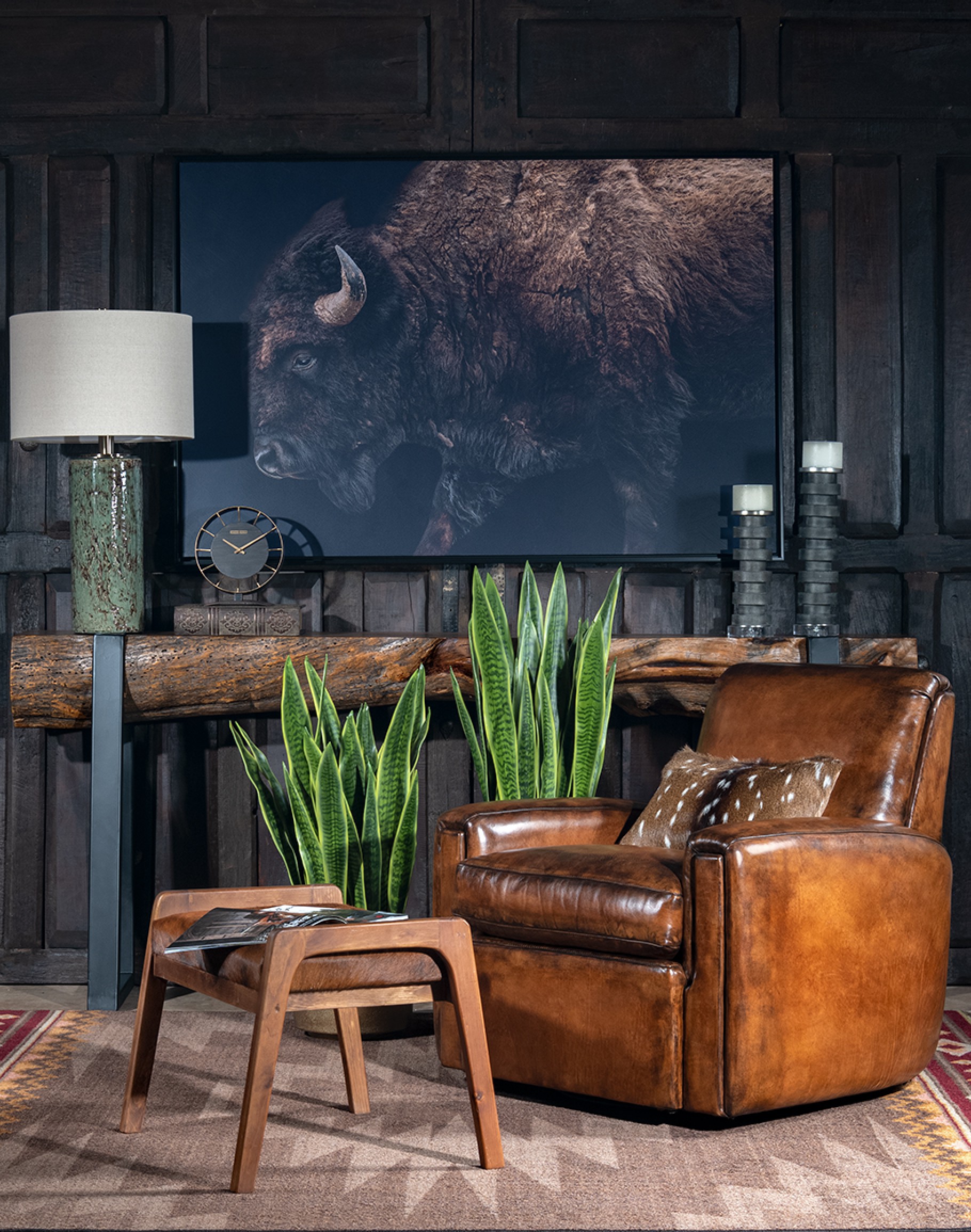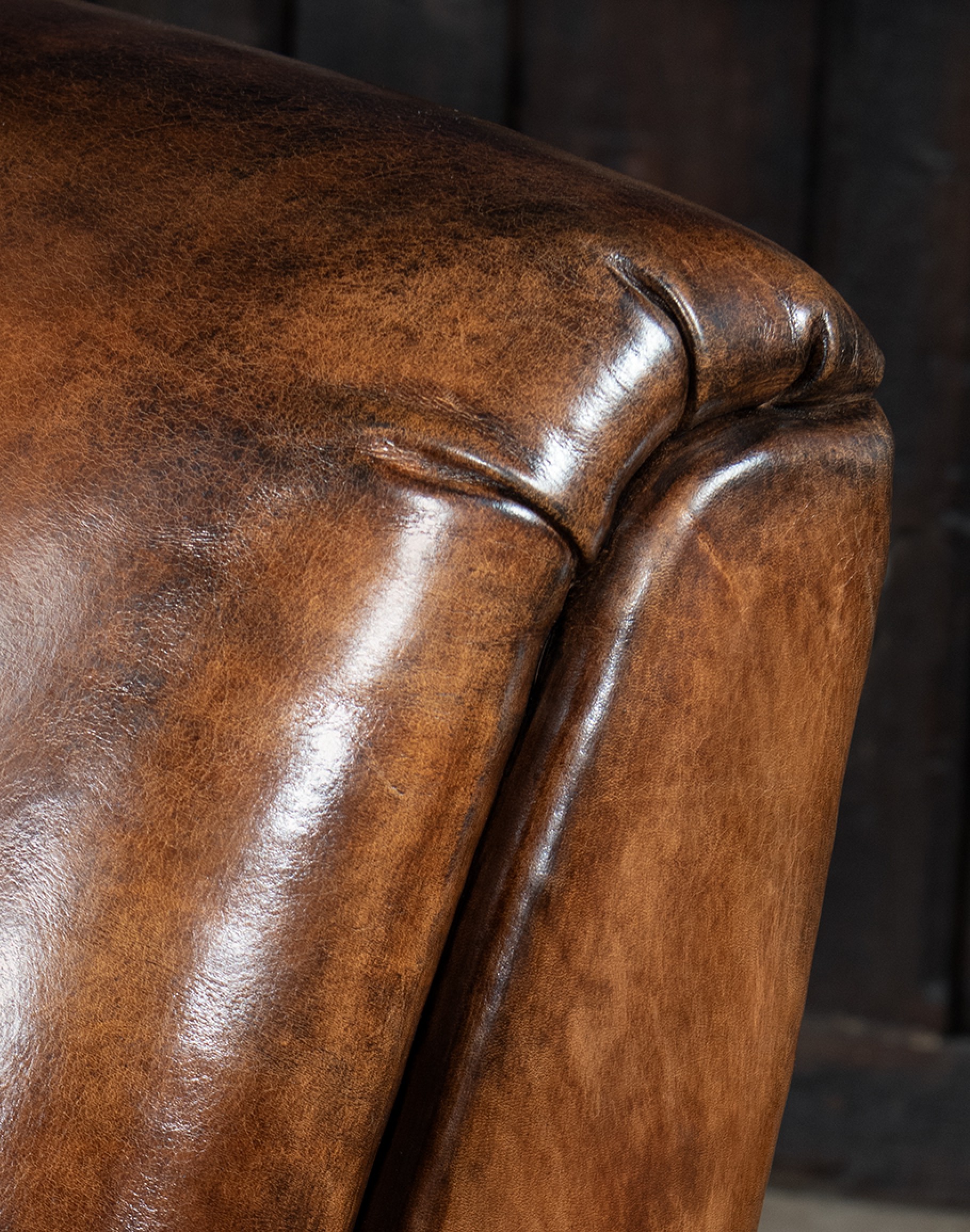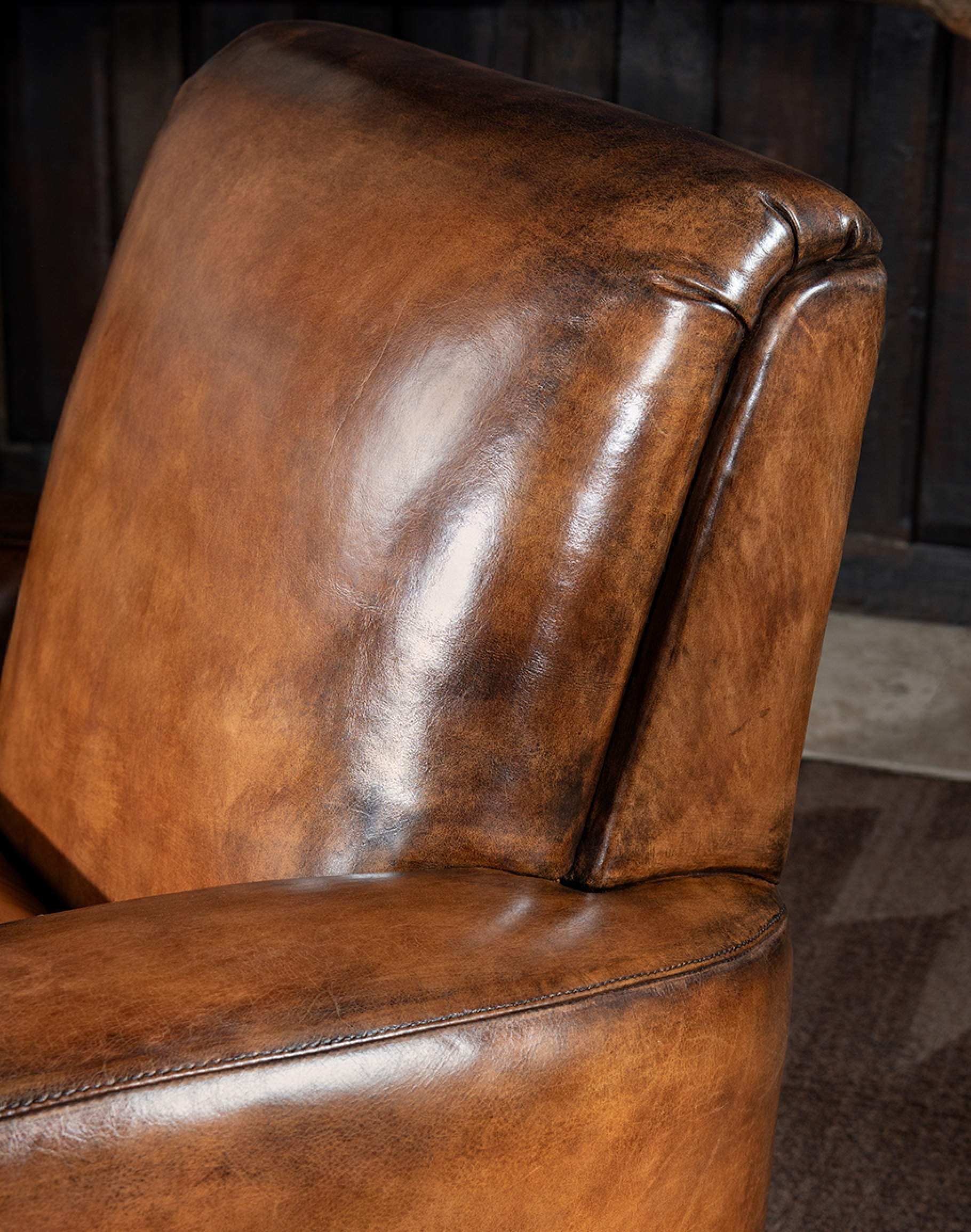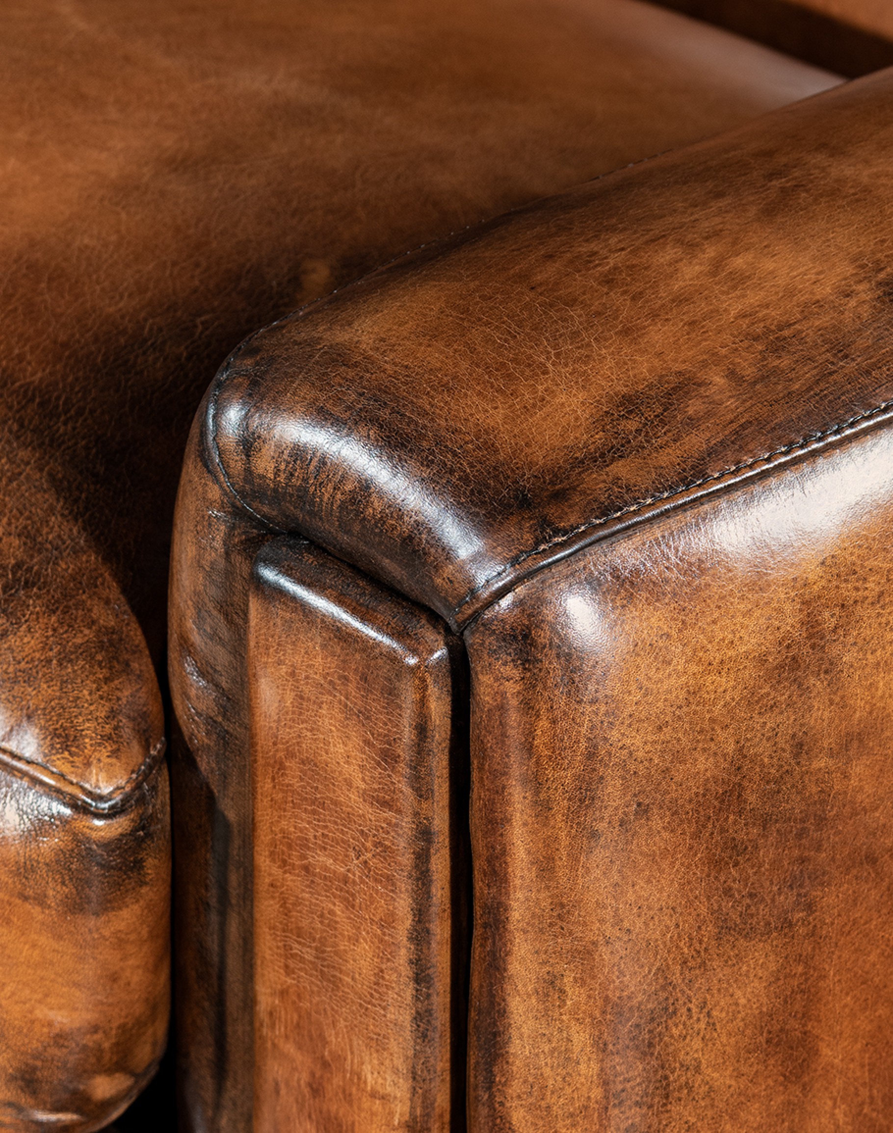 Leather Description: Artisan Leathers beautifully evoke this time worn quality, unique to every individual piece, like the originals. To pure aniline leather crusts, already fully and carefully upholstered to the piece, a base color is created with multiple applications of waxes and oils, hand-worked by the leather Artisan. After drying, this craftsman then carefully builds-up the finish with an expert’s eye, and touch, to achieve an aged patina in just the right places to reflect the aged qualities only time, wear, and frequent care could have accomplished naturally.