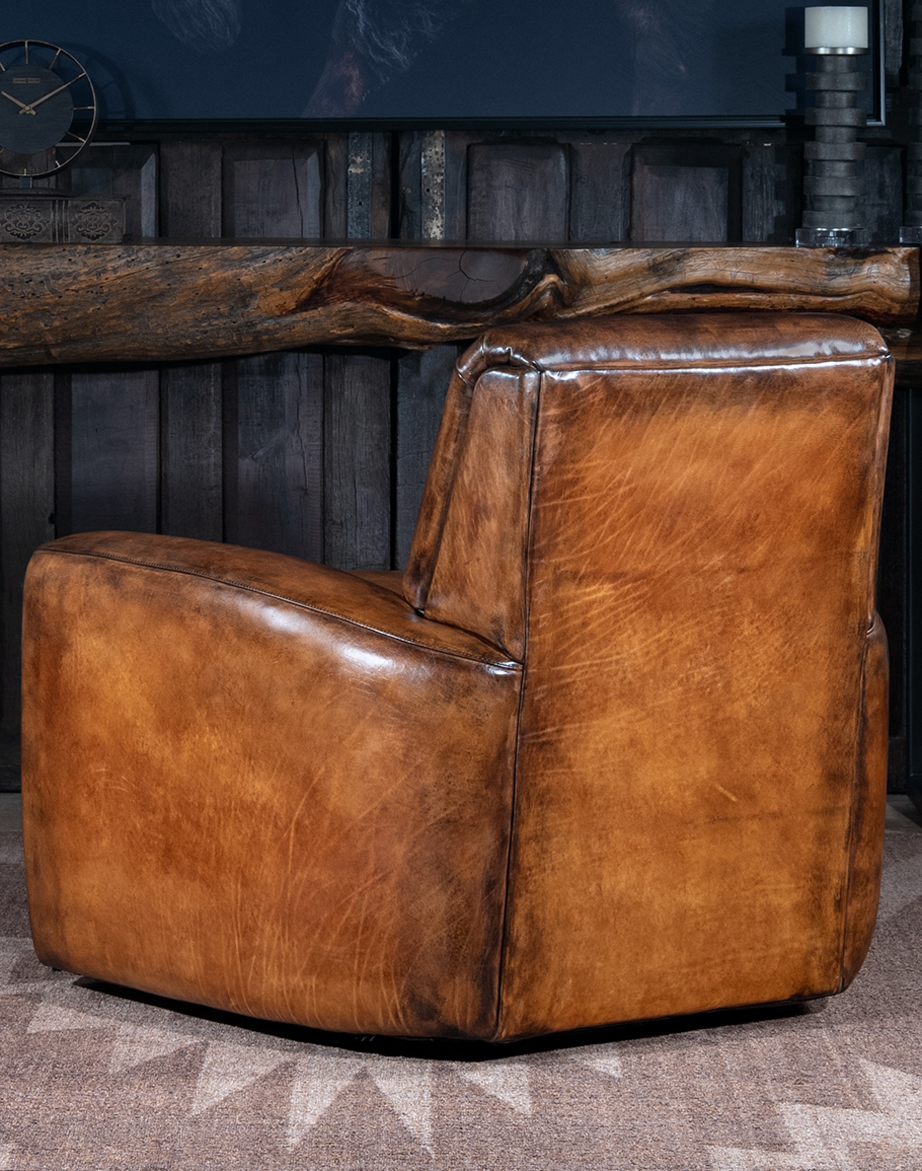Wrapped in opulent, thick full-grain leather, the Speakeasy Swivel Chair exudes luxury. Each chair is unique, featuring hand burnished leather accents that add individual character and sophisticated appeal. Not just a chair, the Speakeasy is an investment in quality, guaranteed by the full-grain leather - the highest quality leather available.